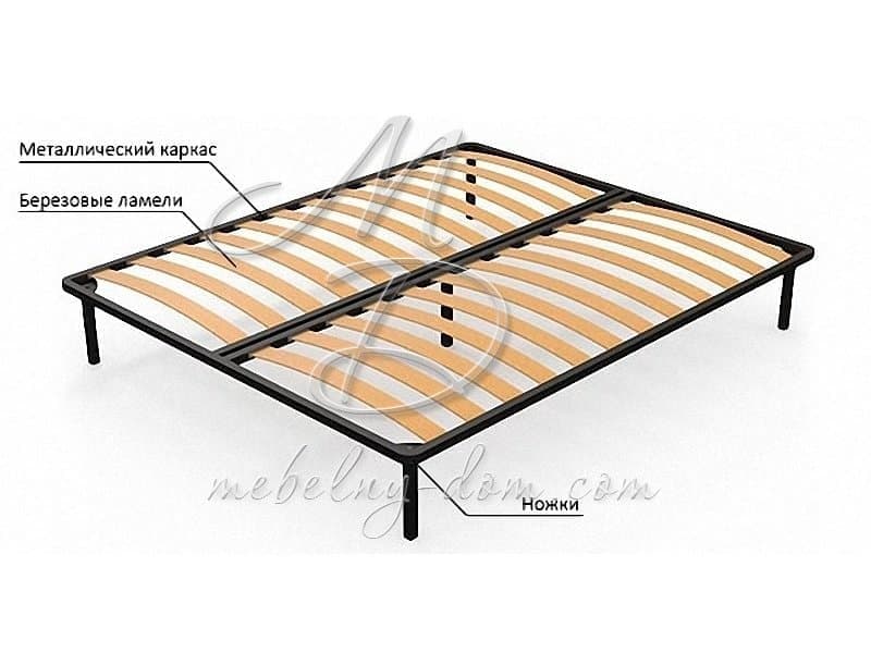Кроватное основание изготовлено из усиленного стального профиля квадратного сечения 30x30 мм. Укомплектовано широкими березовыми ламелями шириной 68 мм. Расстояние между ламелями составляет 68 мм. В основании установлено 5 ножек, что делает его прочным и долговечным.