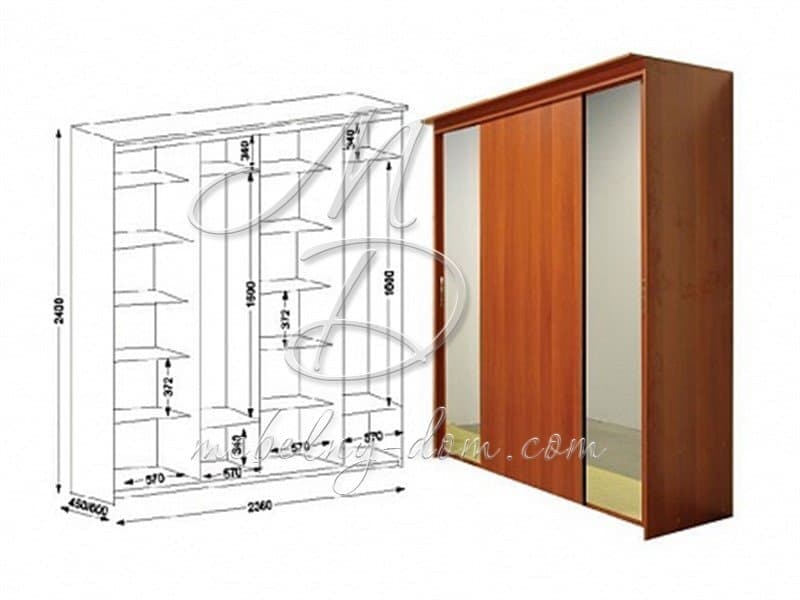 При заказе варианта с штангой посередине, ширина шкафа составит 207,4 см. При заказе второго варианта – штанга и полки, ширина шкафа составит 236 см. Глубина и высота на выбор вне зависимости от варианта наполнения шкафа. Примечание.