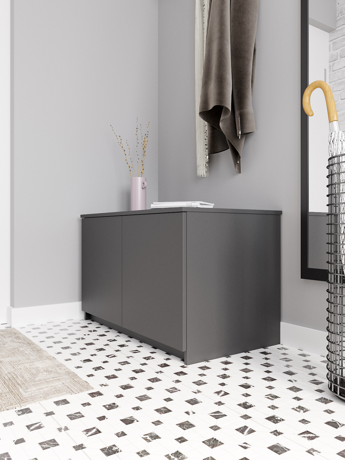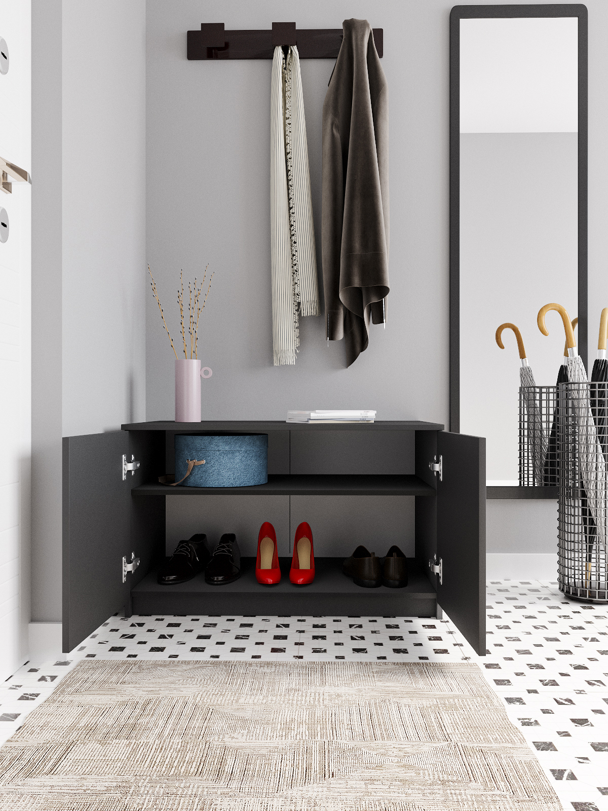 Антресоль Мори имеет двухдверную конструкцию, что делает ее удобной в использовании. Она не имеет лицевой фурнитуры на дверях, широкие створки помогают создать эффект большего пространства внутри шкафа.