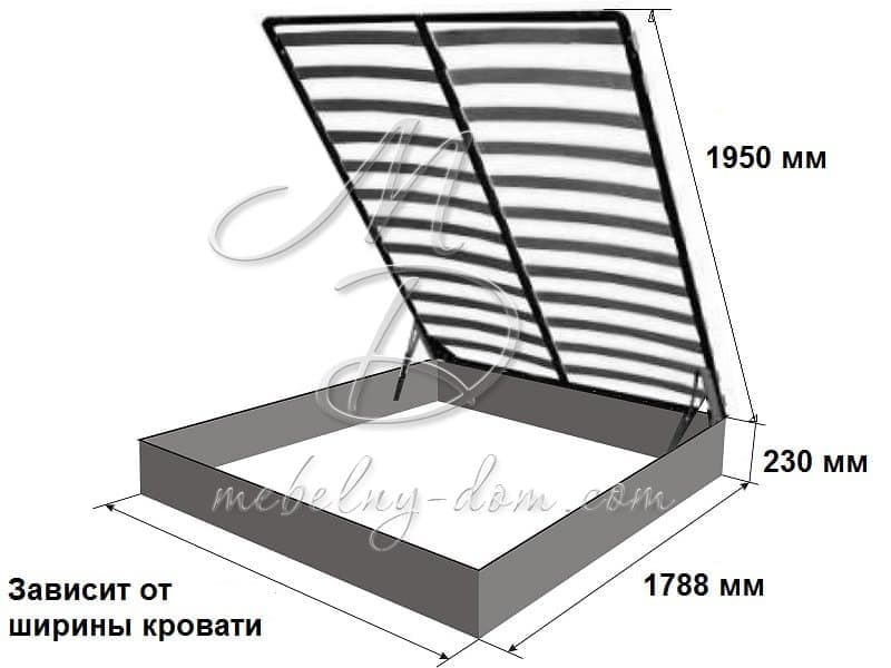 В  подъёмном механизме используются надежные немецкие газовые пружины с усилием от 300 до 900 N в зависимости от размеров и массы матраса, что позволяет при минимальном усилии поднимать и опускать основание вместе с матрасом для удобного доступа к бельевому ящику.
