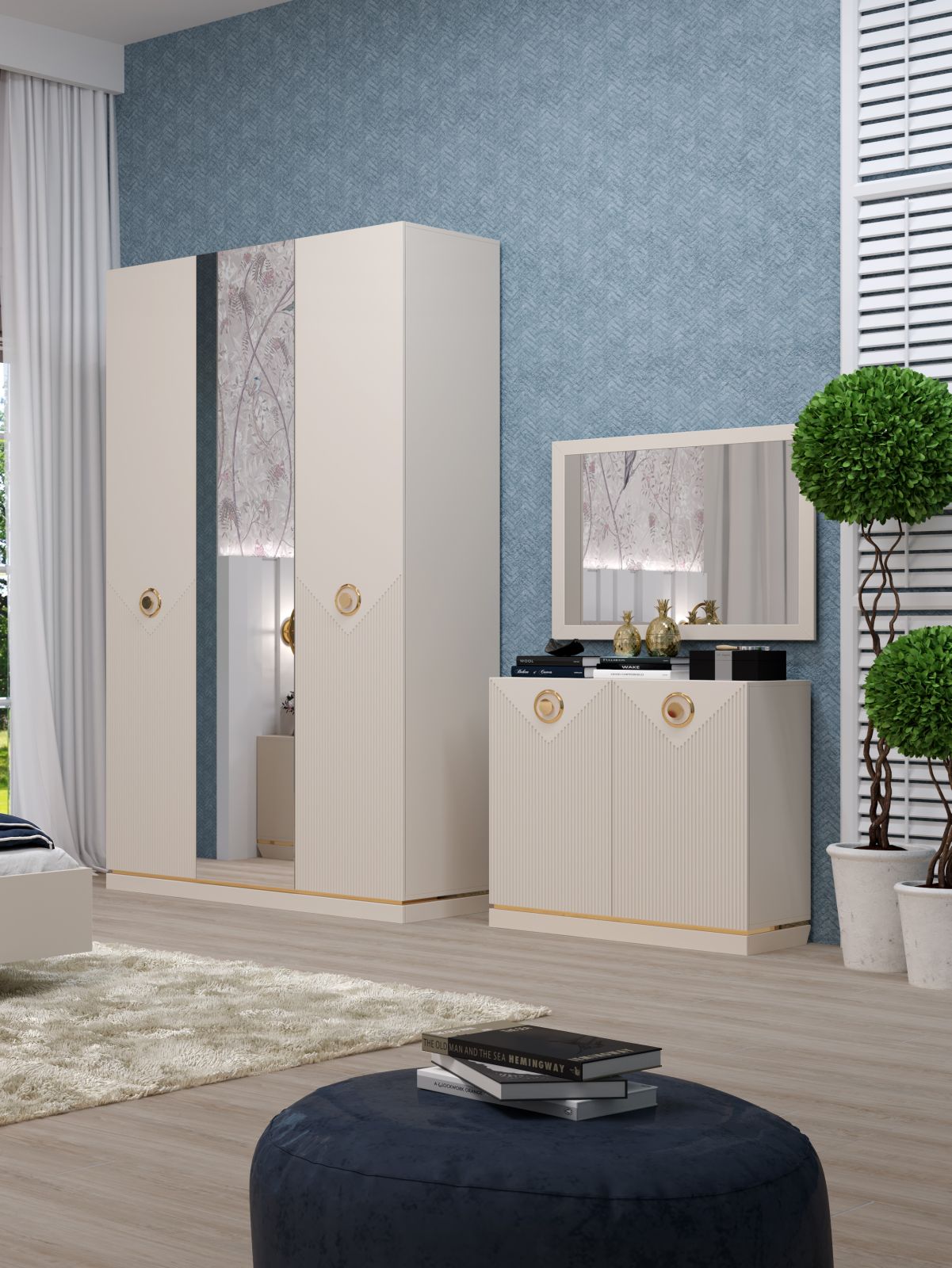 Мебель изготовлена из ЛДСП и МДФ в пленке ПВХ с очень популярной в последнее время матовой бархатистой поверхностью софт тач. Фасады имеют фрезеровку параллельными линиями, которая гармонично сочетается с эффектными яркими ручками в цвете глянцевое золото. Изделие имеет массивный цоколь , который визуально отделяют от корпуса золотая кромка.