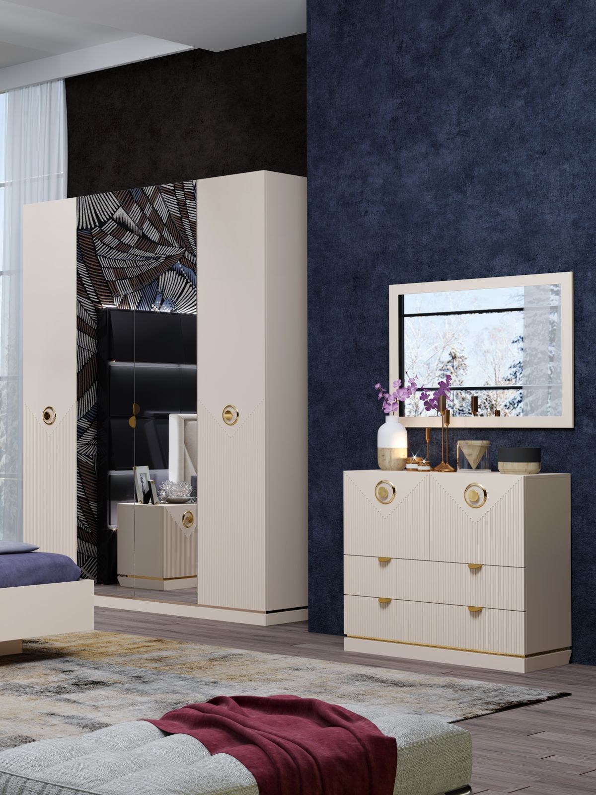 Мебель изготовлена из ЛДСП и МДФ в пленке ПВХ с очень популярной в последнее время матовой бархатистой поверхностью soft touch. Фасады имеют фрезеровку параллельными линиями, которая гармонично сочетается с эффектными яркими ручками в цвете глянцевое золото. Изделие имеет массивный цоколь, который визуально отделяют от корпуса золотая кромка.
