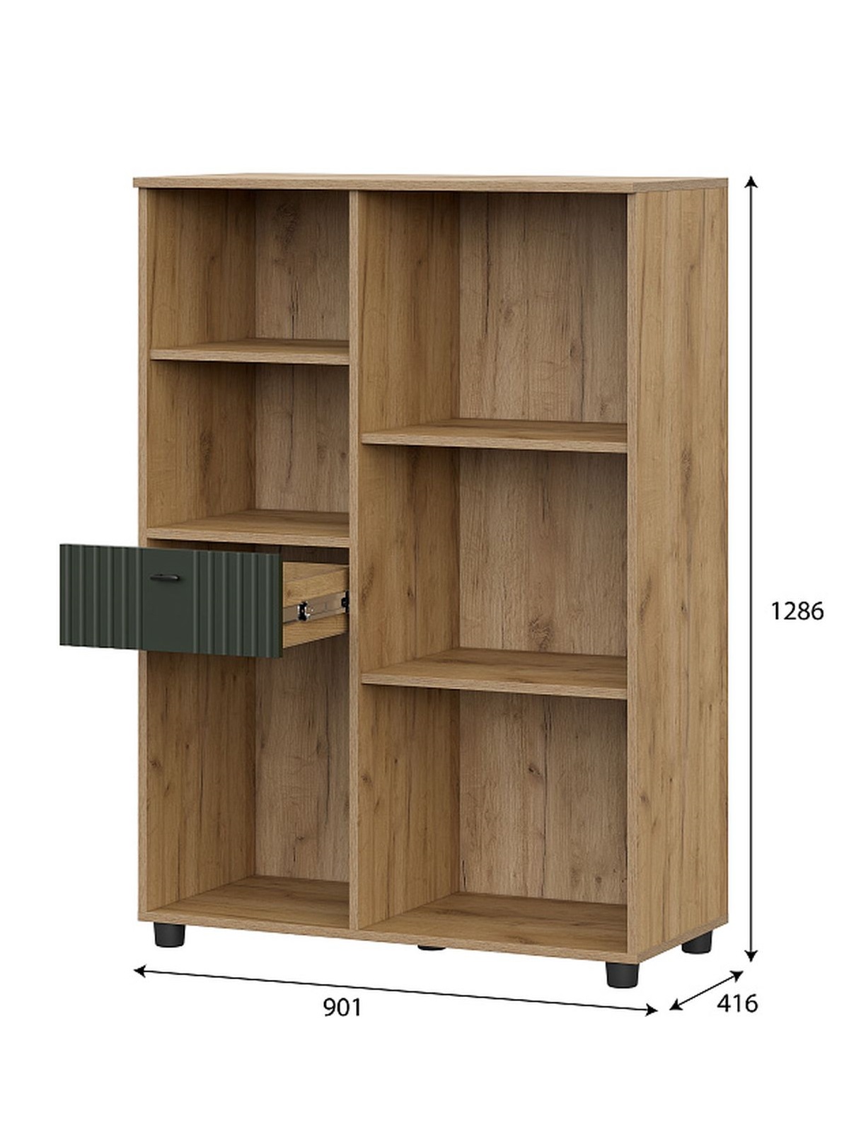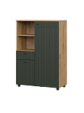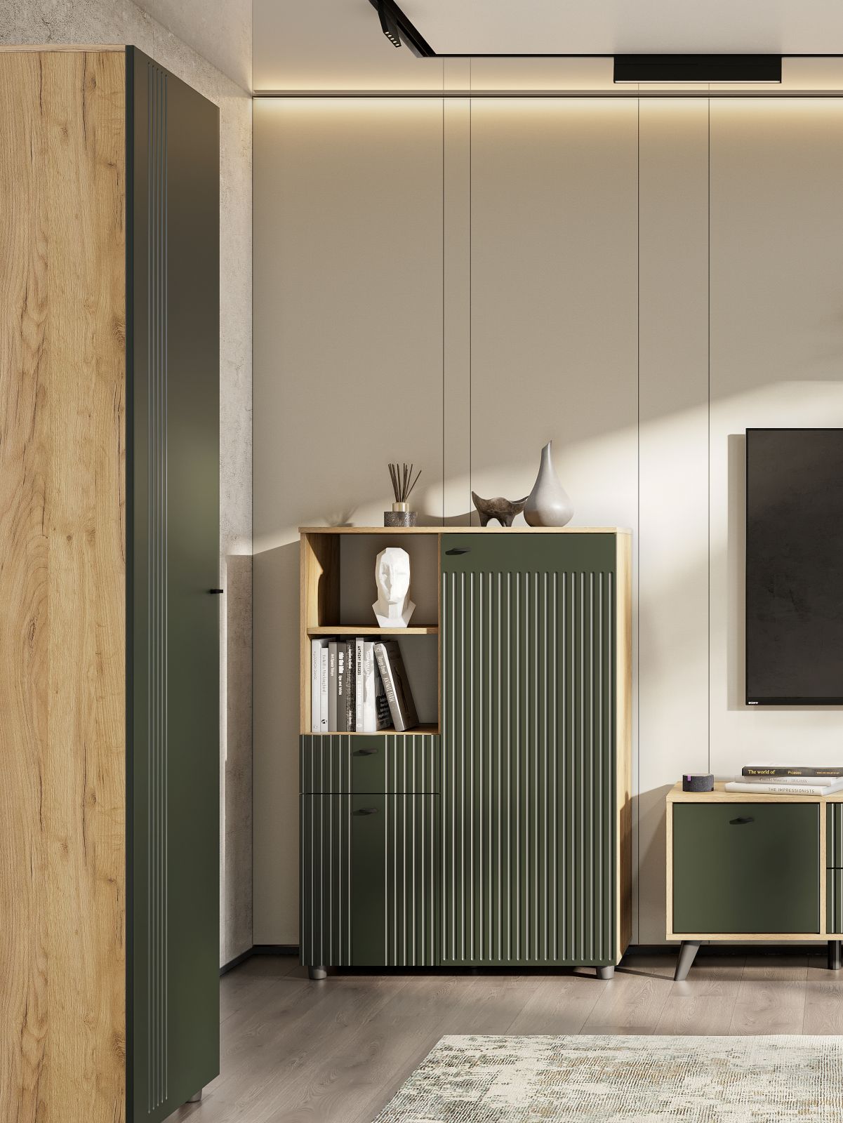 Купить современный комод вы можете в двух исполнениях: корпус дуб крафт золотой + фасады МДФ белого матового цвета и дуб крафт золотой + фасады МДФ, цвета Олива. Внутреннее наполнение комода представлено одной секцией, выдвижным ящиком и створкой, для хранения вещей. Достоинством комода является наличие петель с доводчиком для плавного и бесшумного закрывания дверок.