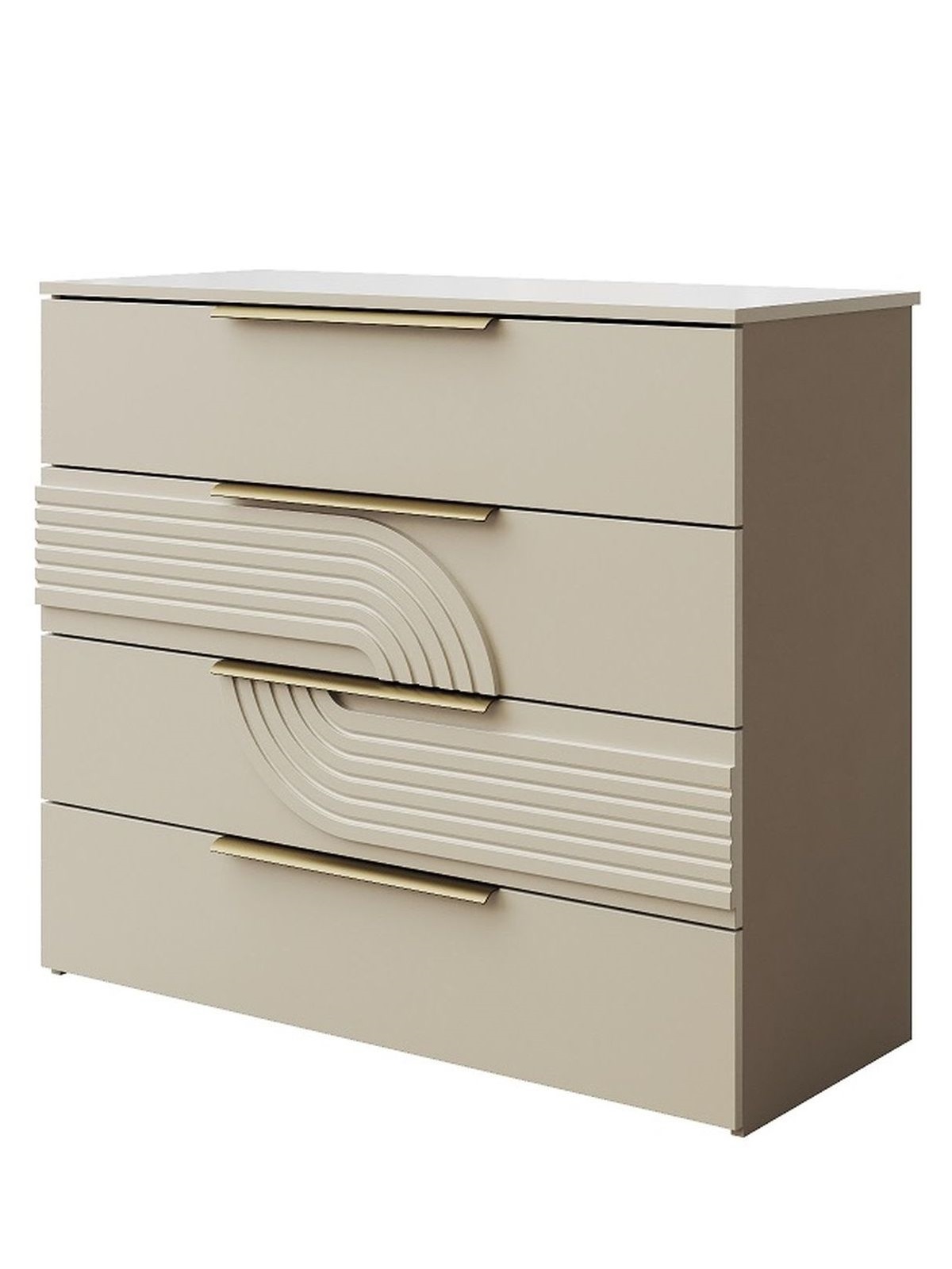 Комод для одежды и белья, в спальню «Монтиз» 4я КМК 1003.3, каркас изготовлен из ЛДСП цвета шадэ песочный, фасады из МДФ цвета персидский жемчуг. Комод с четырьмя наружными выдвижными ящиками, установленные на направляющие скрытого монтажа с доводчиками.