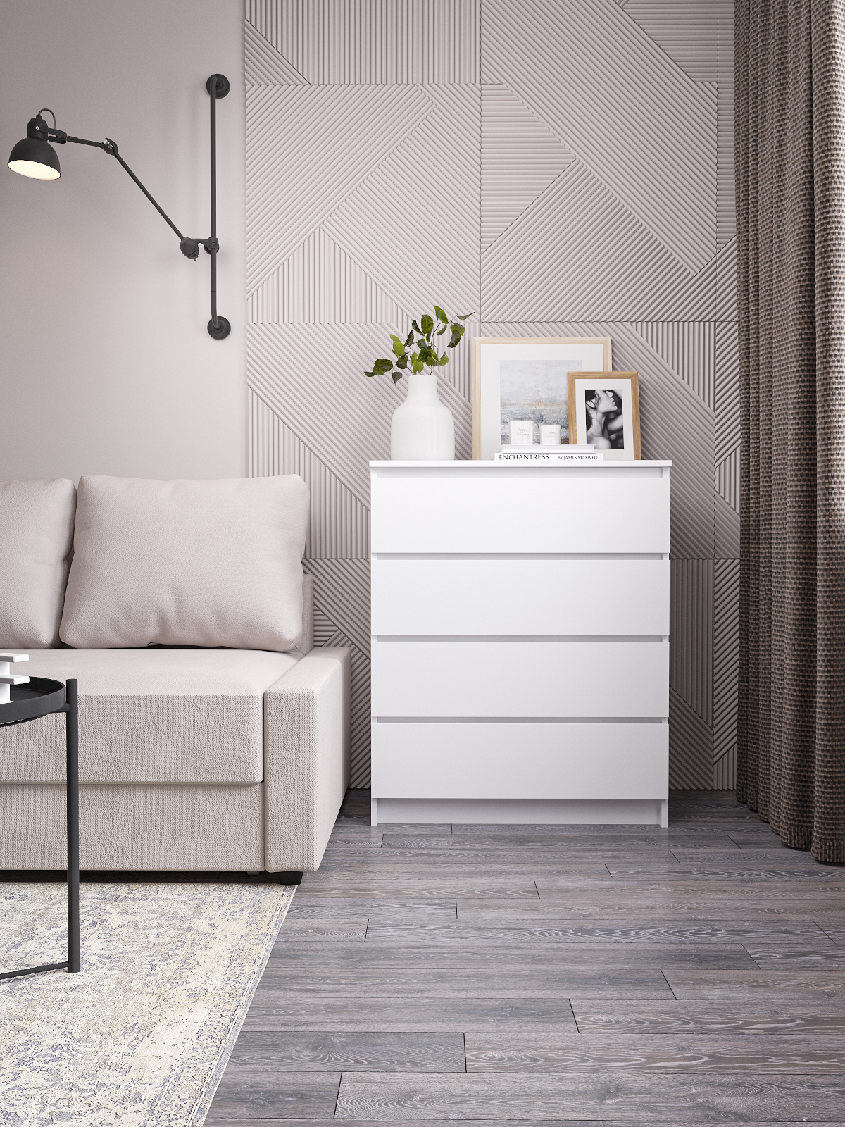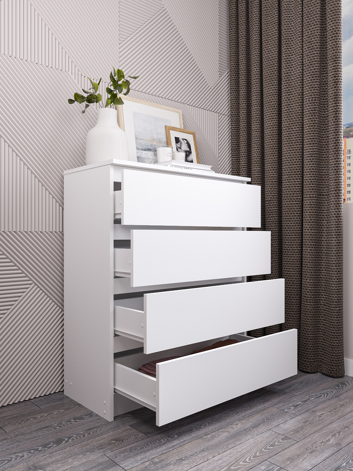 Комод для одежды и вещей Мори - это идеальное решение для тех, кто хочет создать удобную и функциональную систему хранения в своей спальне. Этот современный комод с 4 ящиками предназначен для хранения белья, одежды и других вещей, что делает его незаменимым аксессуаром для любого дома.