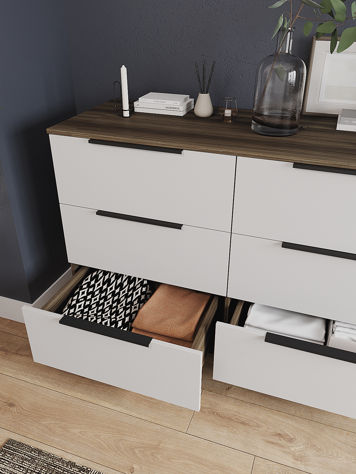 Комод имеет шесть выдвижных ящиков, которые обеспечивают достаточно места для хранения различных вещей. Фасады ящиков выполнены из МДФ, что обеспечивает прочность и долговечность. Фурнитура скрытого монтажа с доводчиками гарантирует плавное закрывание ящиков, что предотвращает повреждение фурнитуры и сохраняет их внешний вид на долгое время. Металлические ножки высотой 12 см. в количестве пяти штук обеспечивают равномерную нагрузку на поверхность пола и дополнительную устойчивость.