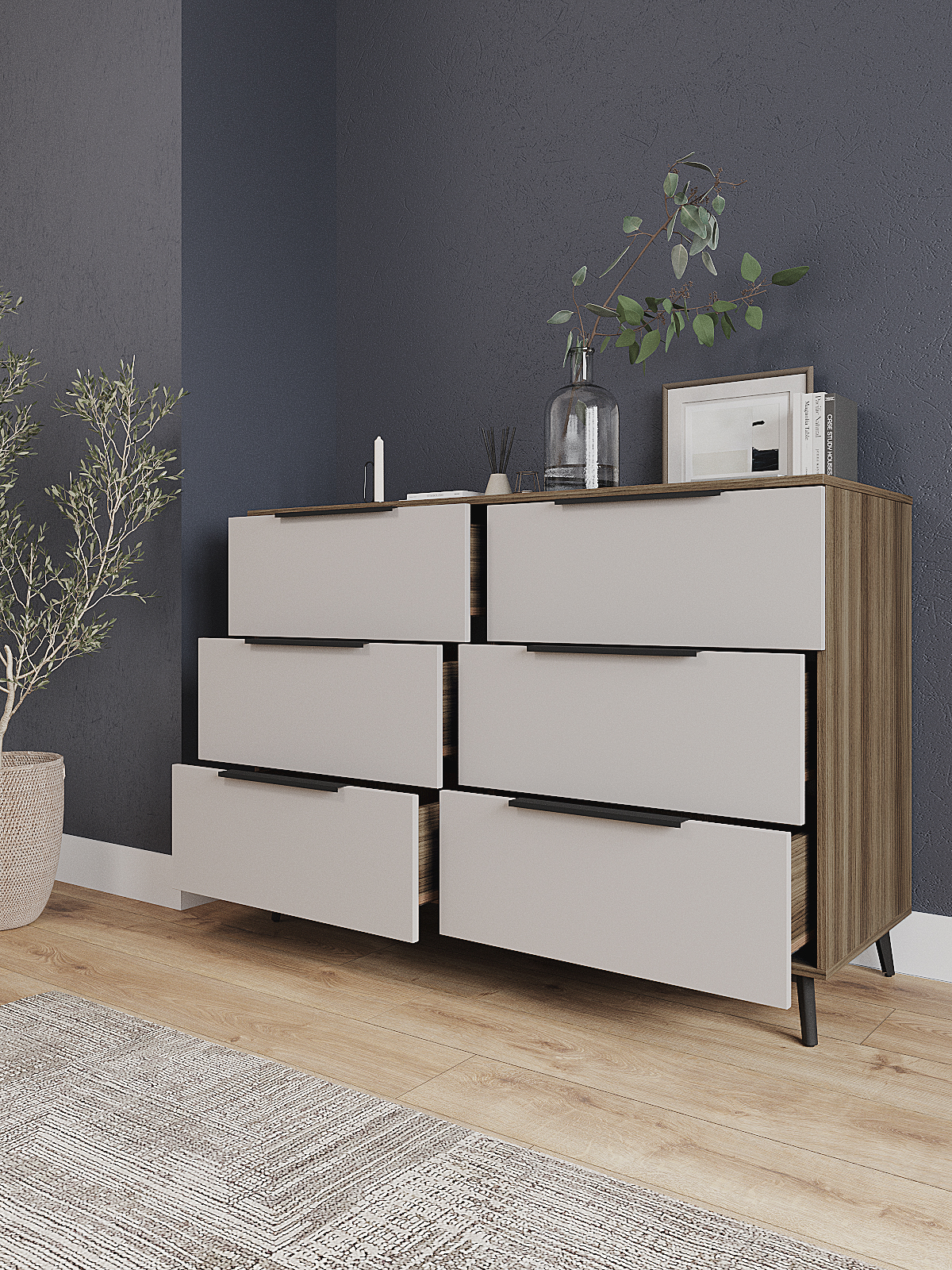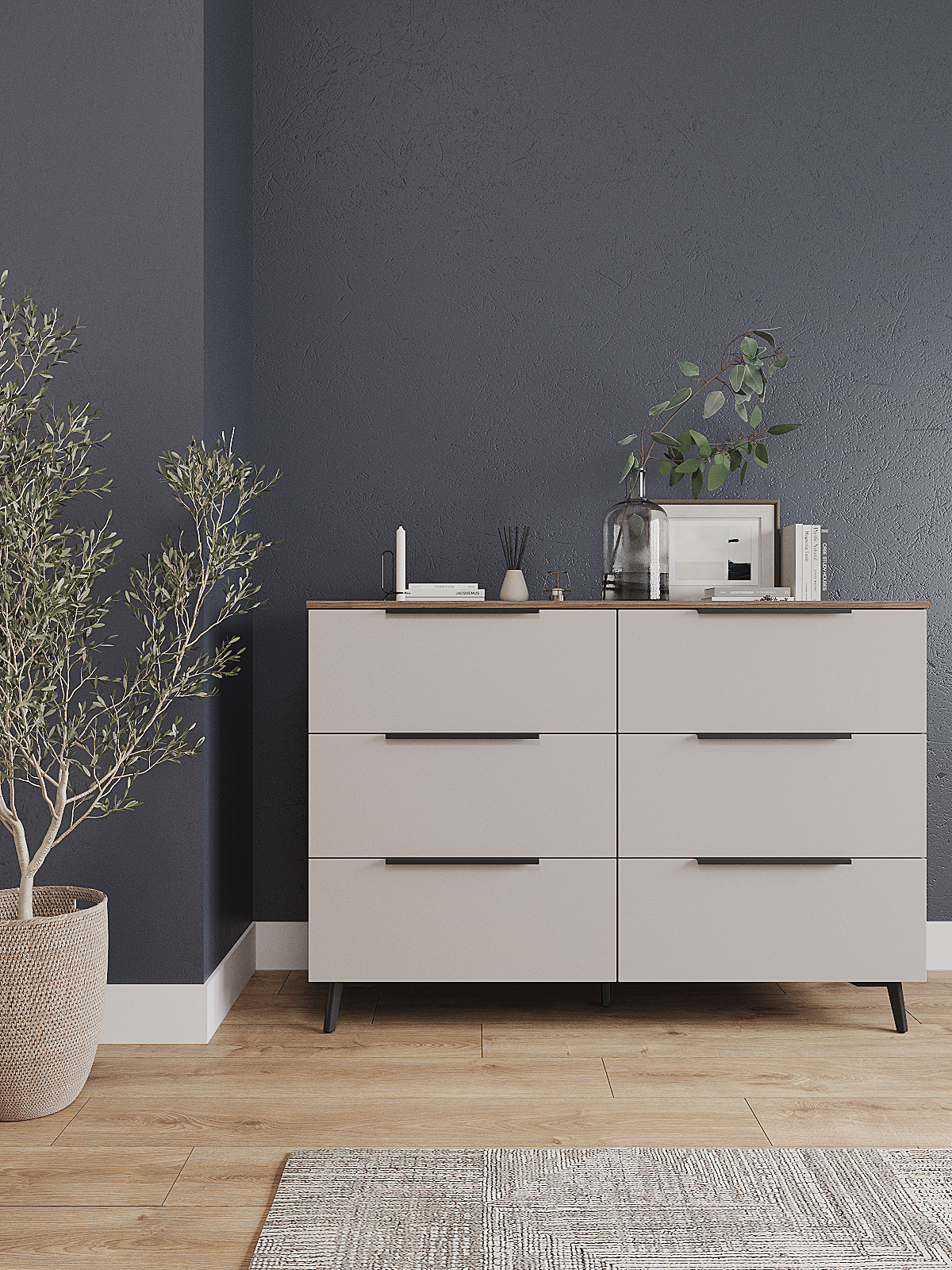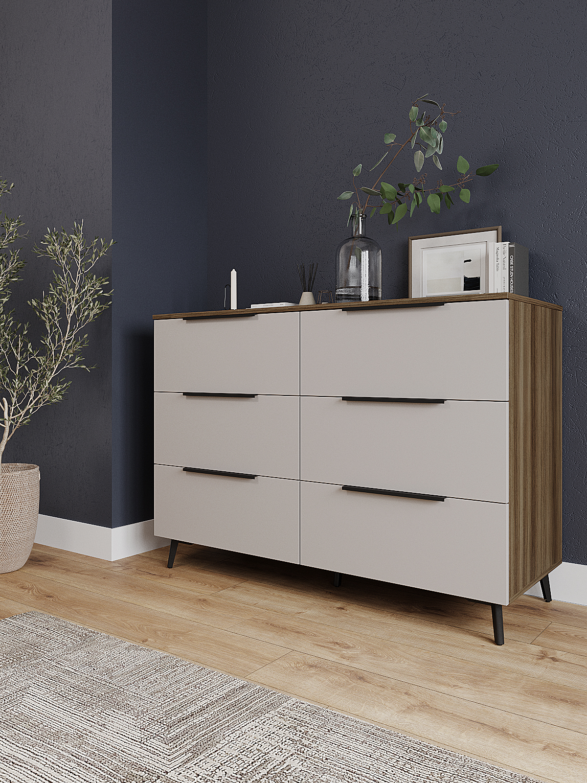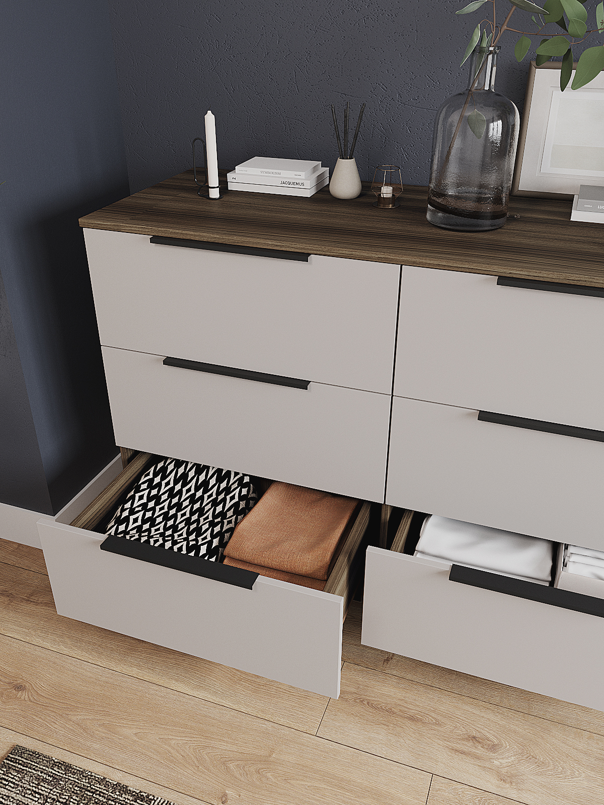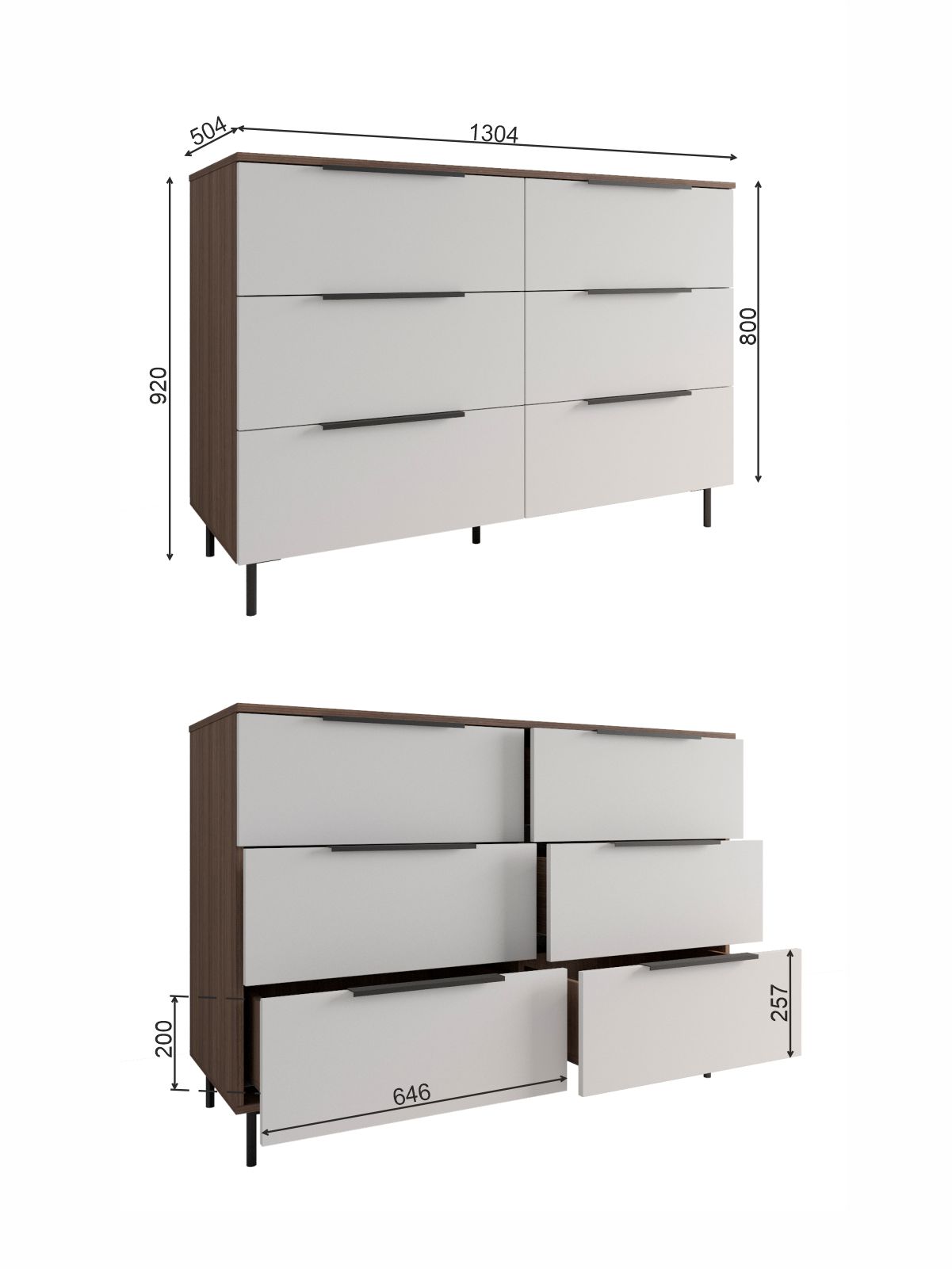Комод имеет шесть выдвижных ящиков, которые обеспечивают достаточно места для хранения различных вещей. Фасады ящиков выполнены из МДФ, что обеспечивает прочность и долговечность. Фурнитура скрытого монтажа с доводчиками гарантирует плавное закрывание ящиков, что предотвращает повреждение фурнитуры и сохраняет их внешний вид на долгое время. Металлические ножки высотой 12 см. в количестве пяти штук обеспечивают равномерную нагрузку на поверхность пола и дополнительную устойчивость.
