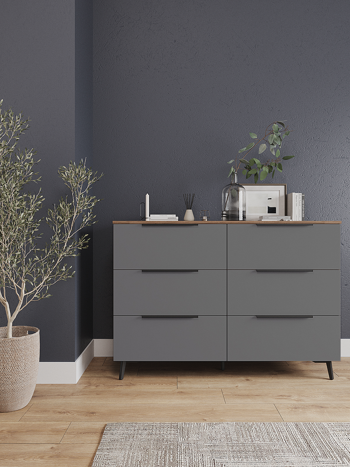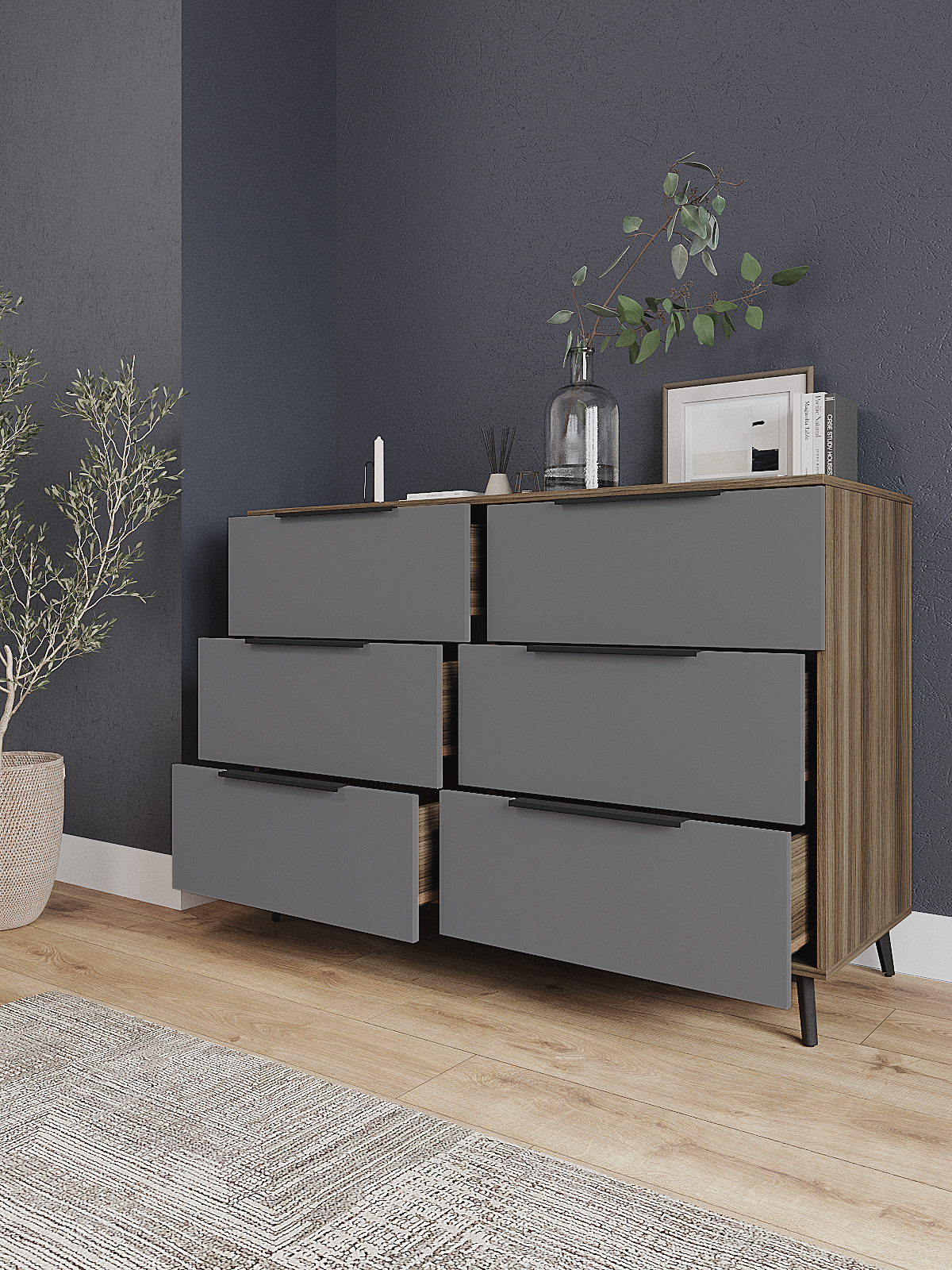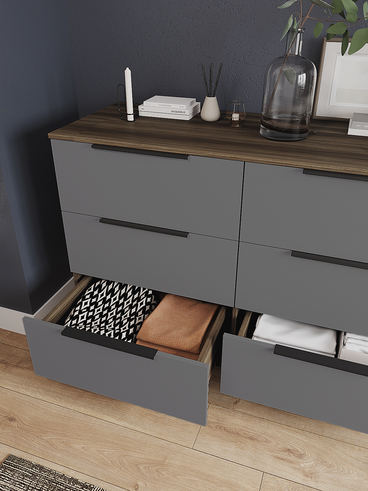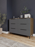Комод имеет шесть выдвижных ящиков, которые обеспечивают достаточно места для хранения различных вещей. Фасады ящиков выполнены из МДФ, что обеспечивает прочность и долговечность. Фурнитура скрытого монтажа с доводчиками гарантирует плавное закрывание ящиков, что предотвращает повреждение фурнитуры и сохраняет их внешний вид на долгое время. Металлические ножки высотой 12 см. в количестве пяти штук обеспечивают равномерную нагрузку на поверхность пола и дополнительную устойчивость.