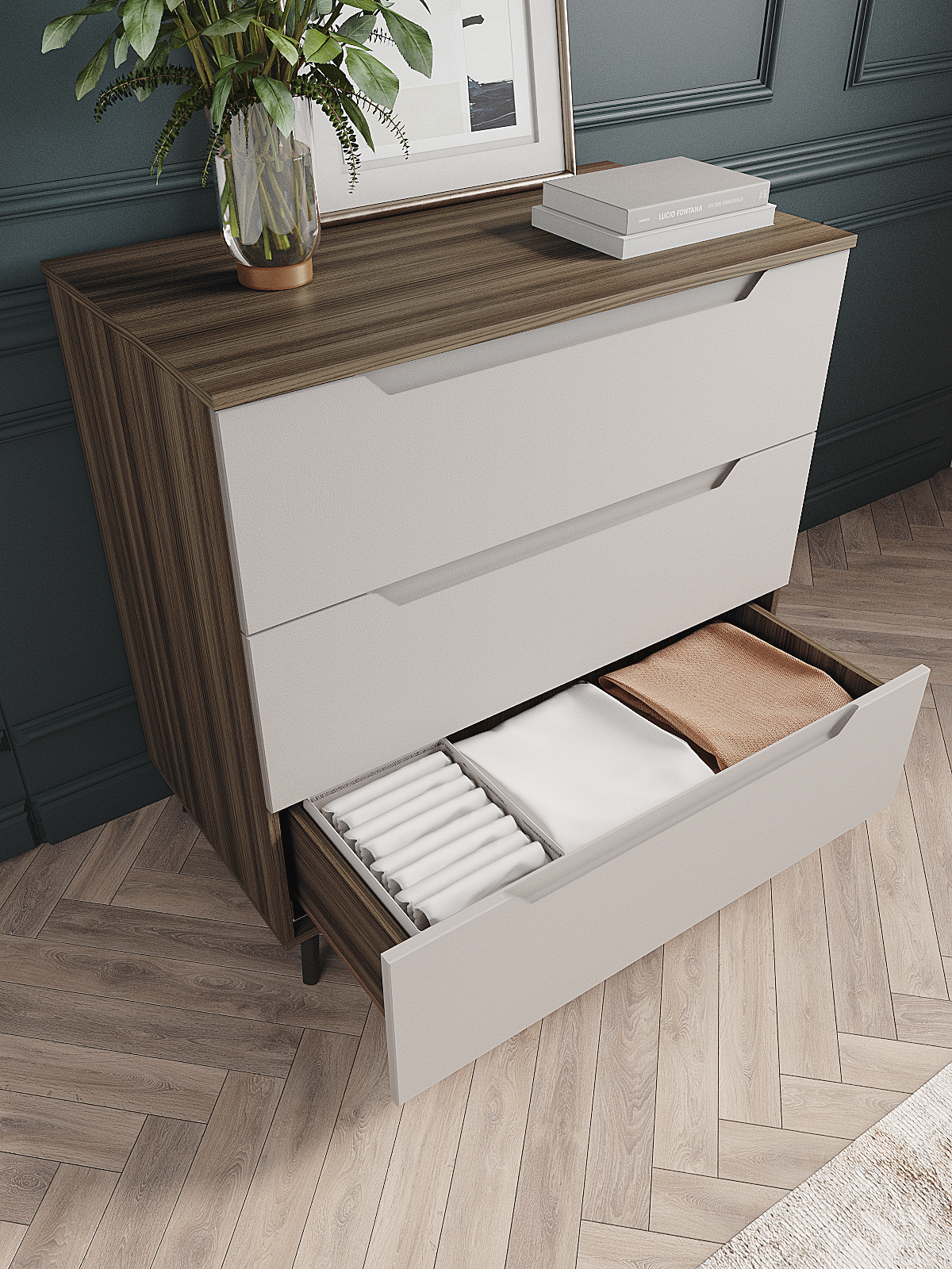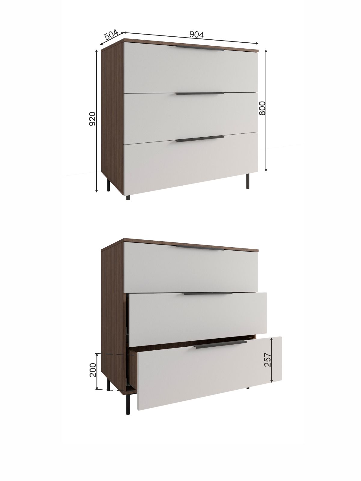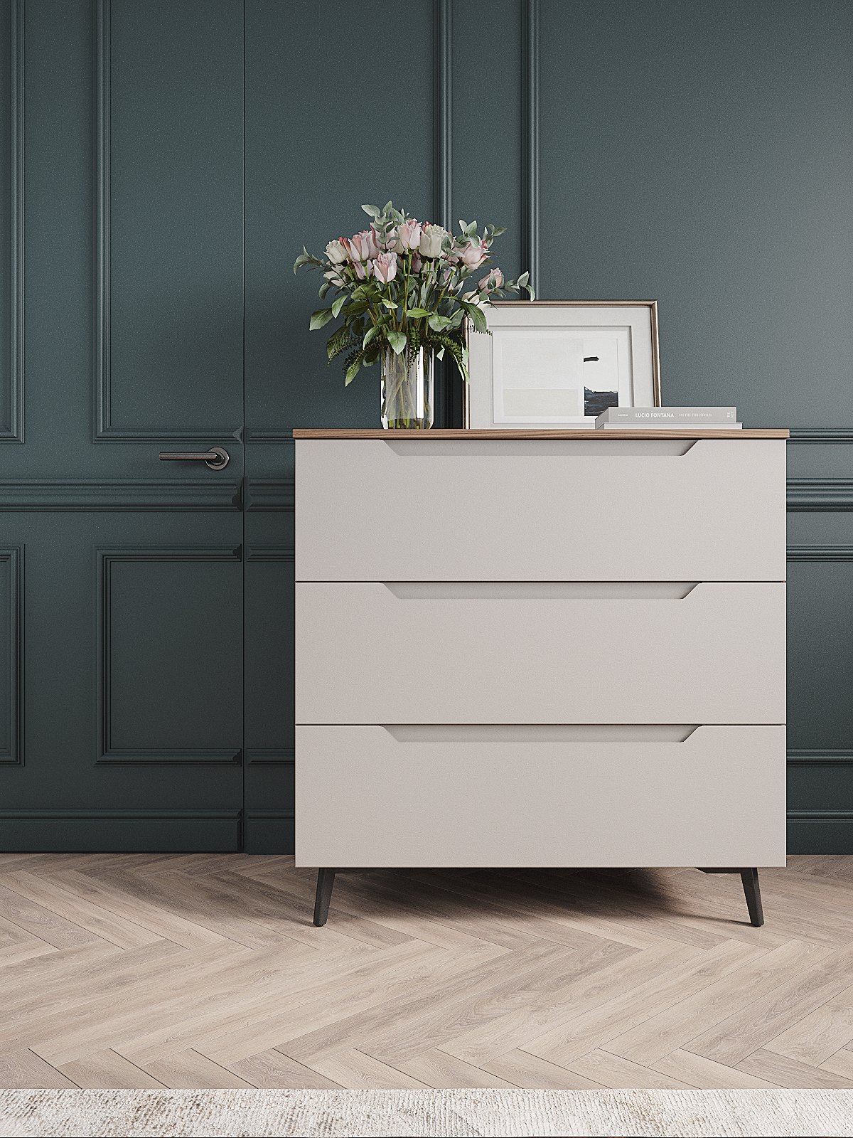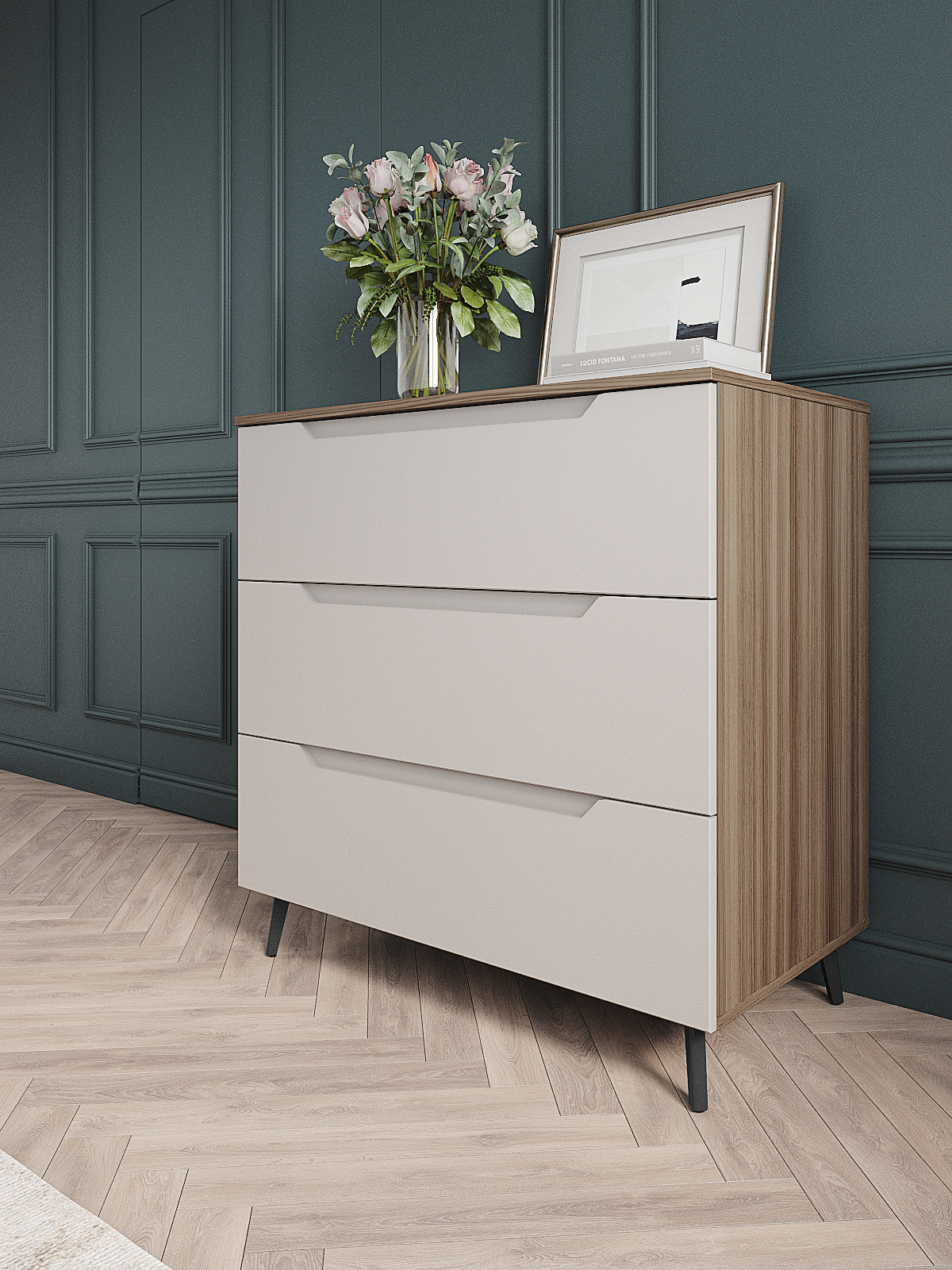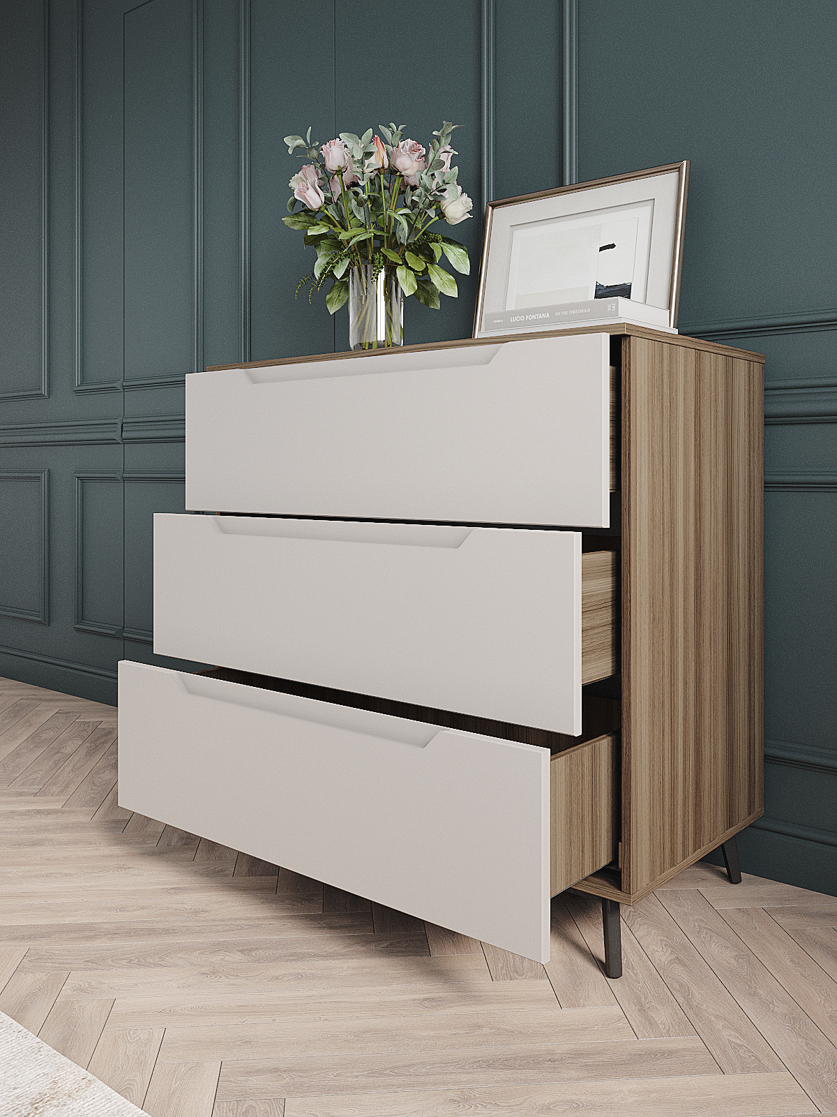 Комод оснащен тремя выдвижными ящиками, что обеспечивает достаточно места для хранения различных предметов. Для удобства использования и долговечности, фурнитура скрытого монтажа с доводчиками обеспечивает плавное и бесшумное закрывание ящиков. Кроме того, наличие металлических ножек высотой 120 мм. обеспечивает достаточно высокое расположение комода над полом, что позволяет легко убираться под ним.