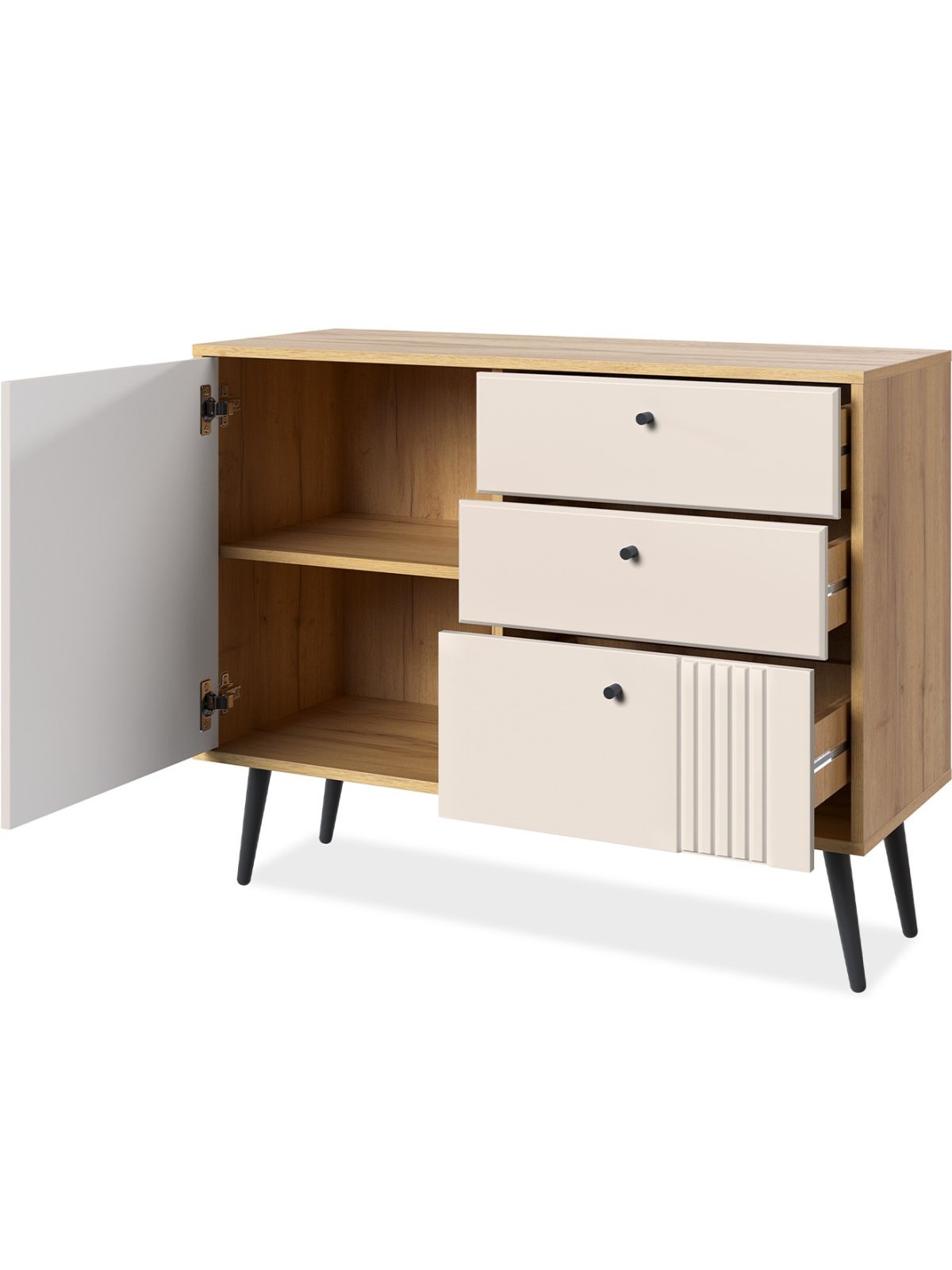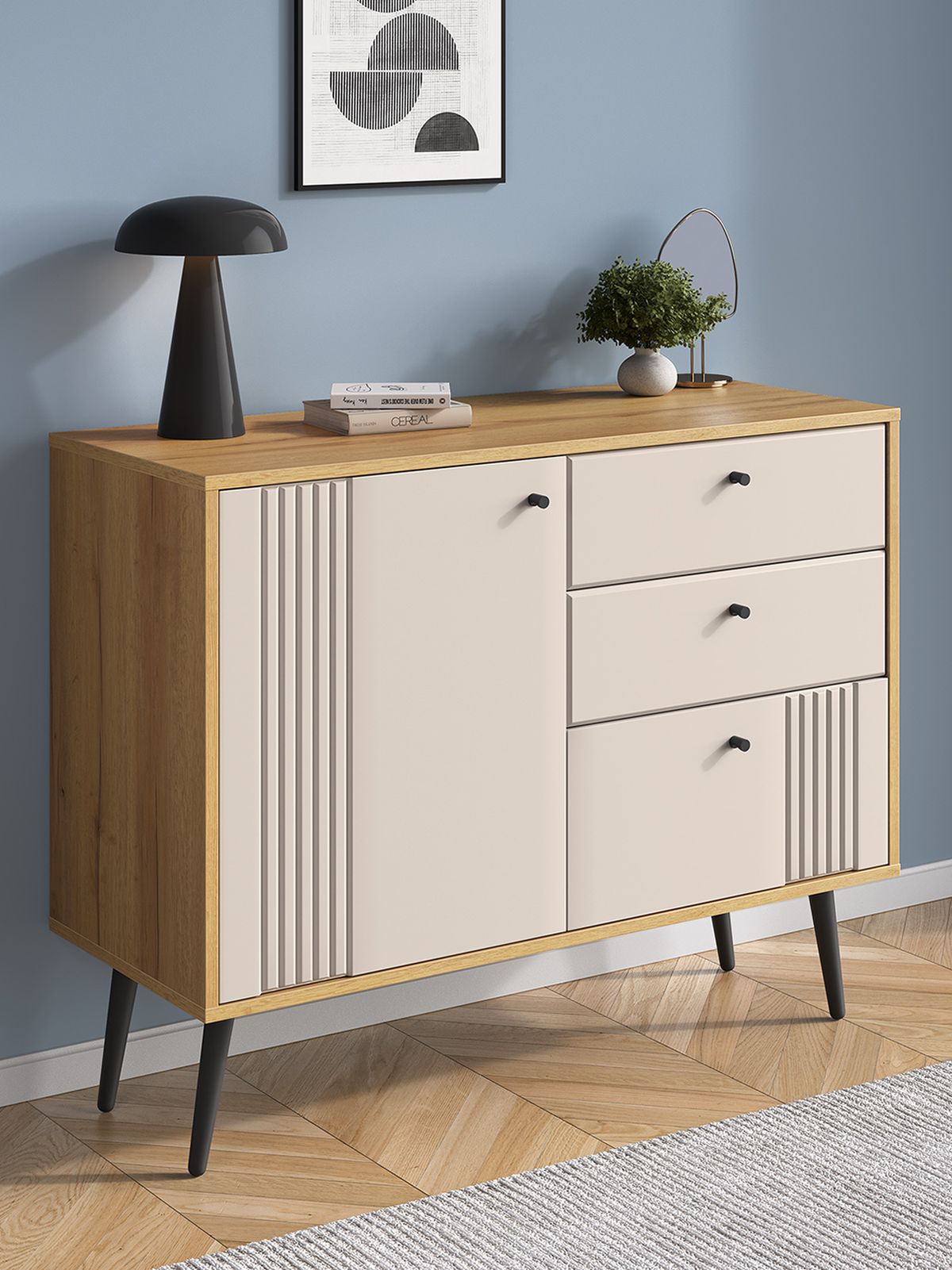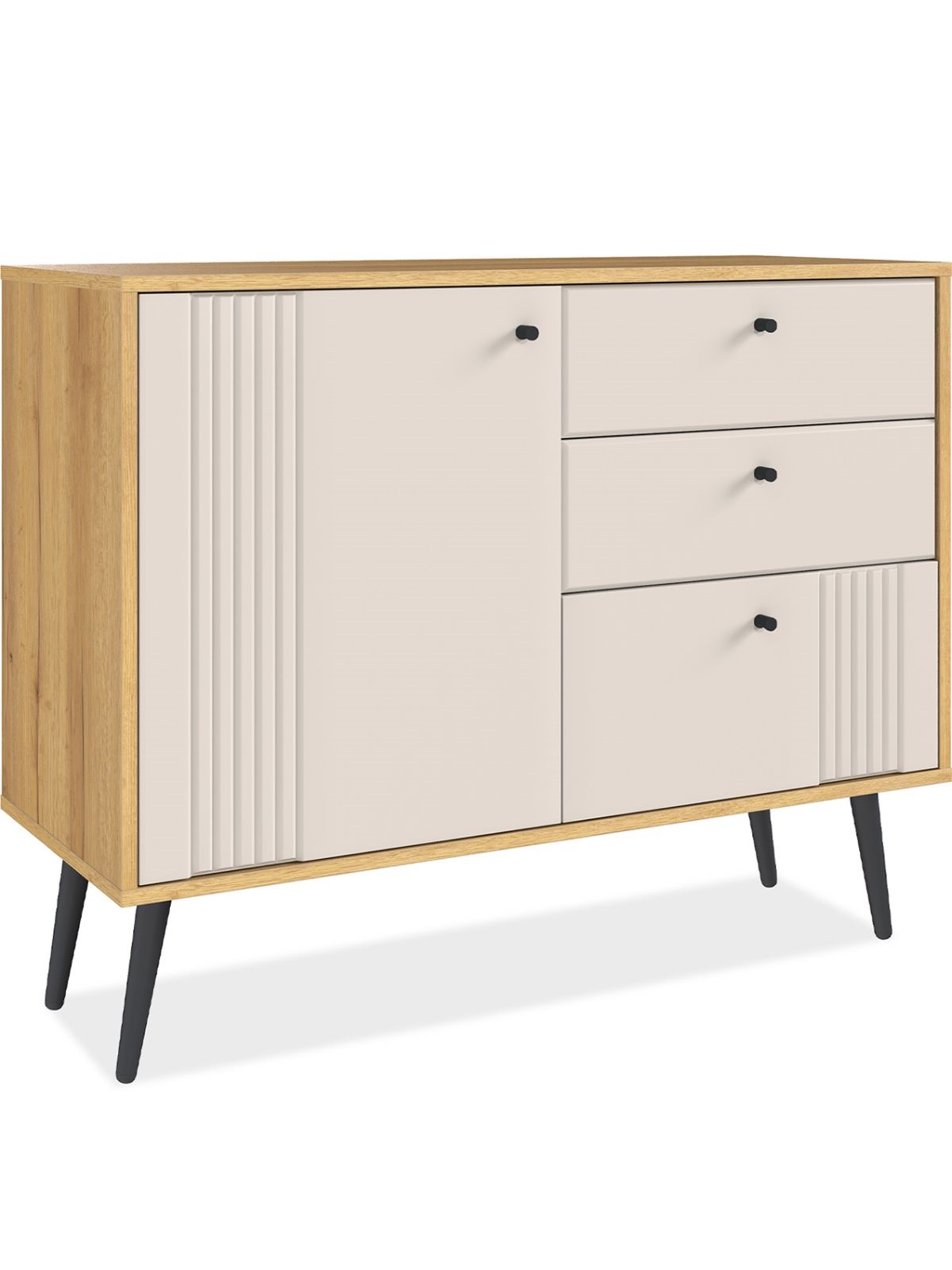 Комод на ножках Вега Саксония это стильное и функциональное решение для спальни, гостиной, прихожей или детской комнаты. Комод на ножках может быть использован не только для хранения, но и в качестве тумбы под телевизор. Комод для вещей выполнен в современном стиле, его внешний облик отличают строгие линии, сдержанный декор в виде фрезеровки фасадов и лаконичная яркая фурнитура в темном цвете.
