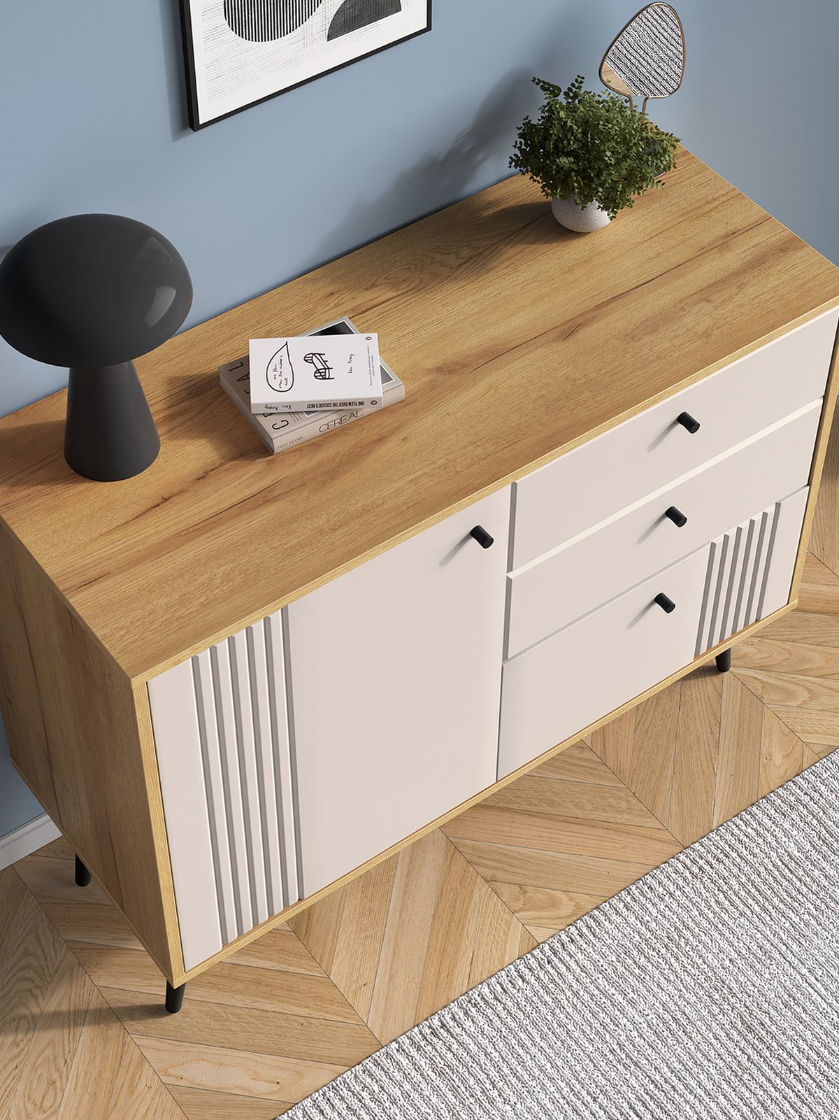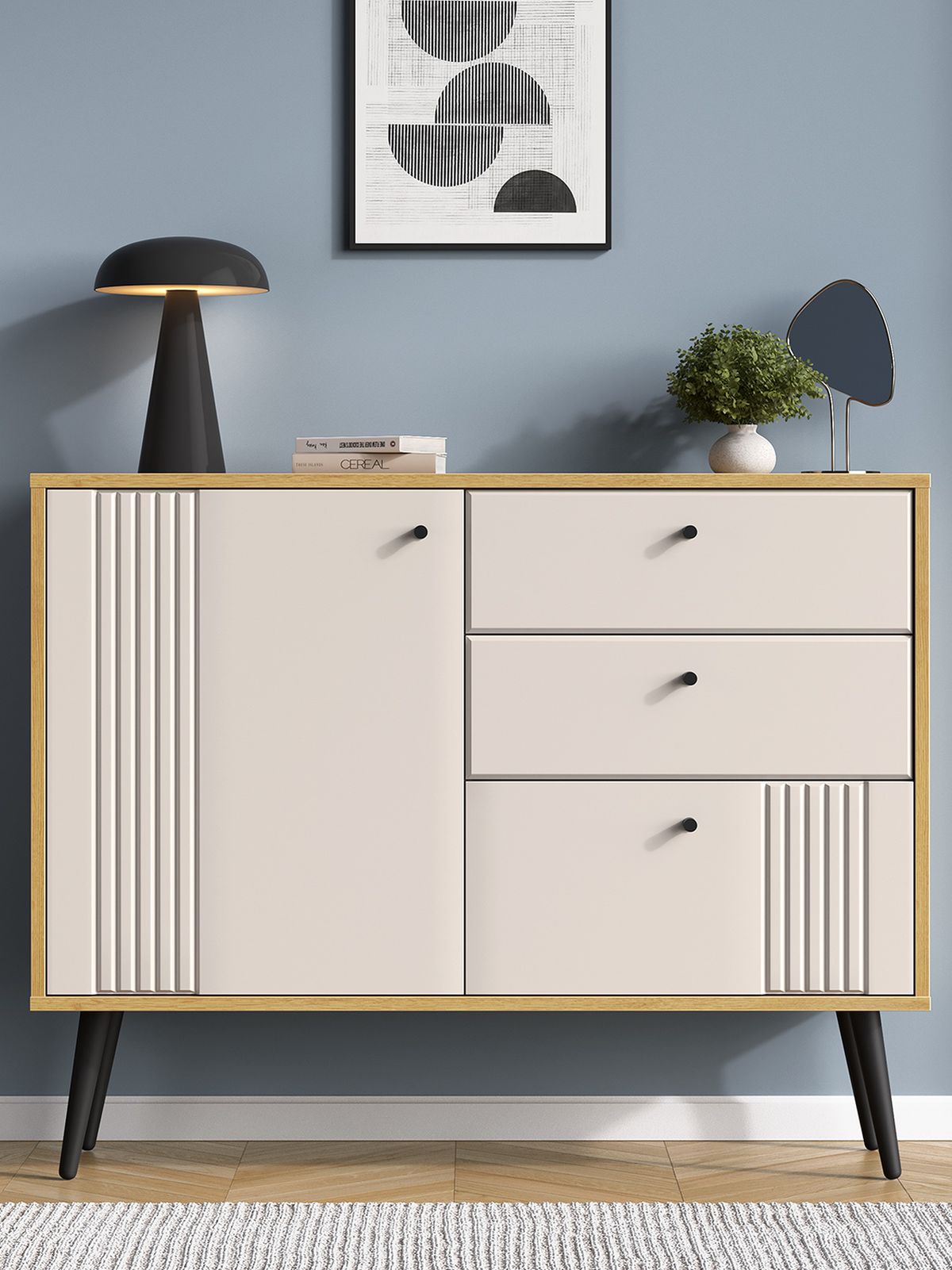 Высокие опоры подчеркивают стиль комода в спальню и значительно облегчают уборку в доме. Купить современный комод вы можете в двух исполнениях: корпус дуб крафт золотой + фасады МДФ серо-зеленые и дуб крафт золотой + фасады МДФ глянец белый. Внутреннее наполнение комода представлено одной секцией и выдвижными ящиками, для хранения вещей. Достоинством комода под телевизор является наличие петель с доводчиком для плавного и бесшумного закрывания дверок.