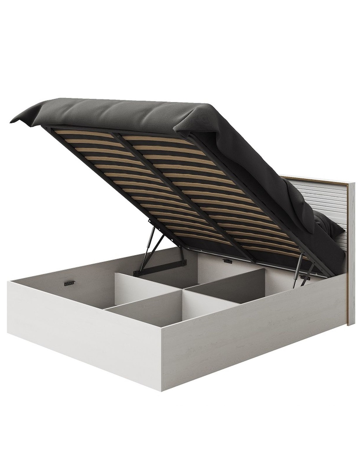 Кровать с подъемным механизмом и ящиком для белья «Монтиз» 1РМ КМК 1003.22 160x200см, каркас изготовлен из ЛДСП цвета белый текстурный, изголовье из МДФ цвета белый ясень текстурный. Детали кровати, которые в эксплуатации подвержены механическим повреждениям, облицованы кромкой ПВХ толщиной 2 мм. В кровати используется ортопедическое основание с подъемным механизмом. Под подъемным механизмом находится отделение для хранения белья.