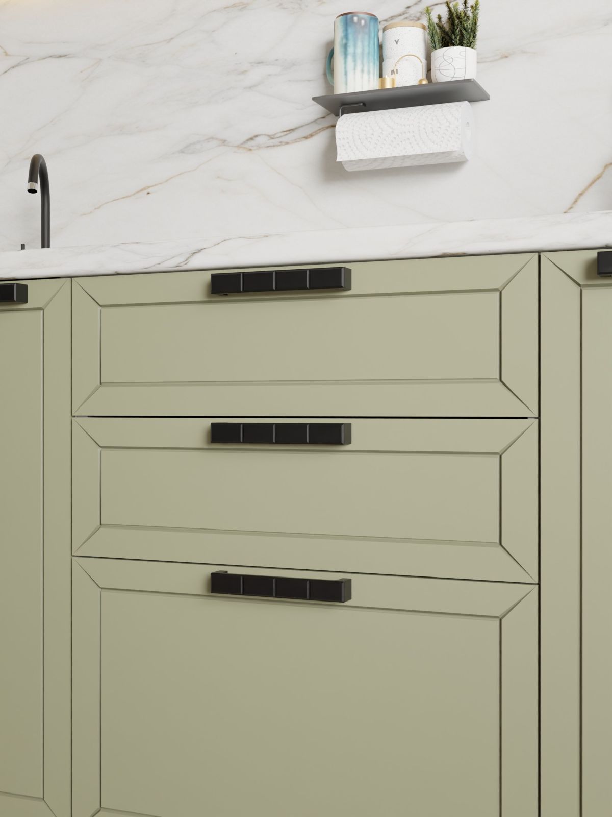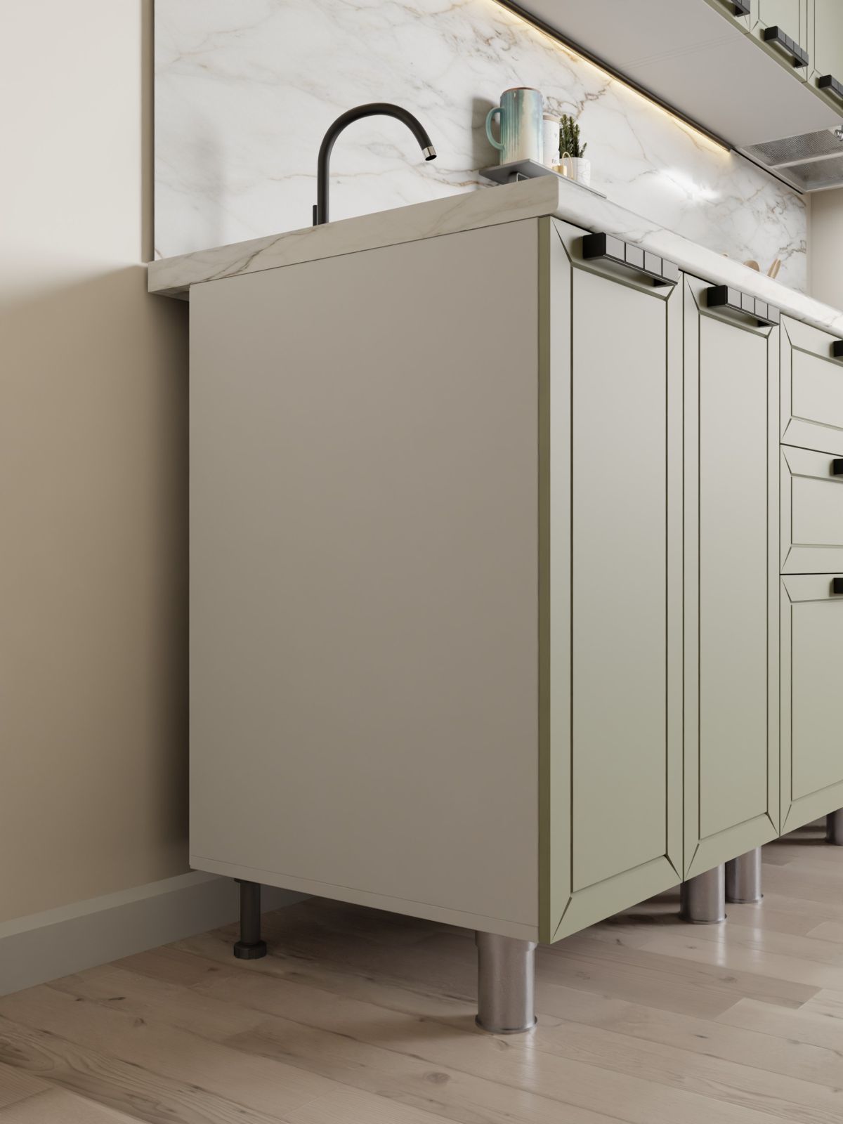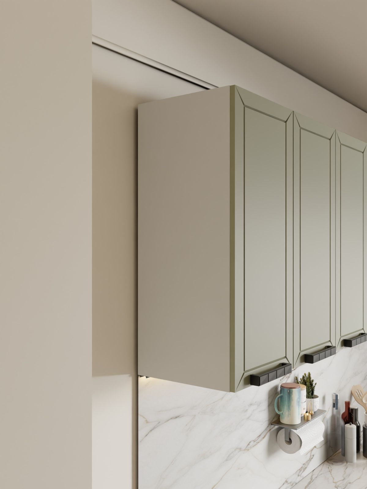 Фасады кухни имеют гладкую поверхность, что предотвращает скапливание пыли и грязи.