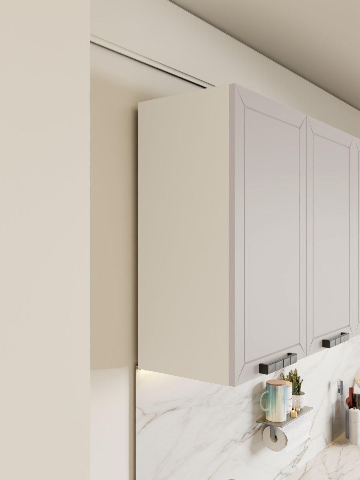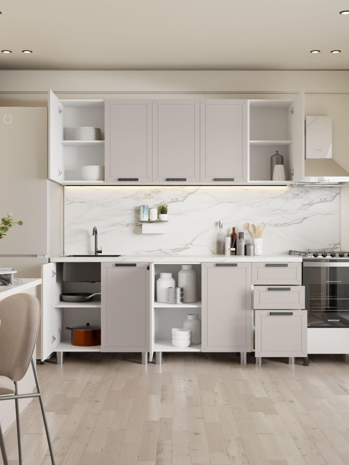 Фасады кухни имеют гладкую поверхность, что предотвращает скапливание пыли и грязи.
