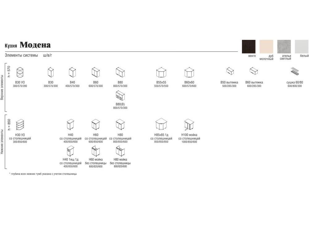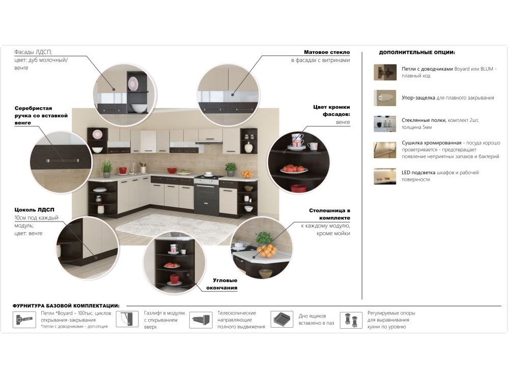 В базовую комплектацию кухни входят регулируемые ножки с закрытым цоколем ЛДСП высотой 10 см под каждый модуль.