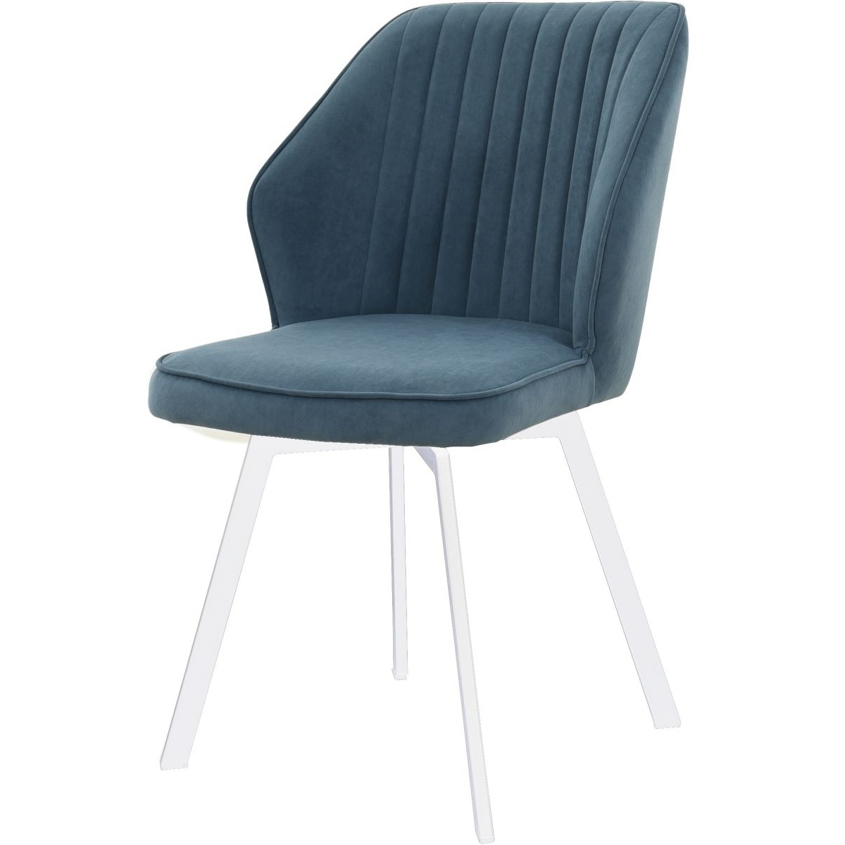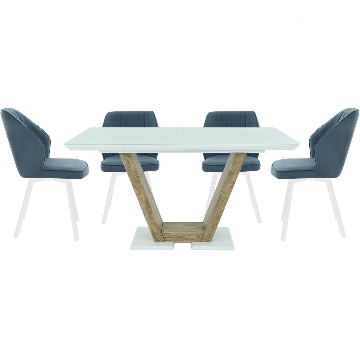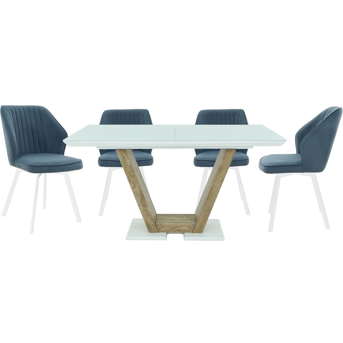 Обеденная группа, состоящая из стола «Торонто» в крашении белого цвета, со стеклянной поверхностью и 4-х стульев «Вермут», на вращающихся каркасах, исполненных в ткани Бренди классик блу — изготовленной Димитровградской мебельной фабрикой «Аврора».
