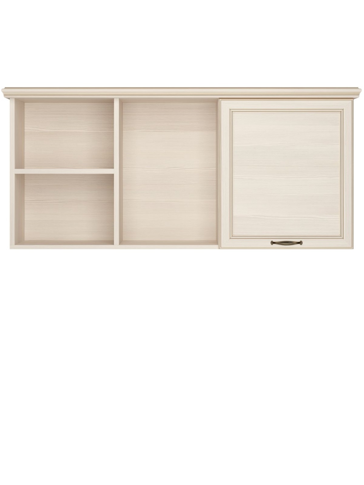 Дизайн модуля соответствует классическому стилю коллекции «Сиена». Корпус изготовлен из светлого ЛДСП «Бодега белый», а в качестве декора применяются профиль МДФ в плёнке ПВХ в цвет корпуса. Золотое патинирование деталей придает мебели роскошный и изысканный вид. Металлическая ручка цвета «старая бронза» украшает дверку.