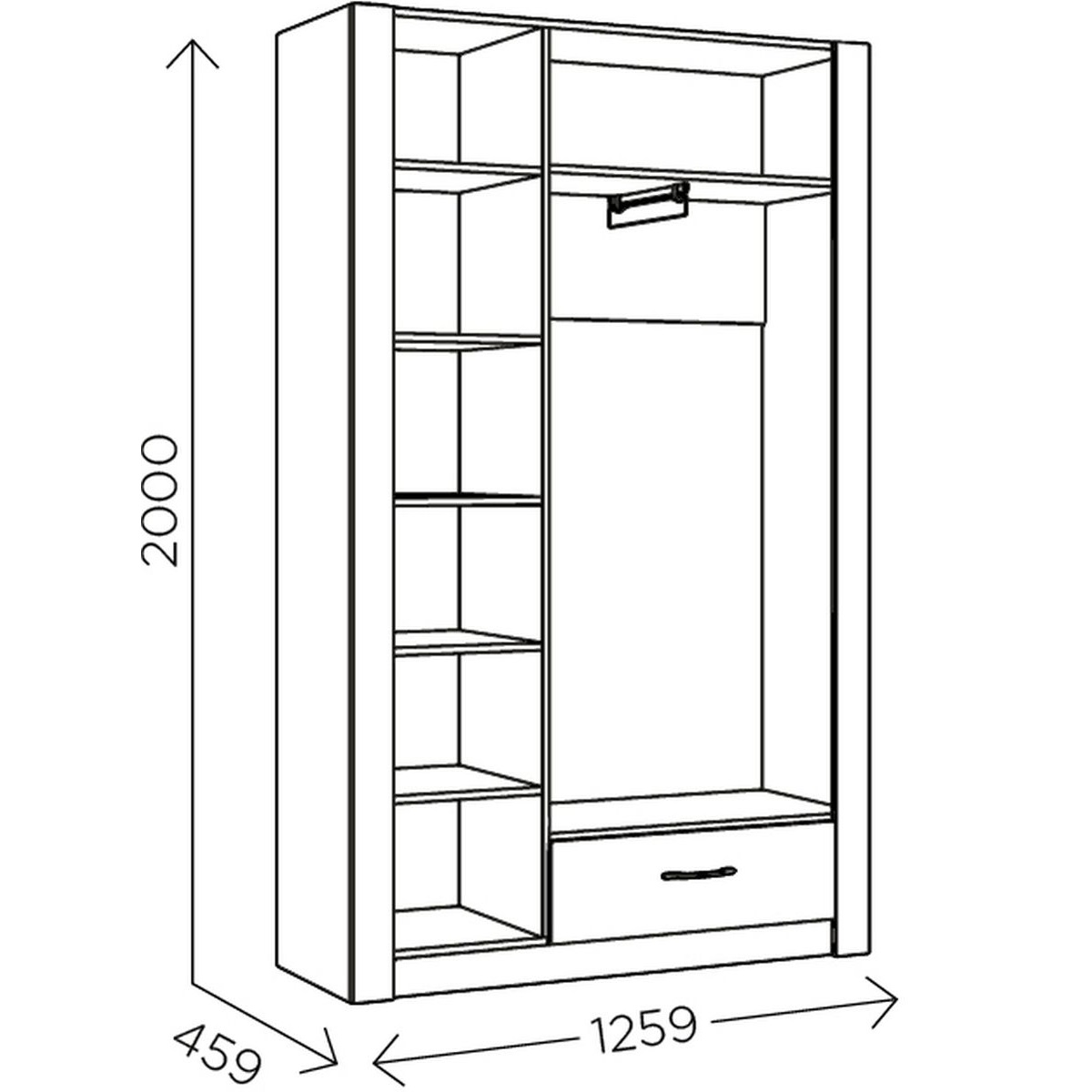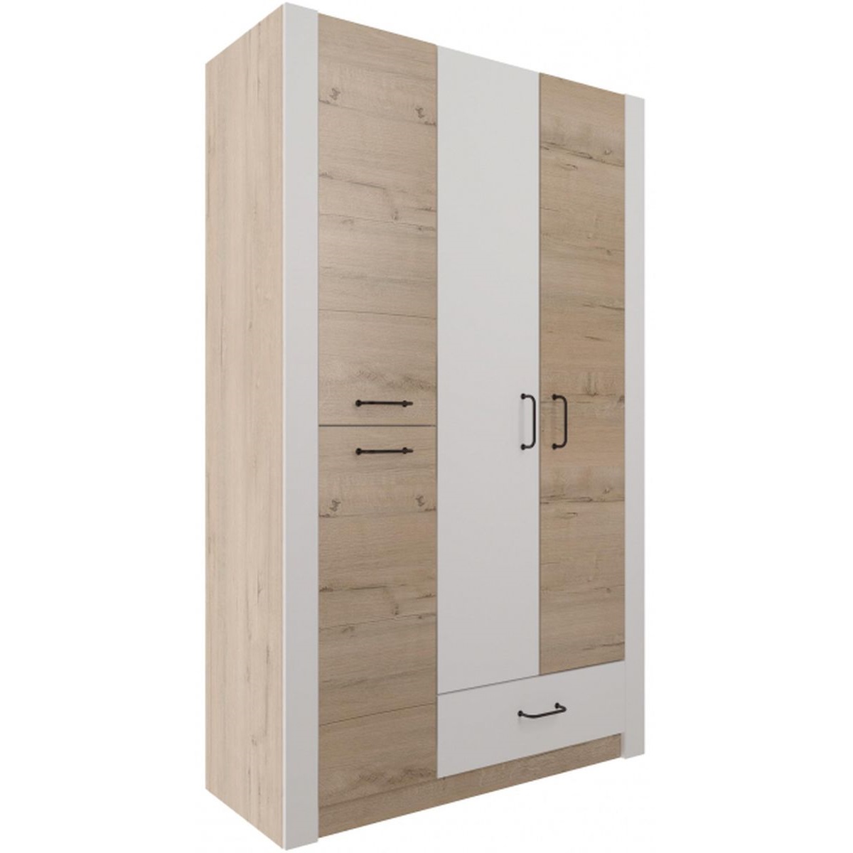 Шкаф распашной, трехстворчатый «Ева 5» М2 с выдвижным ящиком - изготовлен из древесных плит, где каркас выполнен из ЛДСП, а фасады из МДФ, облицованных пленкой ПВХ. Металлические ручки лицевой фурнитуры имеют черный матовый цвет, система выдвижения - шариковые направляющие. На дверных петлях установлены доводчики. На лицевых торцах деталей долговечная кромка толщиной 2мм.