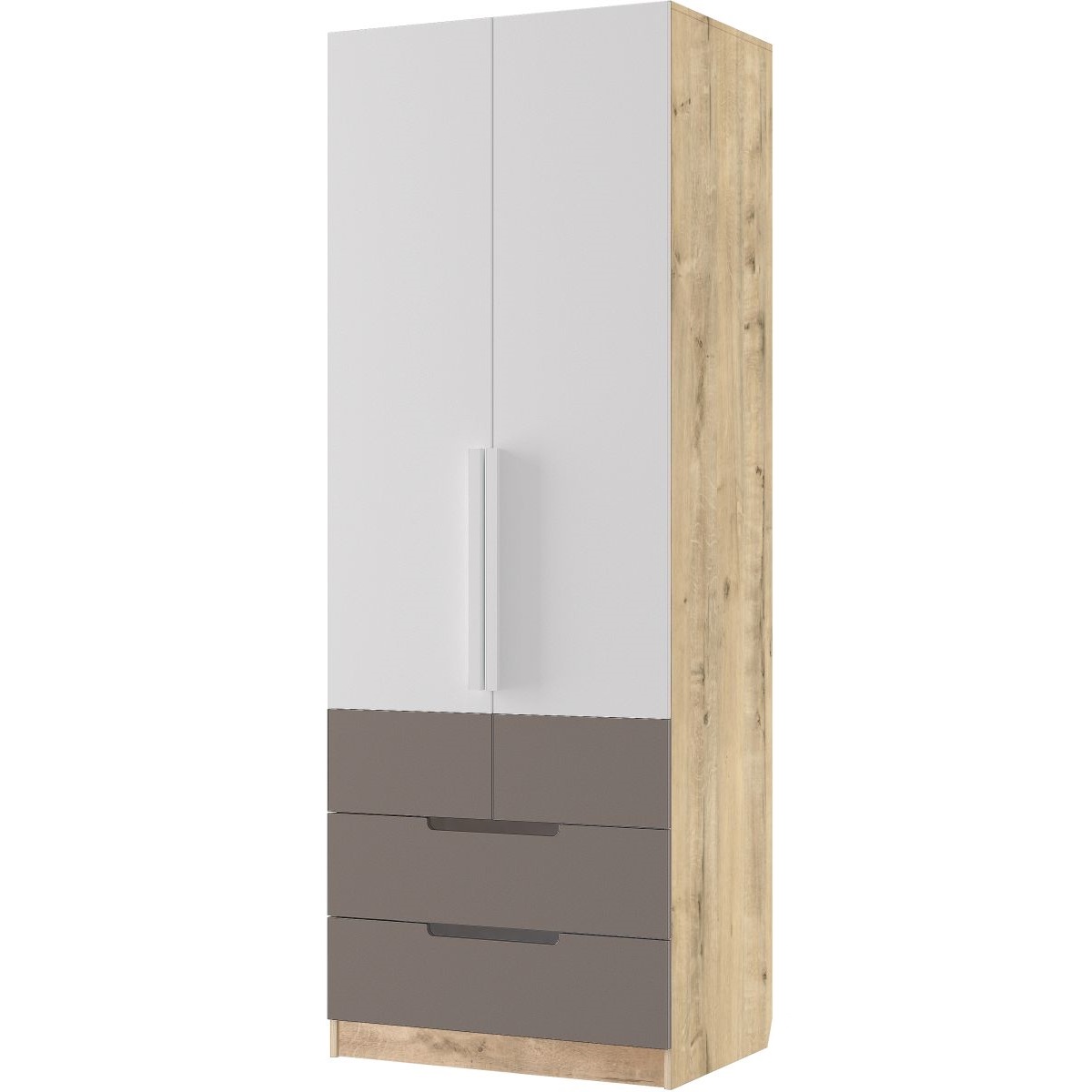 Шкаф распашной, двустворчатый «Илия» М2 - изготовлен из древесных плит, где каркас выполнен из ЛДСП, а фасады из МДФ, облицованных пленкой ПВХ с матовым покрытием Soft-touch. Ручки лицевой фурнитуры выполнены из натурального массива дуба. В выдвижных ящиках на фасадах интегрированы декоративные вырезы, система выдвижения - шариковые направляющие. На дверных петлях установлены доводчики. На торцах лицевых деталей присутствует долговечная кромка толщиной 2мм.