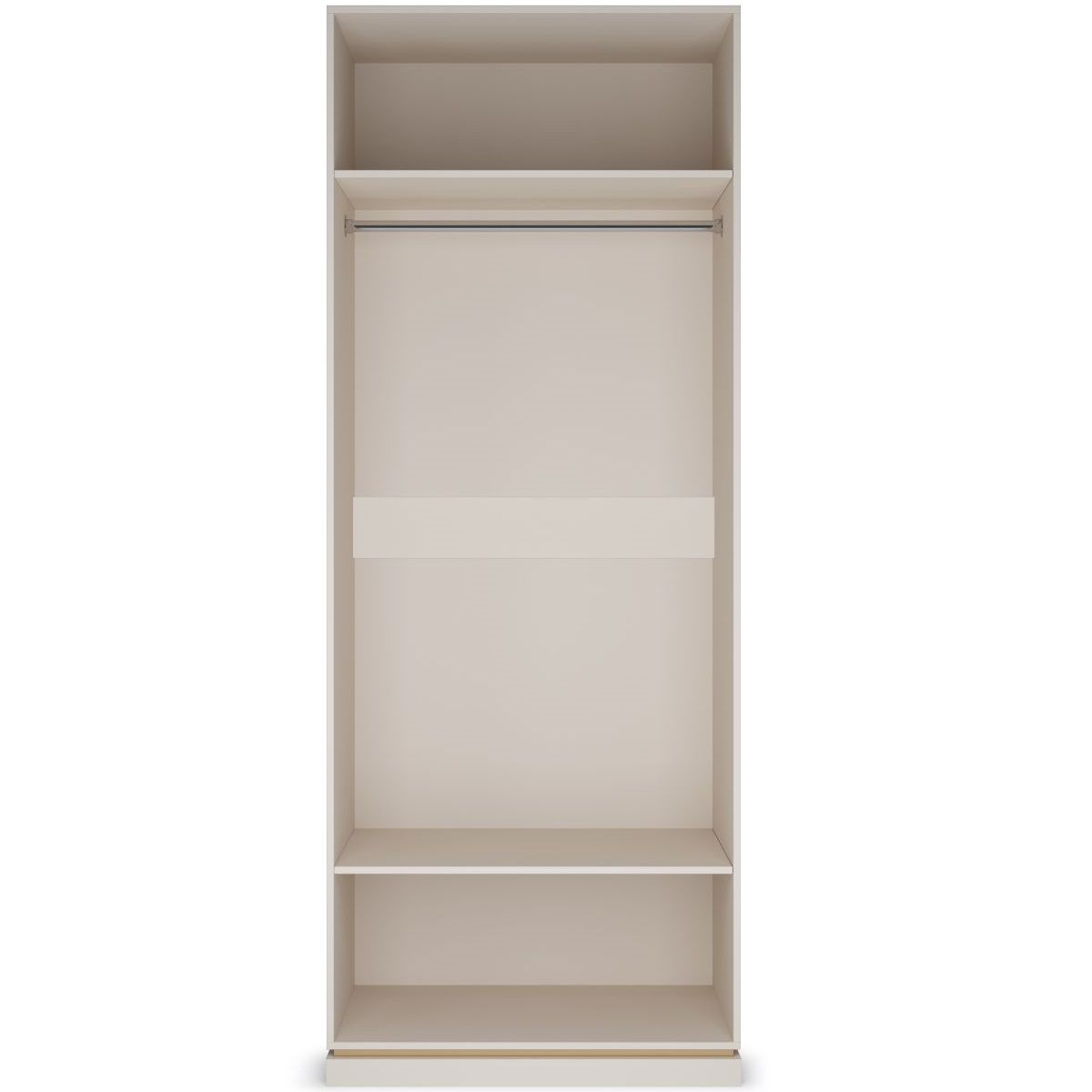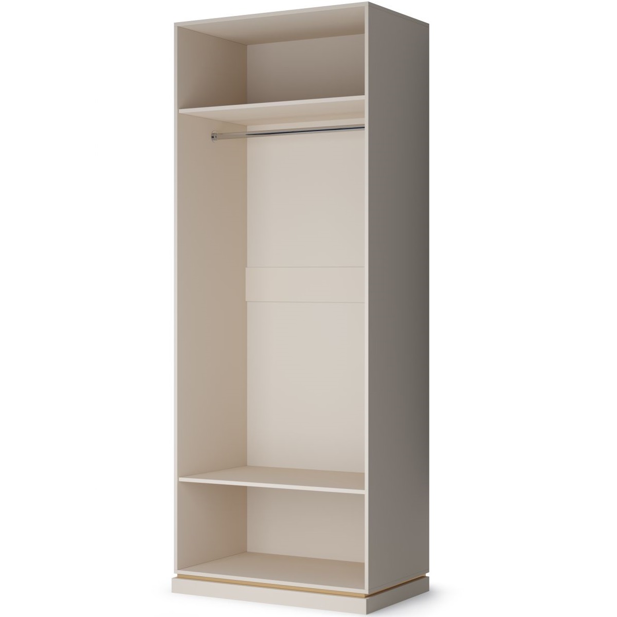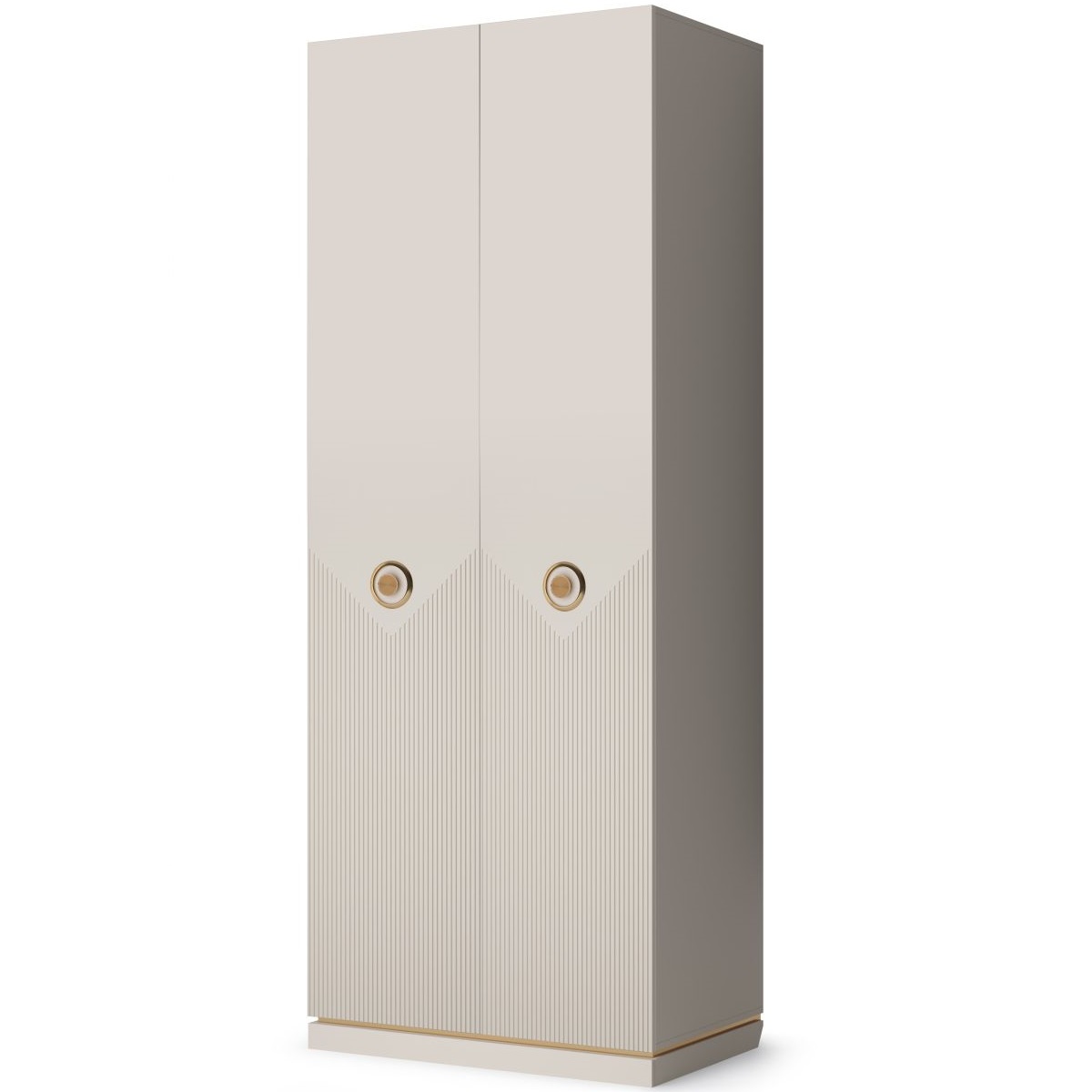 Модуль входит в состав коллекции «Капри» и укомплектован глухими фасадами. Распашной шкаф выполнен в пастельной цветовой гамме из ЛДСП в цвете сатин – для производства корпуса. Фасады глухие выполнены из МДФ в пленке ПВХ, а зеркальные из ЛДСП и зеркального полотна. Матовая глухих поверхность фасадов невероятно приятна на ощупь, а для украшения мебели применяется фрезеровка в виде синхронных параллельных линий. Изделие с глухими фасадами оснащено яркими ручками в цвете золото.