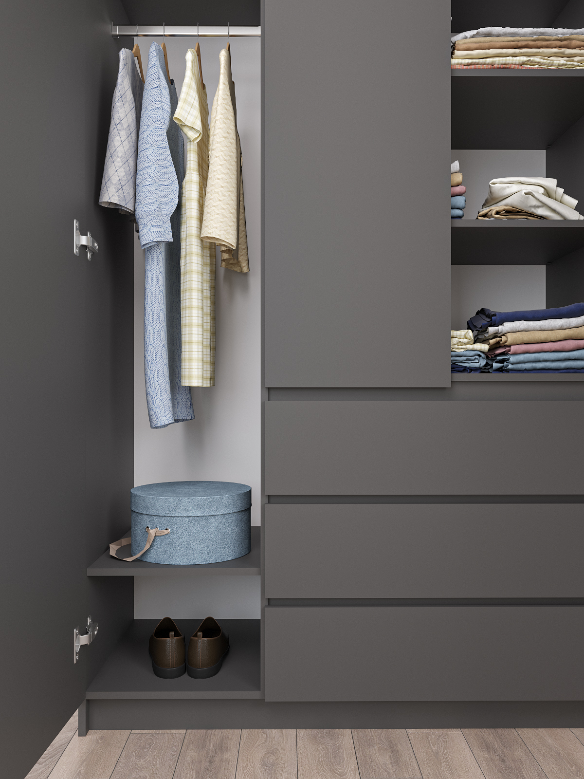 Шкаф для одежды Мори имеет прямую форму, которая позволяет его установить в любом помещении. Он может использоваться как в спальне, так и в гостиной. Благодаря своей минималистичной форме он отлично сочетается с любым интерьером.