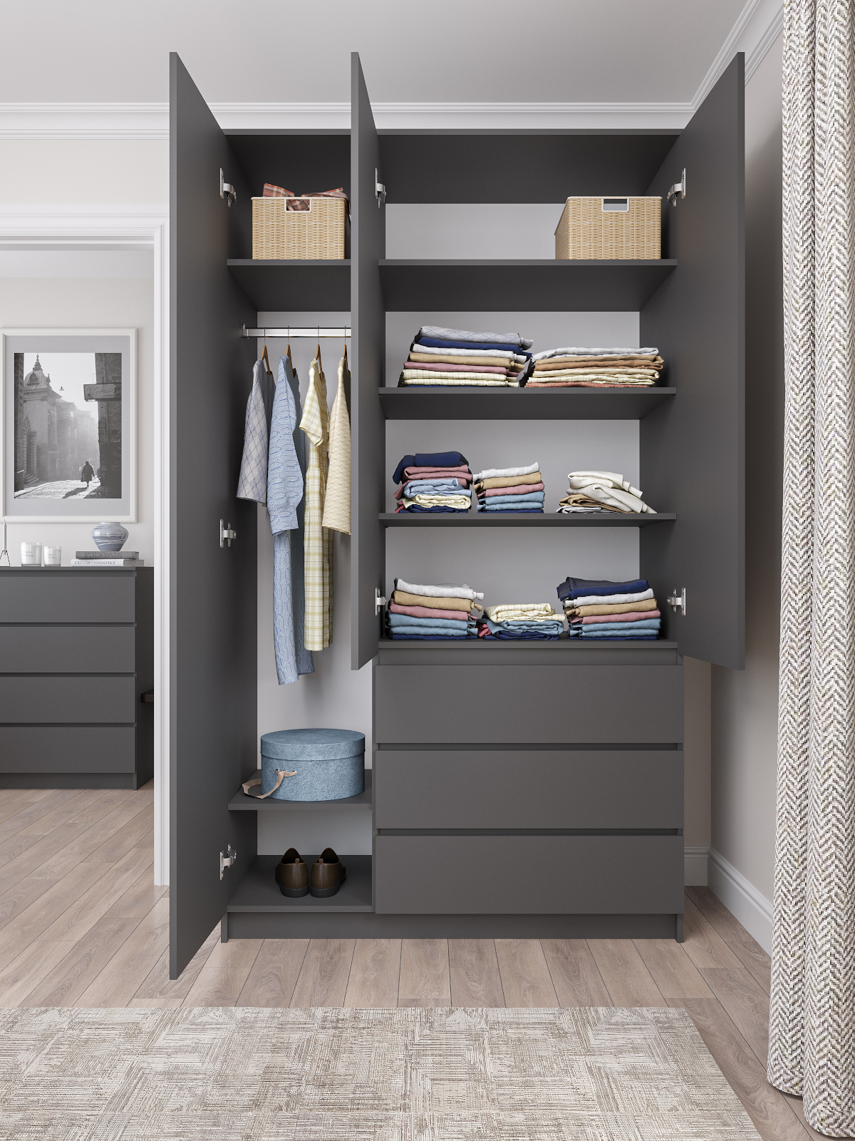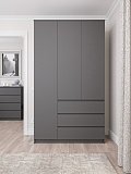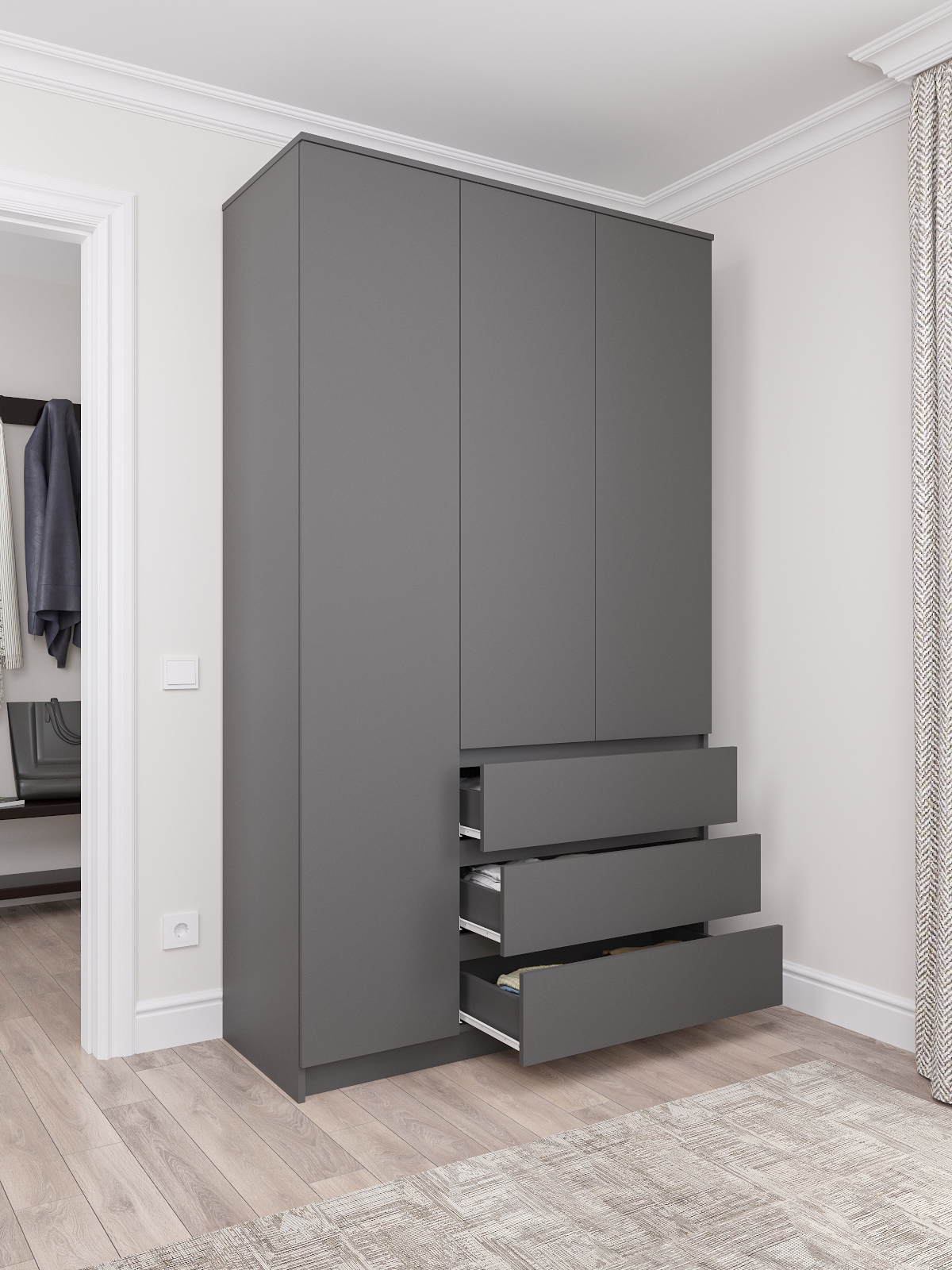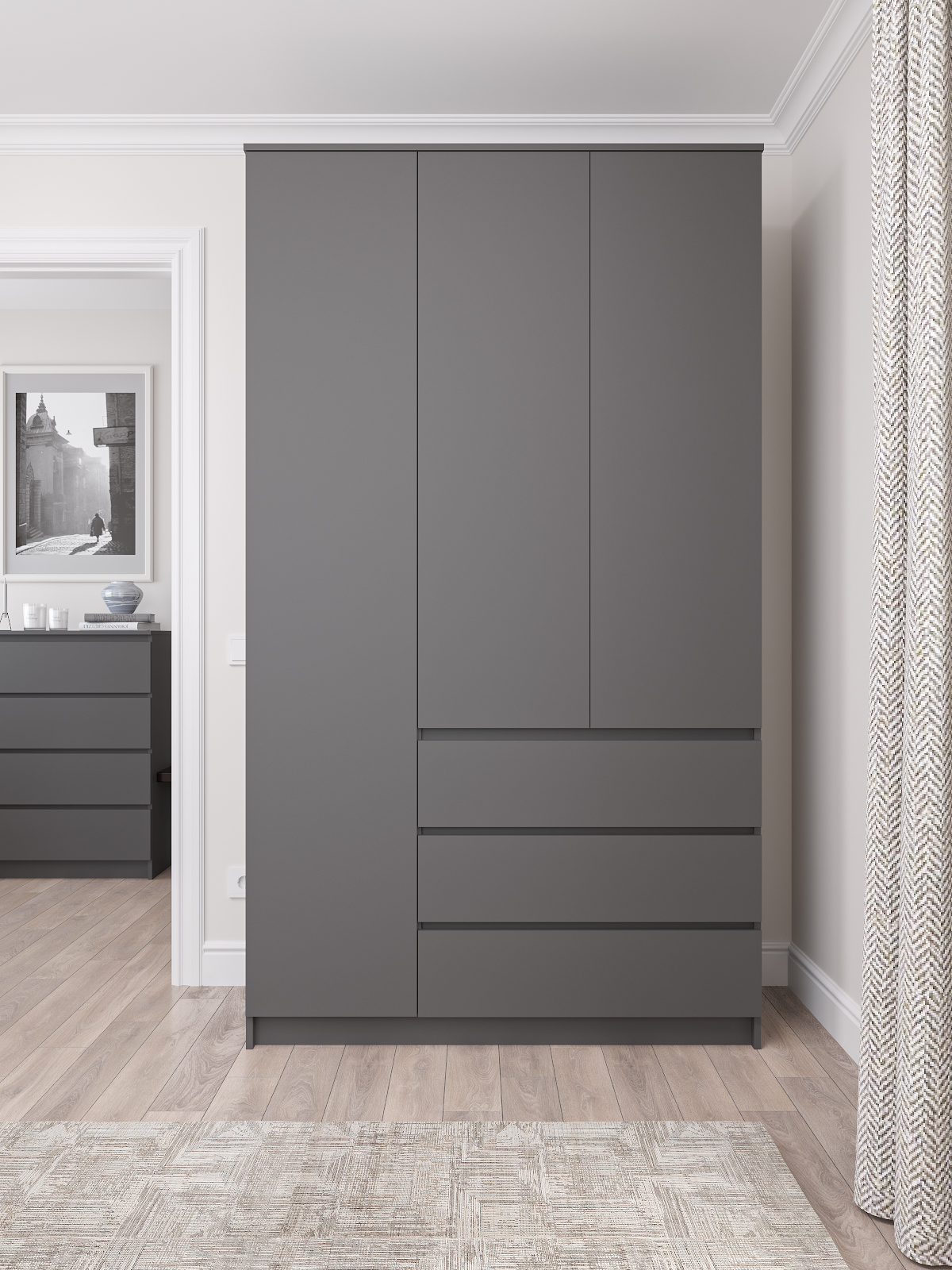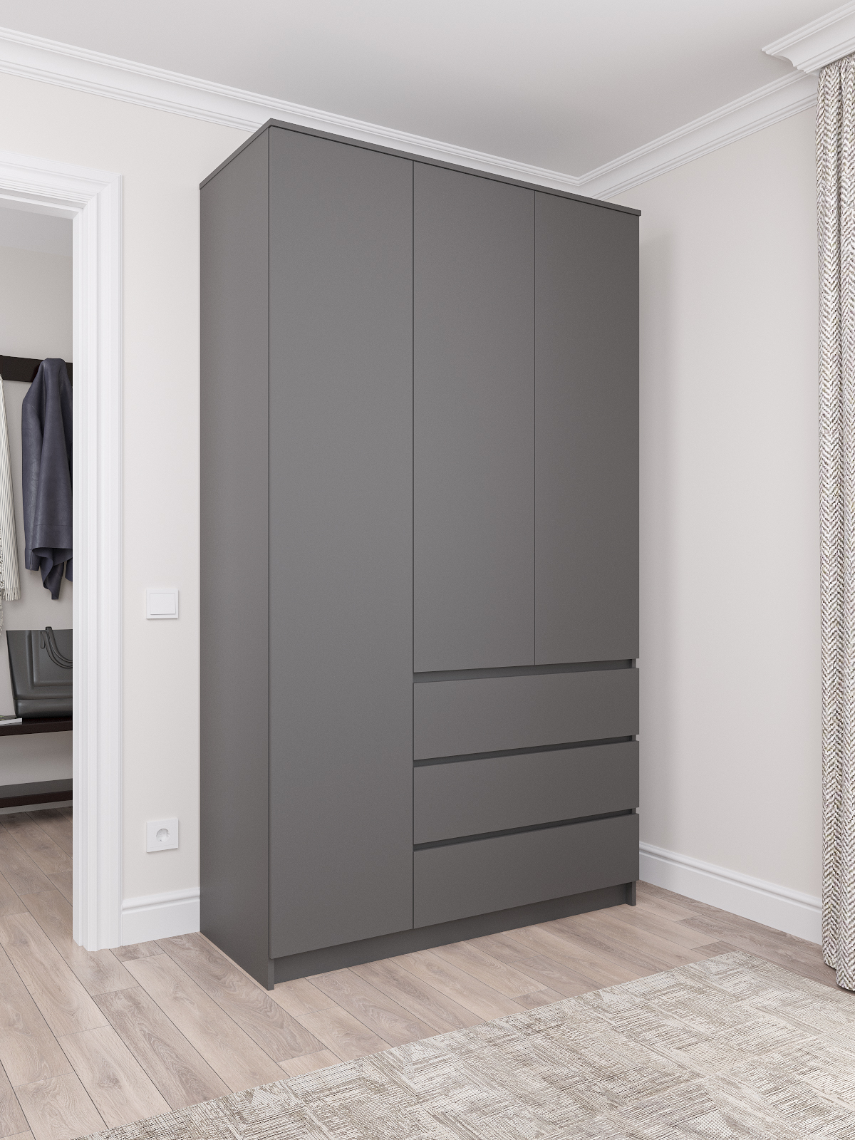Шкаф распашной Мори имеет трехдверную конструкцию, что делает его удобным в использовании. Он не оснащен зеркалами на дверях, широкие створки помогают создать эффект большего пространства внутри шкафа.