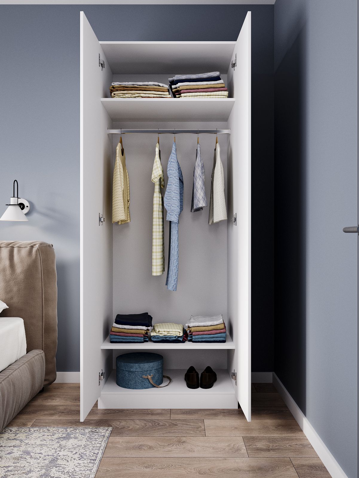 Шкаф распашной Мори имеет двухдверную конструкцию, что делает его удобным в использовании. Он не оснащен зеркалами на дверях, широкие створки помогают создать эффект большего пространства внутри шкафа.
