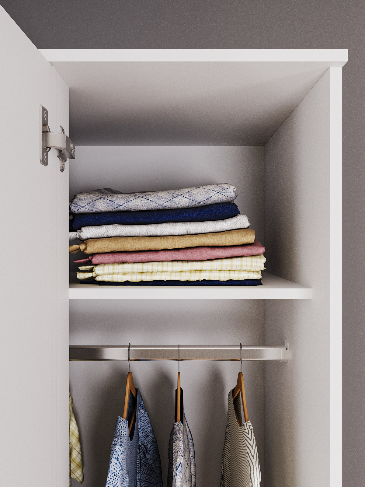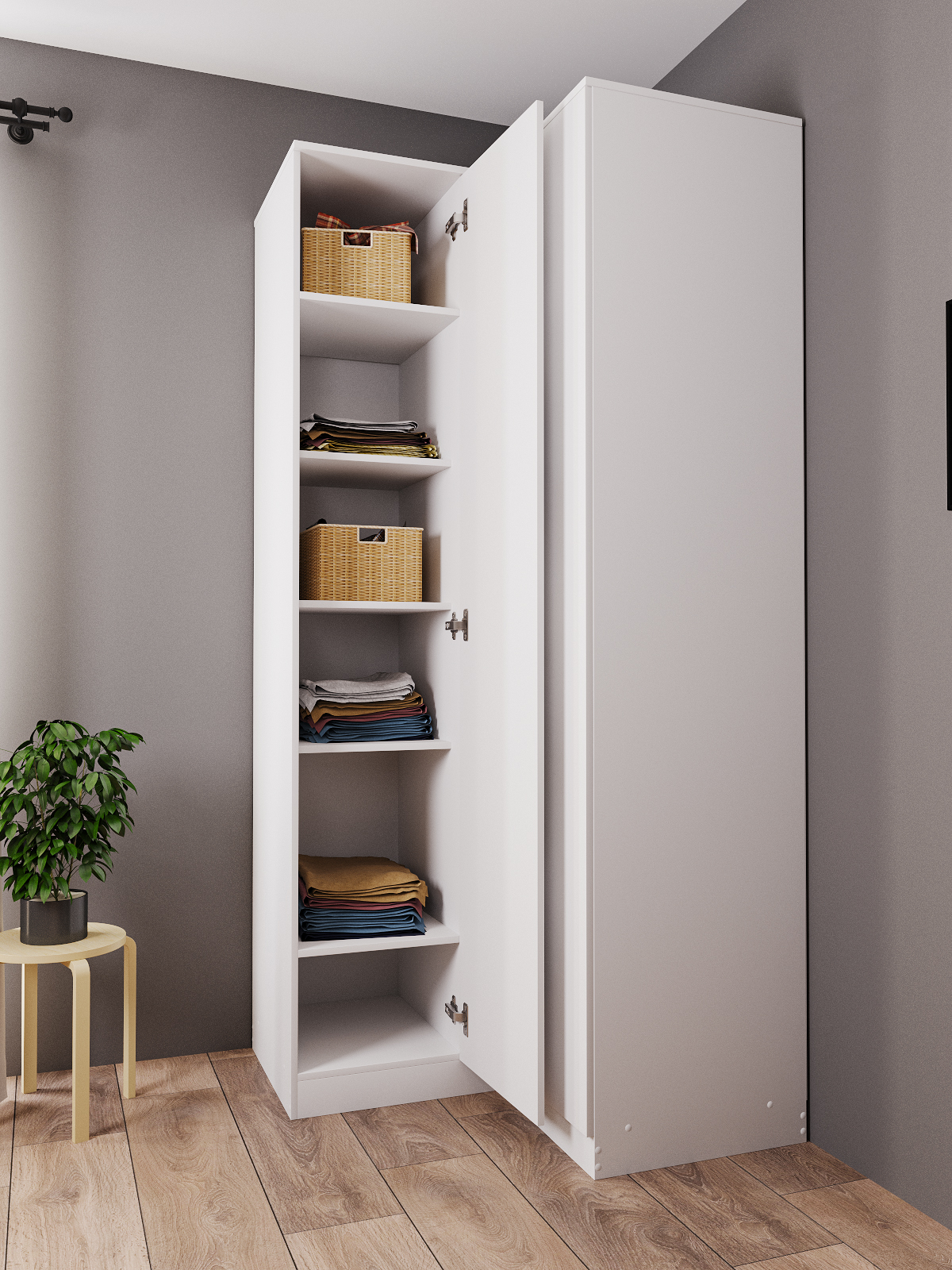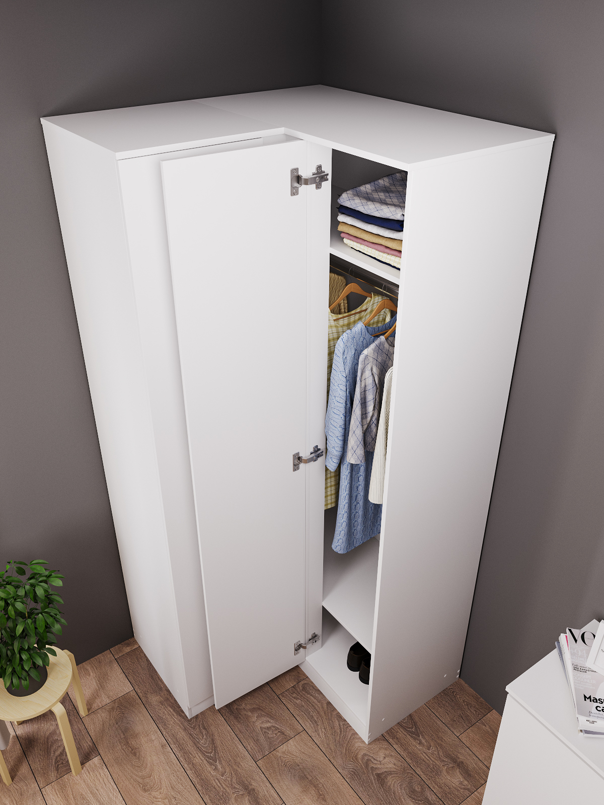 Шкаф для одежды Мори имеет угловую форму, которая позволяет его установить в любом помещении. Он может использоваться как в спальне, так и в гостиной. Благодаря своей минималистичной форме он отлично сочетается с любым интерьером.