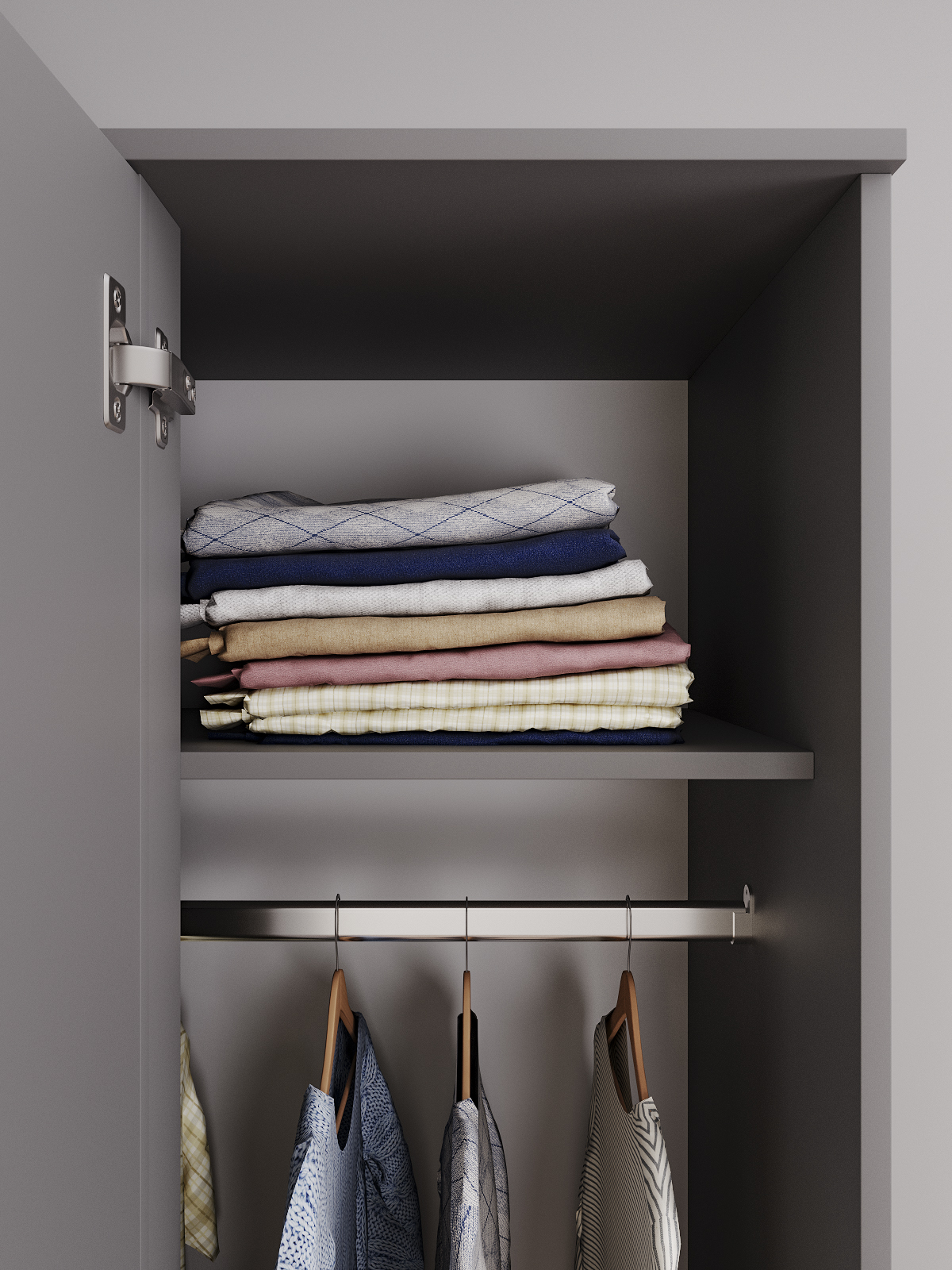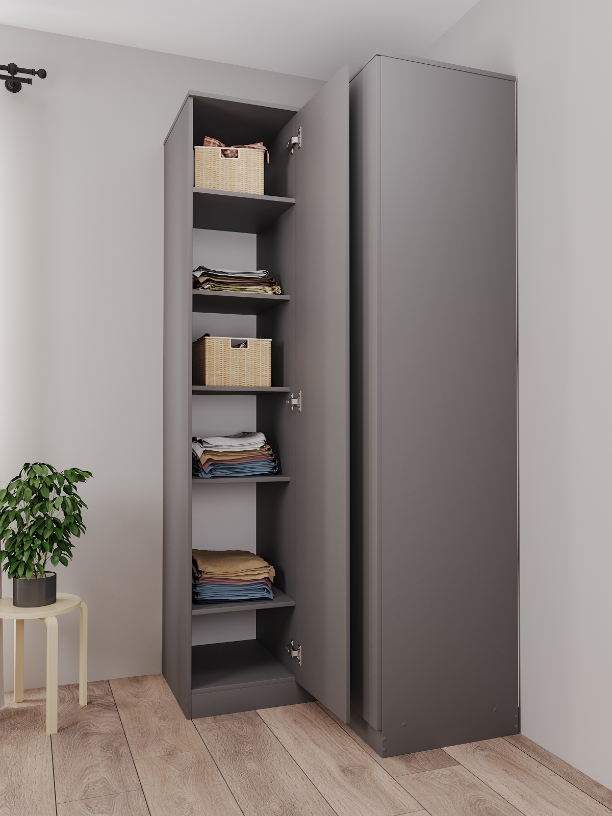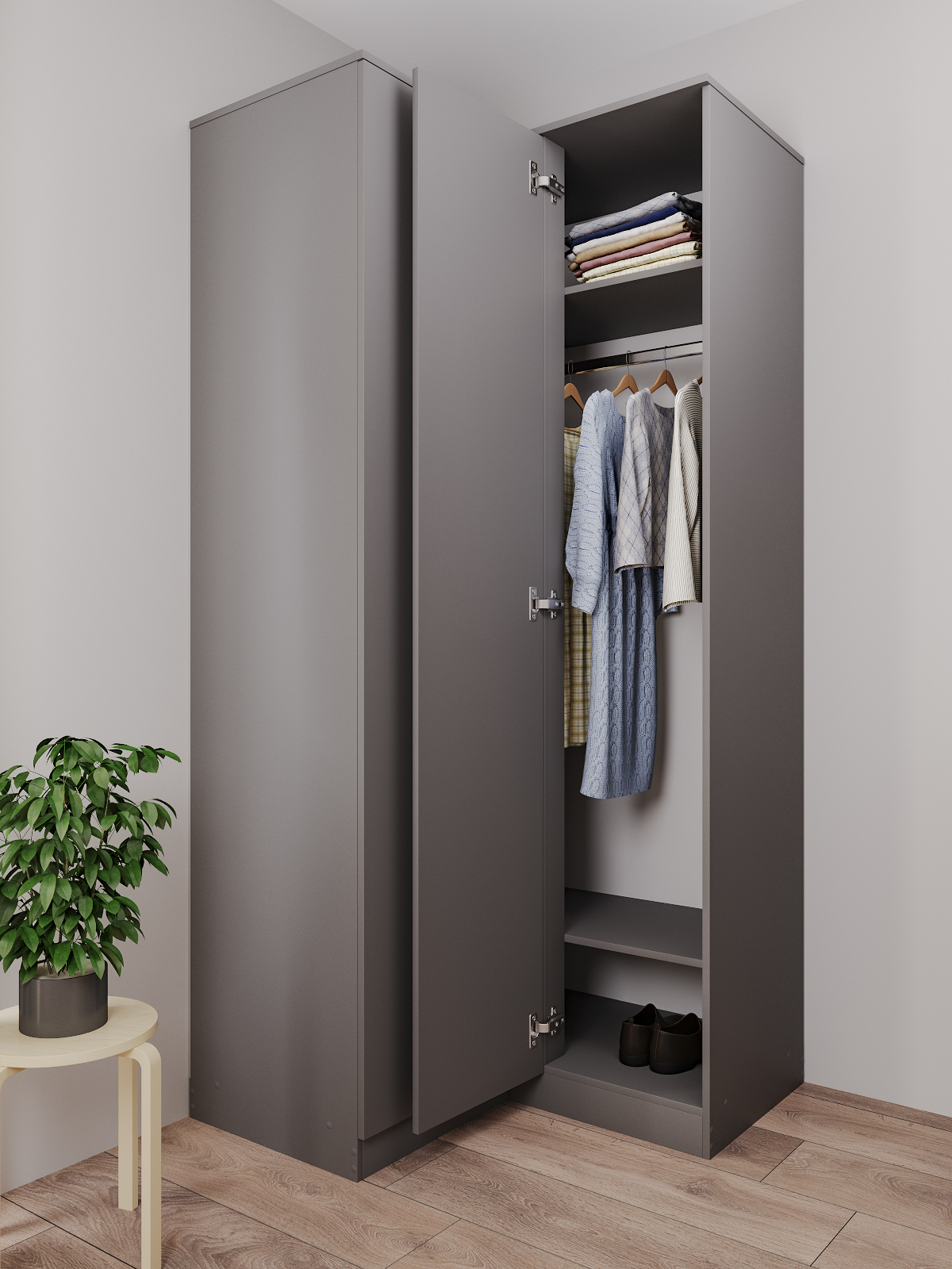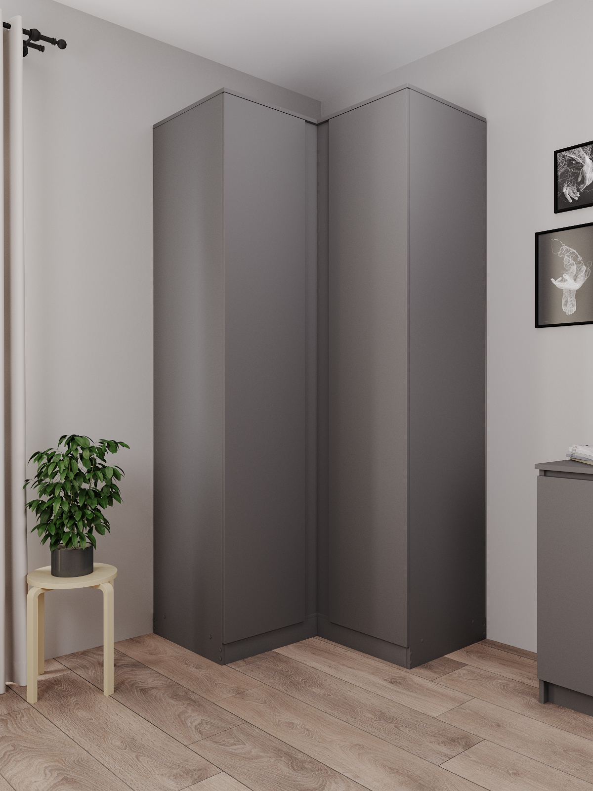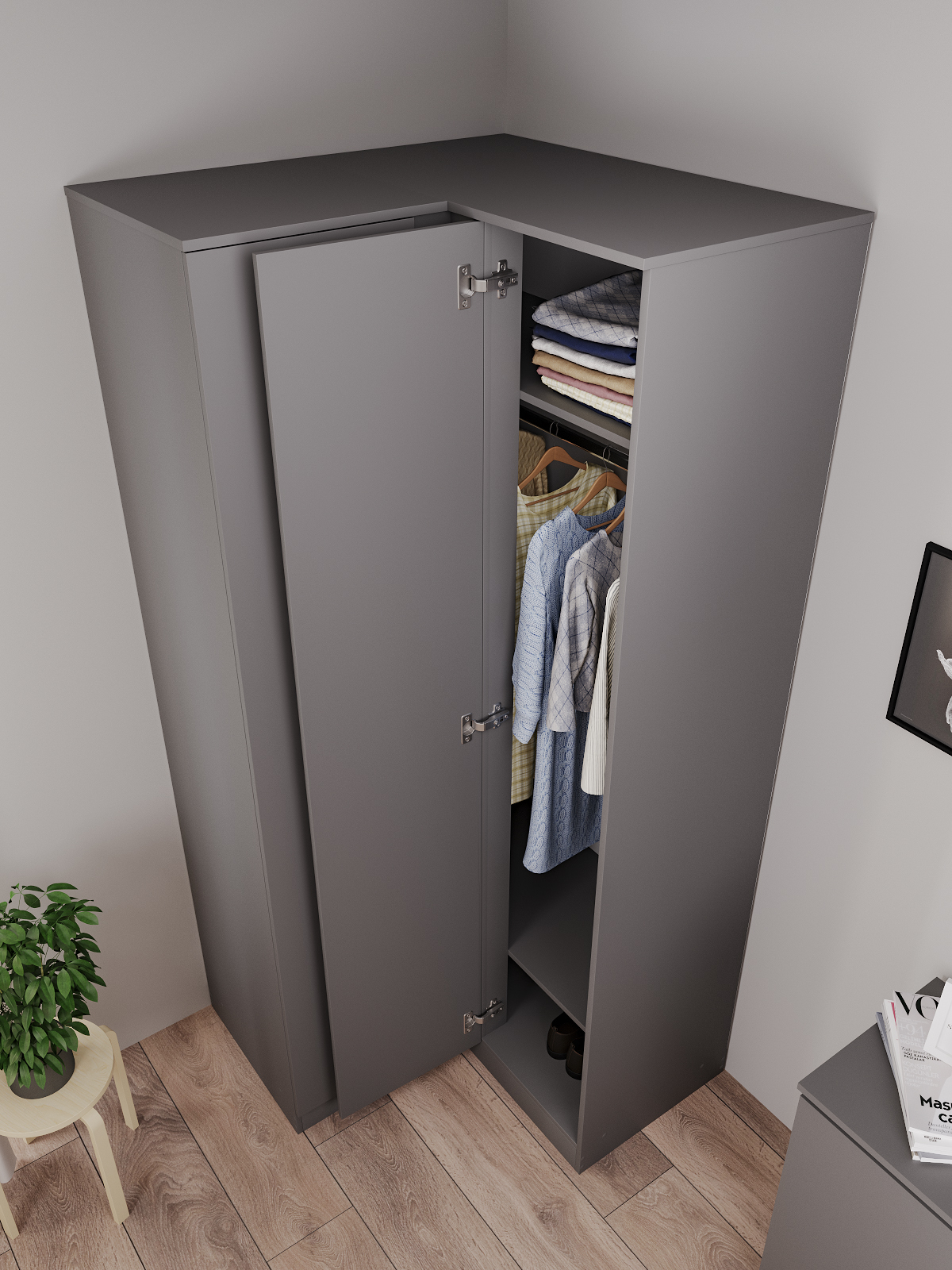Шкаф для одежды Мори имеет угловую форму, которая позволяет его установить в любом помещении. Он может использоваться как в спальне, так и в гостиной. Благодаря своей минималистичной форме он отлично сочетается с любым интерьером.