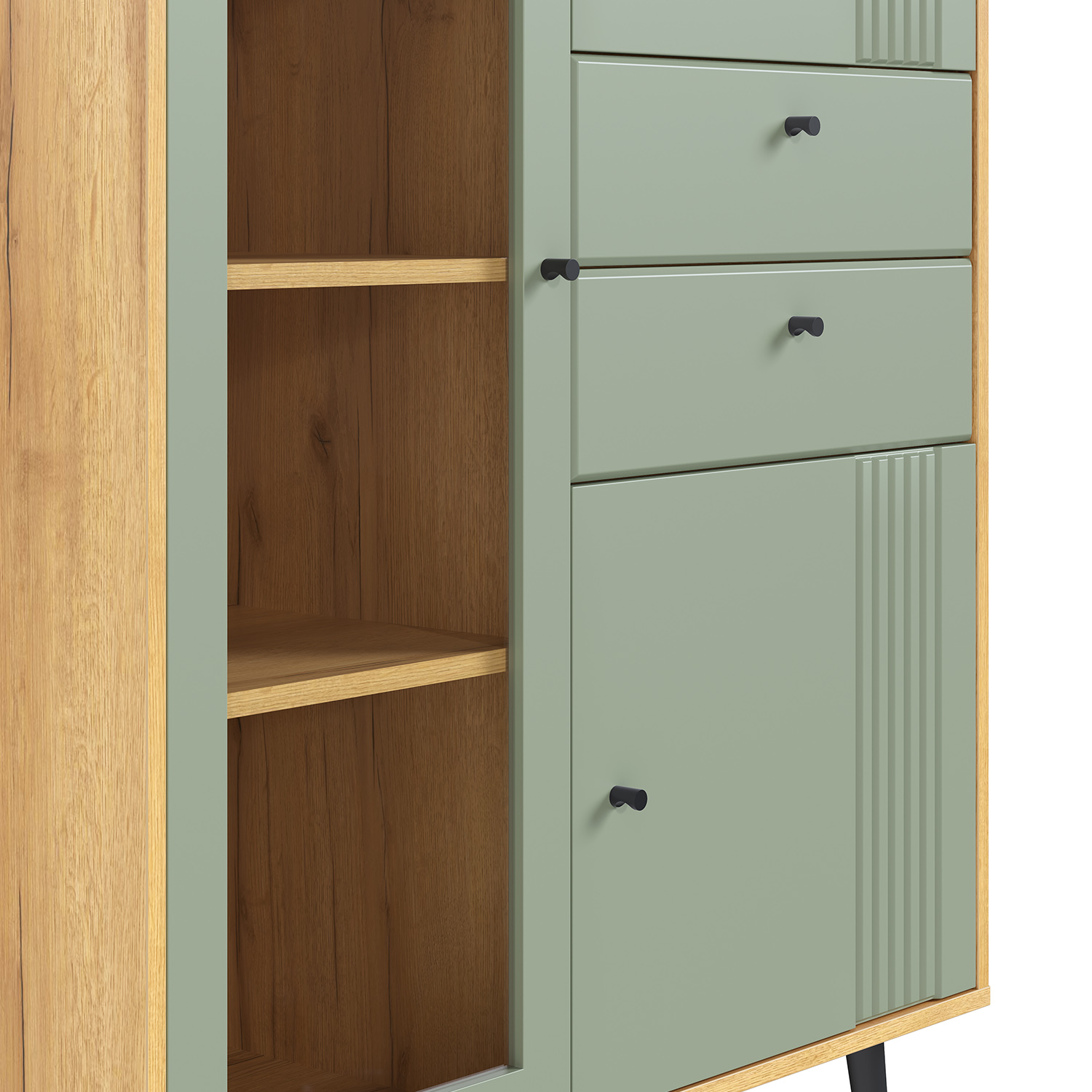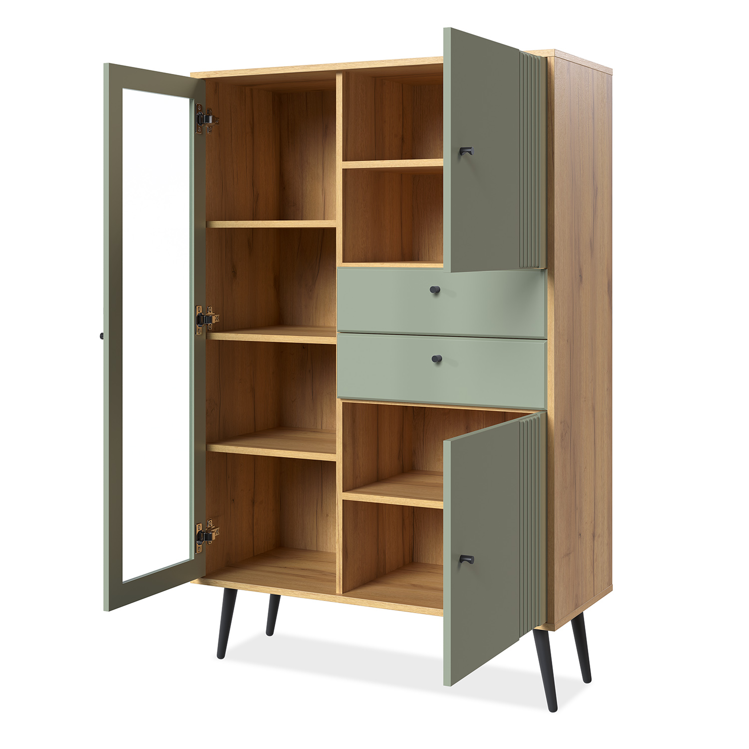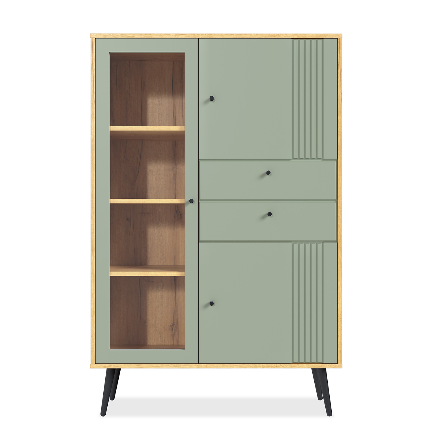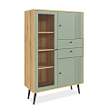 Витрина выполнена из надежных материалов: корпус ЛДСП «дуб крафт золотой», фасады МДФ в исполнениях «миндаль» или «серо-зеленый» на выбор покупателя. Лаконичный декор в виде фрезеровки фасадов в сочетании с лицевой фурнитурой в черном цвете подчеркивают стиль мебели.