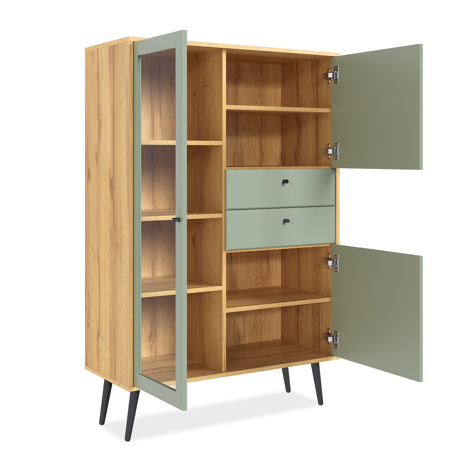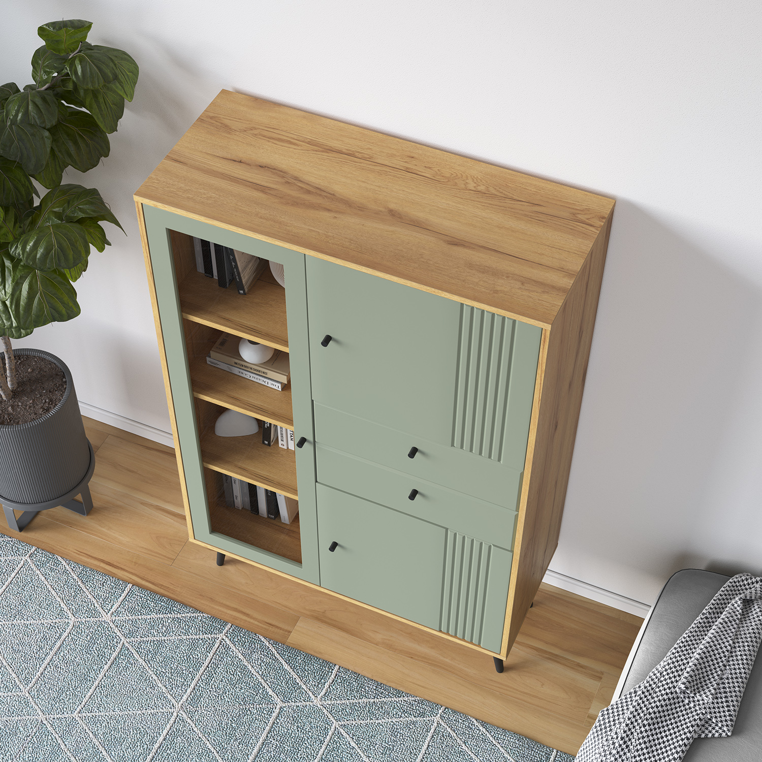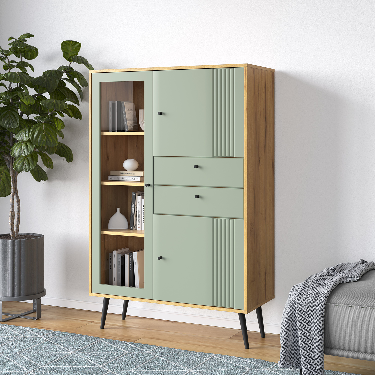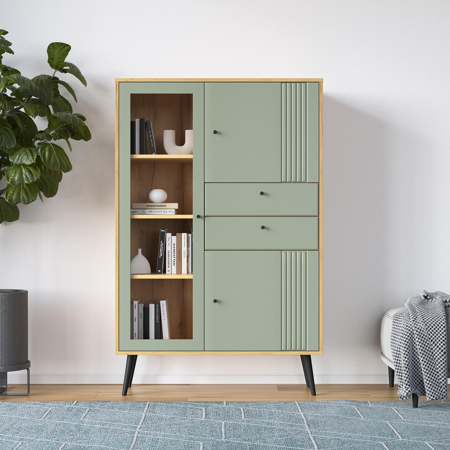 Витрина выполнена из надежных материалов: корпус ЛДСП «дуб крафт золотой», фасады МДФ в исполнениях «миндаль» или «серо-зеленый» на выбор покупателя. Лаконичный декор в виде фрезеровки фасадов в сочетании с лицевой фурнитурой в черном цвете подчеркивают стиль мебели.