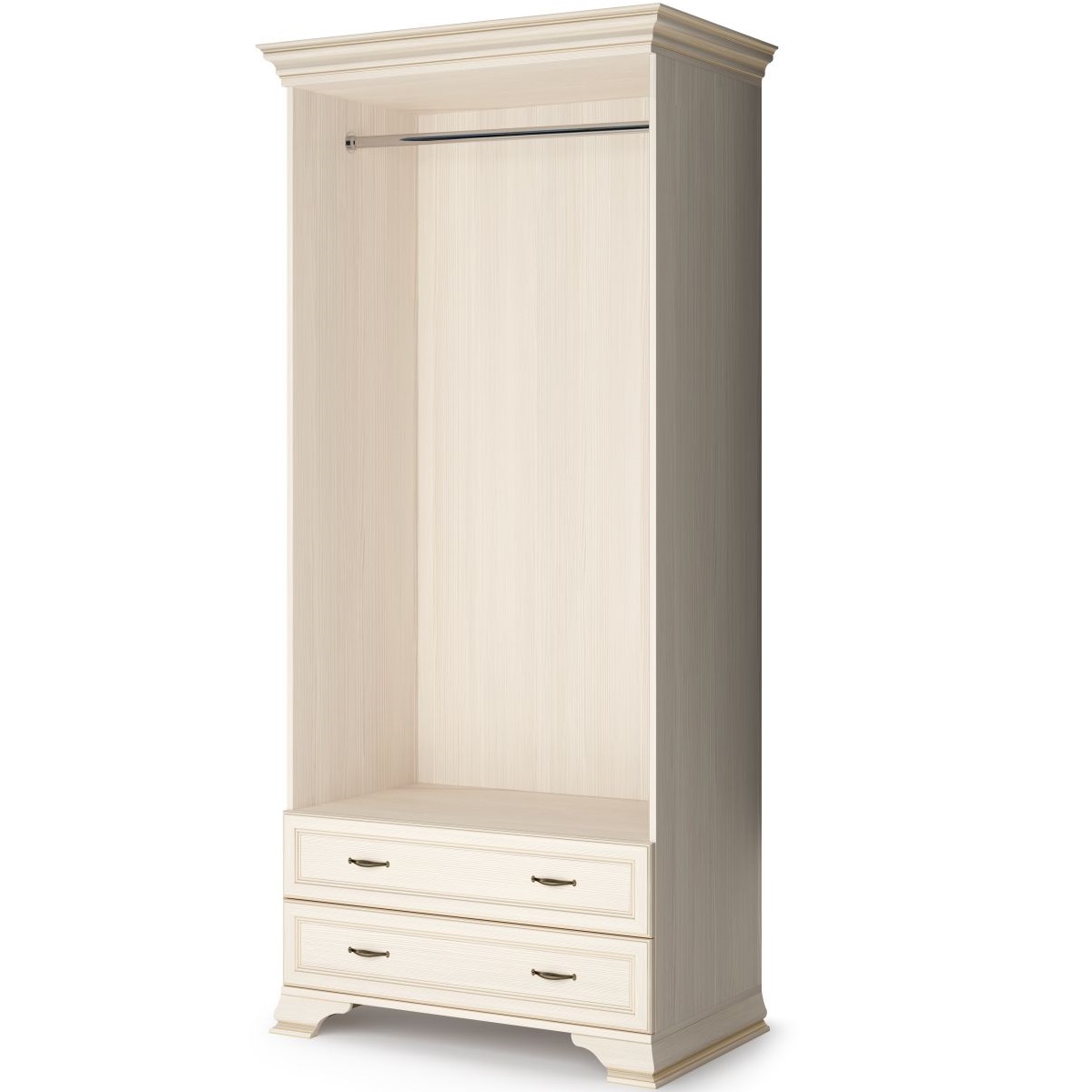 Шкаф распашной двухдверный предназначен для вертикального хранения одежды. Горизонтальная штанга для вешалок может быть заменена на обычные полки по вашему желанию - они продаются отдельно. У него есть 2 выдвижных ящика для хранения белья и разных мелочей. Шкаф имеет ножки из МДФ-профиля, а также комплектуется декоративным карнизом.