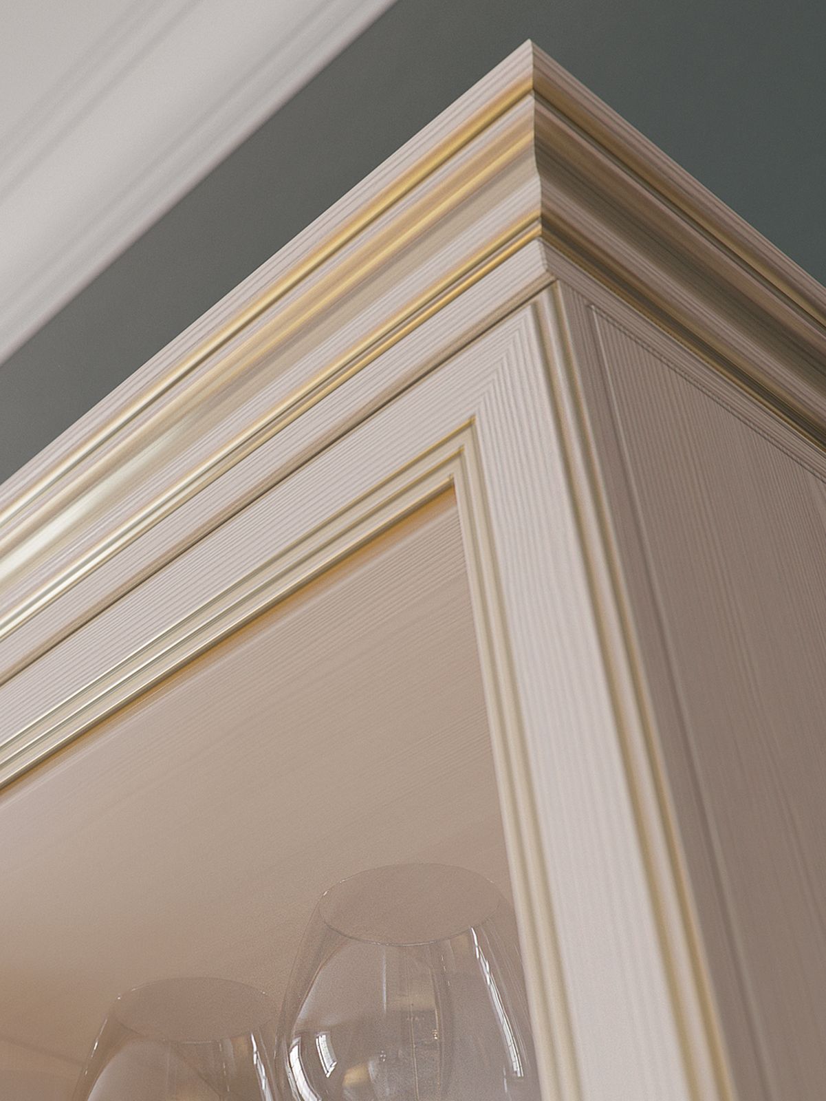 Материал корпуса ЛДСП «Бодега белый» - светлый теплый оттенок с легкой древесной текстурой. Фасады ящиков оформлены накладками МДФ, карниз и опоры имеют рельефную классическую форму. Золотая патина подчеркивает изгибы декоративных деталей, благодаря ей мебель выглядит очень нарядно и эффектно. Фасады украшают металлические ручки цвета старая бронза.