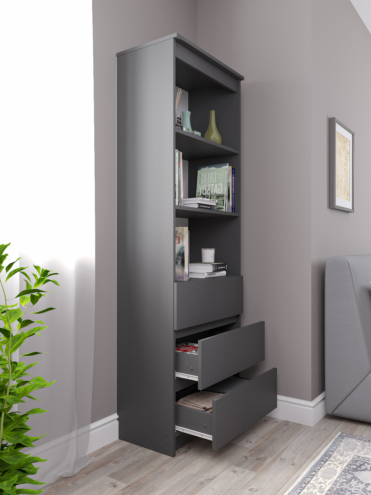 Стеллаж деревянный Мори имеет устойчивую конструкцию, что делает его удобным в использовании в любой комнате. Он оснащен хорошими, глубокими ящиками и вместительными полками, где можно хранить книги.