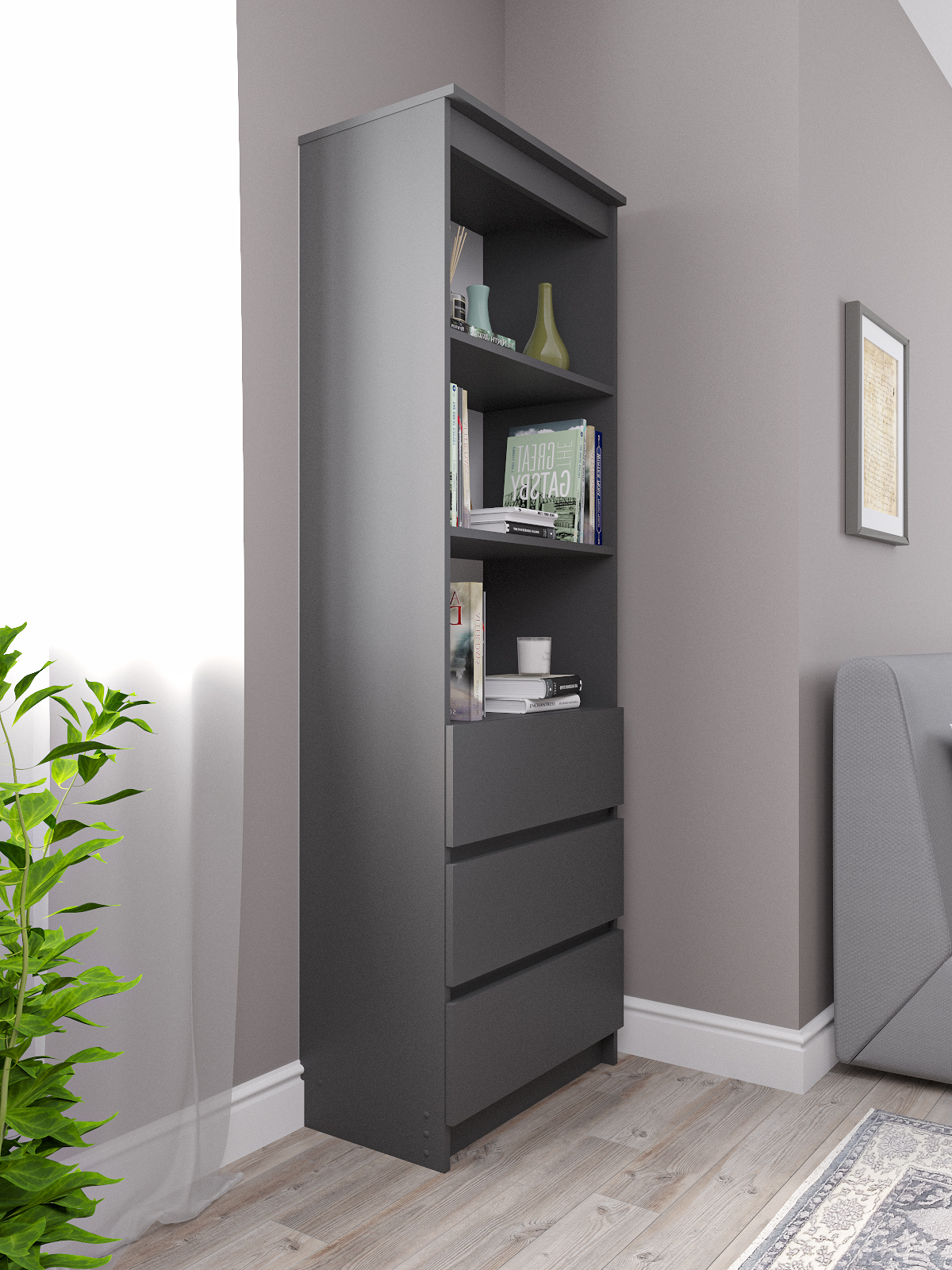 Стеллаж с полками Мори имеет ширину 60см, которая позволяет его установить в любом помещении. Он может использоваться как в спальне, так и в гостиной. Благодаря своей минималистичной форме он отлично сочетается с любым интерьером.