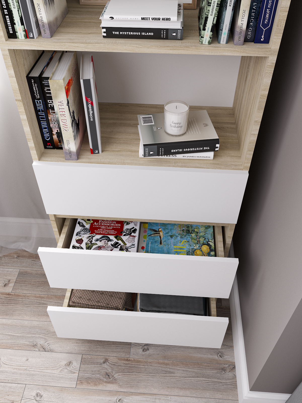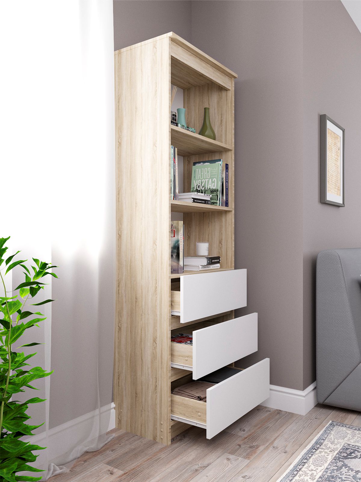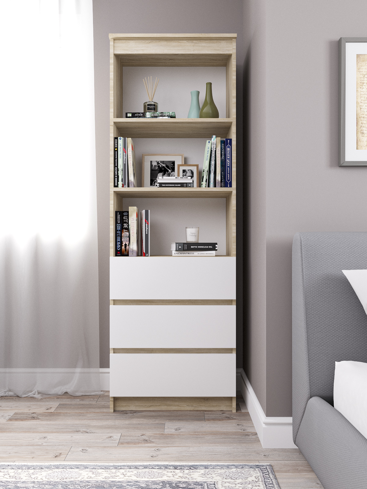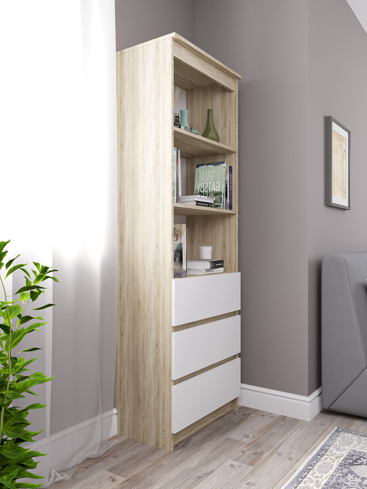 Стеллаж деревянный Мори имеет устойчивую конструкцию, что делает его удобным в использовании в любой комнате. Он оснащен хорошими, глубокими ящиками и вместительными полками, где можно хранить книги.
