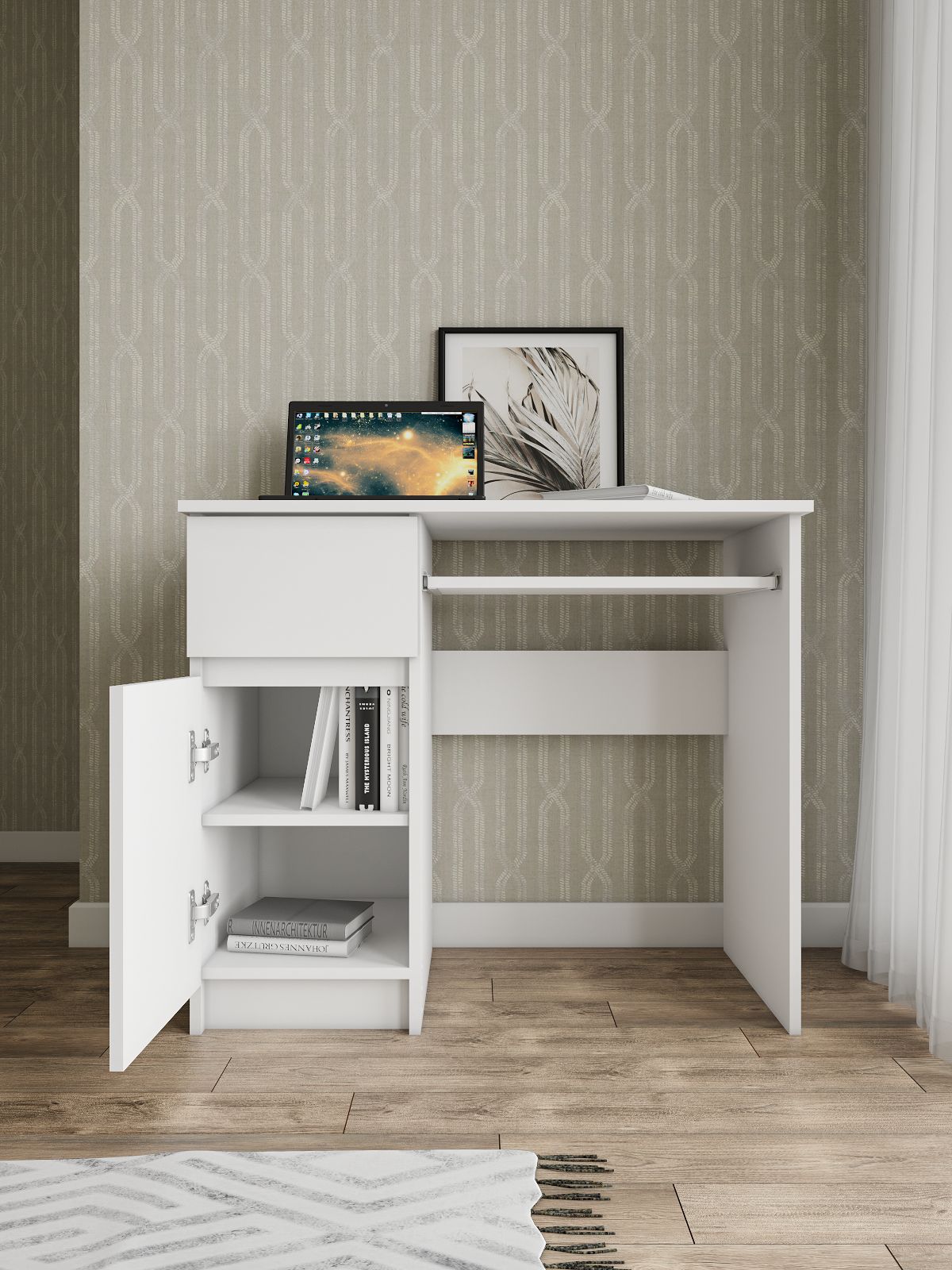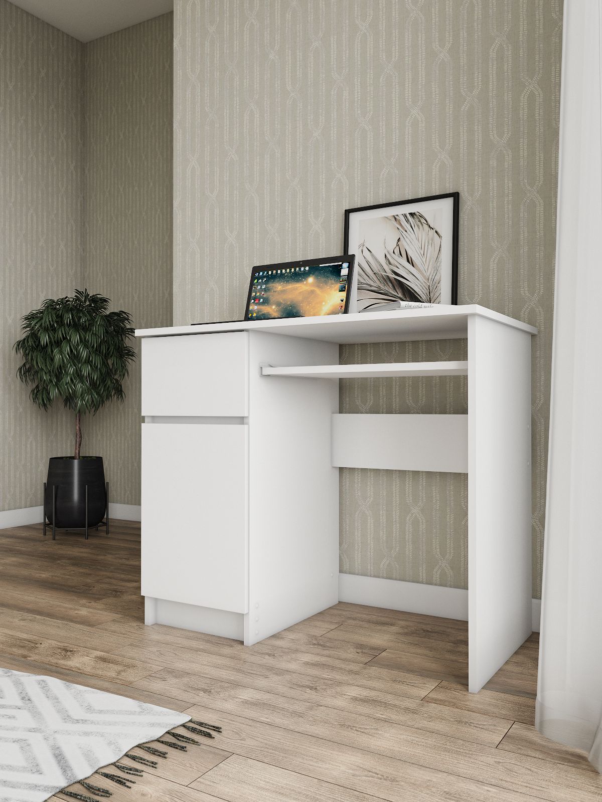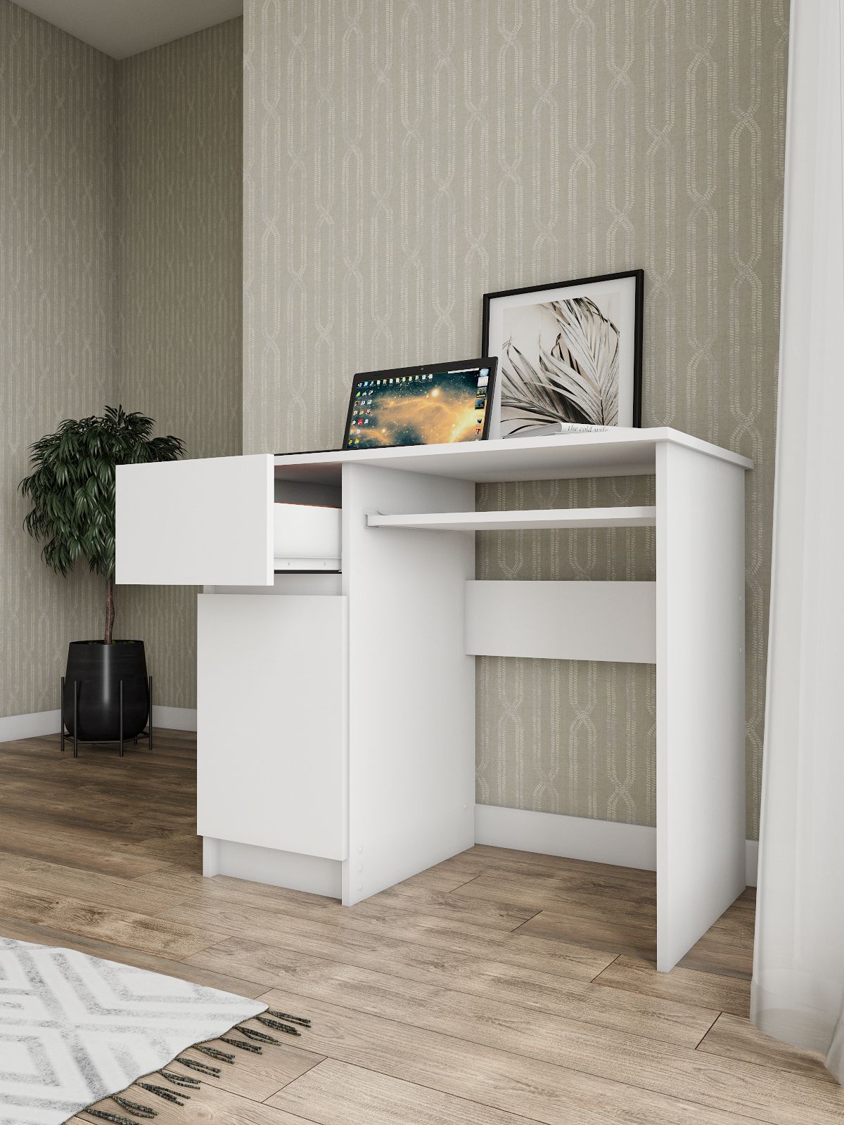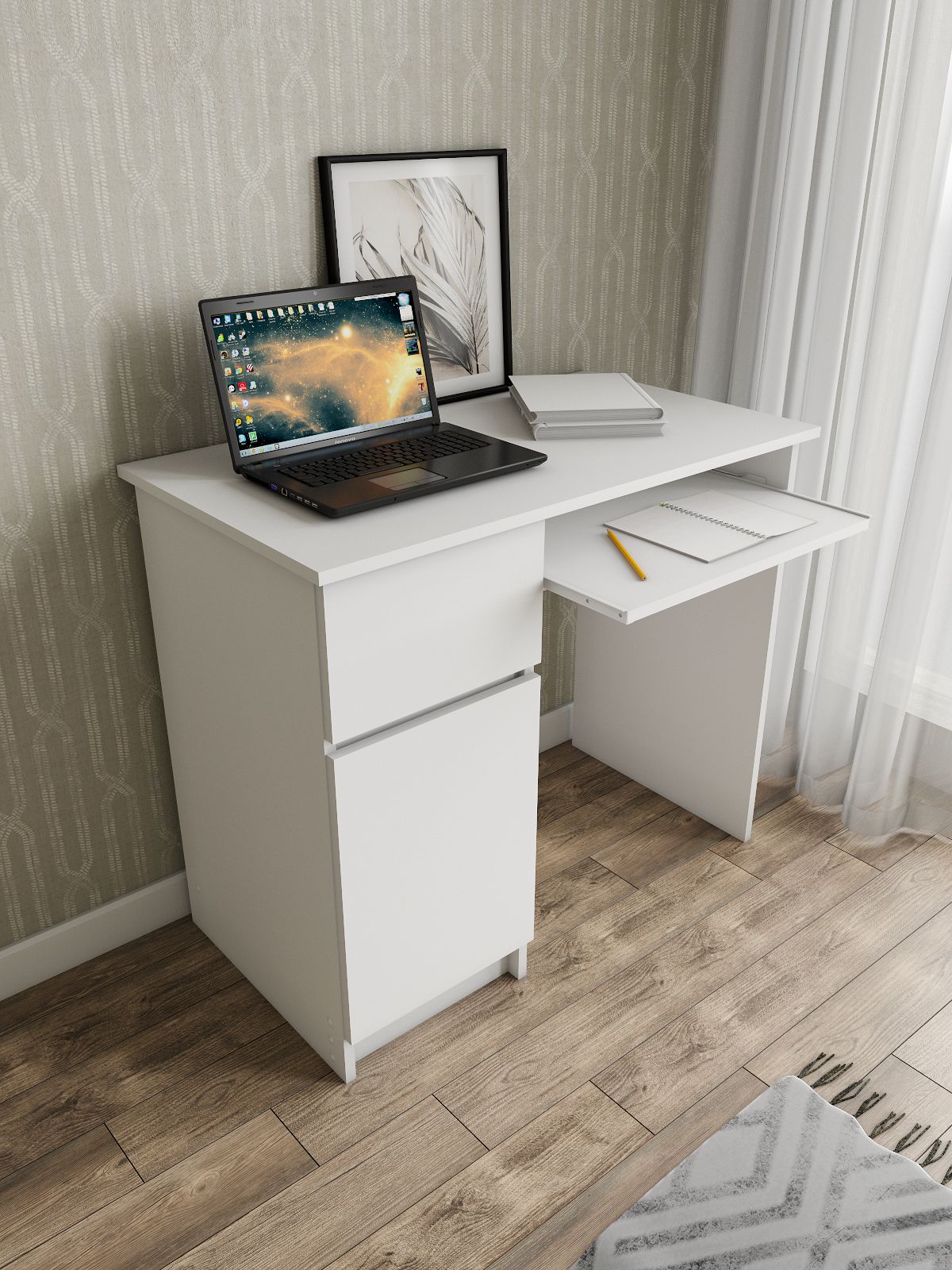 Стол письменный Мори изготовлен из ЛДСП, что обеспечивает долгий срок службы и высокую прочность конструкции. Кроме того, он имеет ящик для хранения необходимых вещей, таких как книги, бумаги и другие принадлежности для учебы.