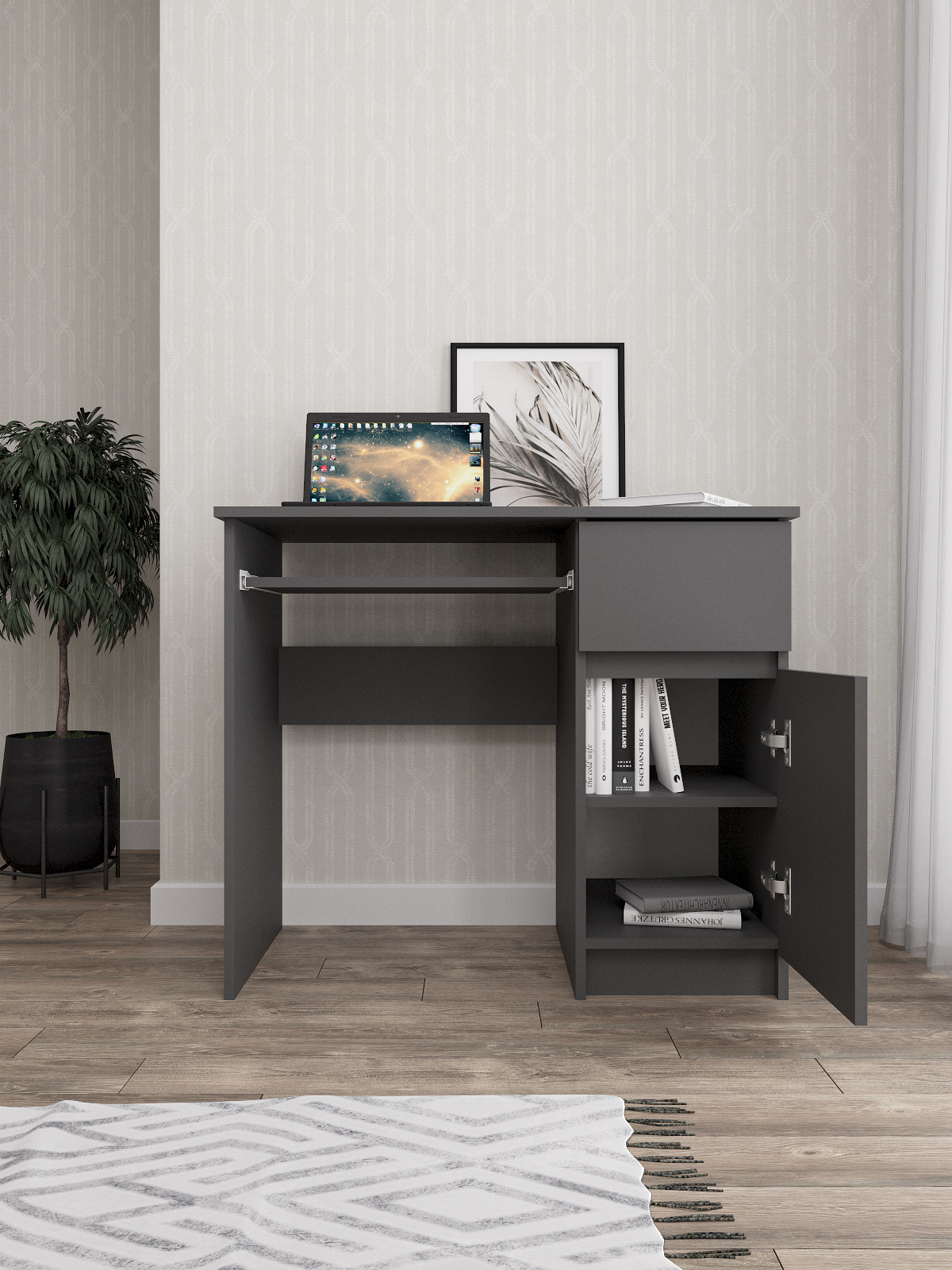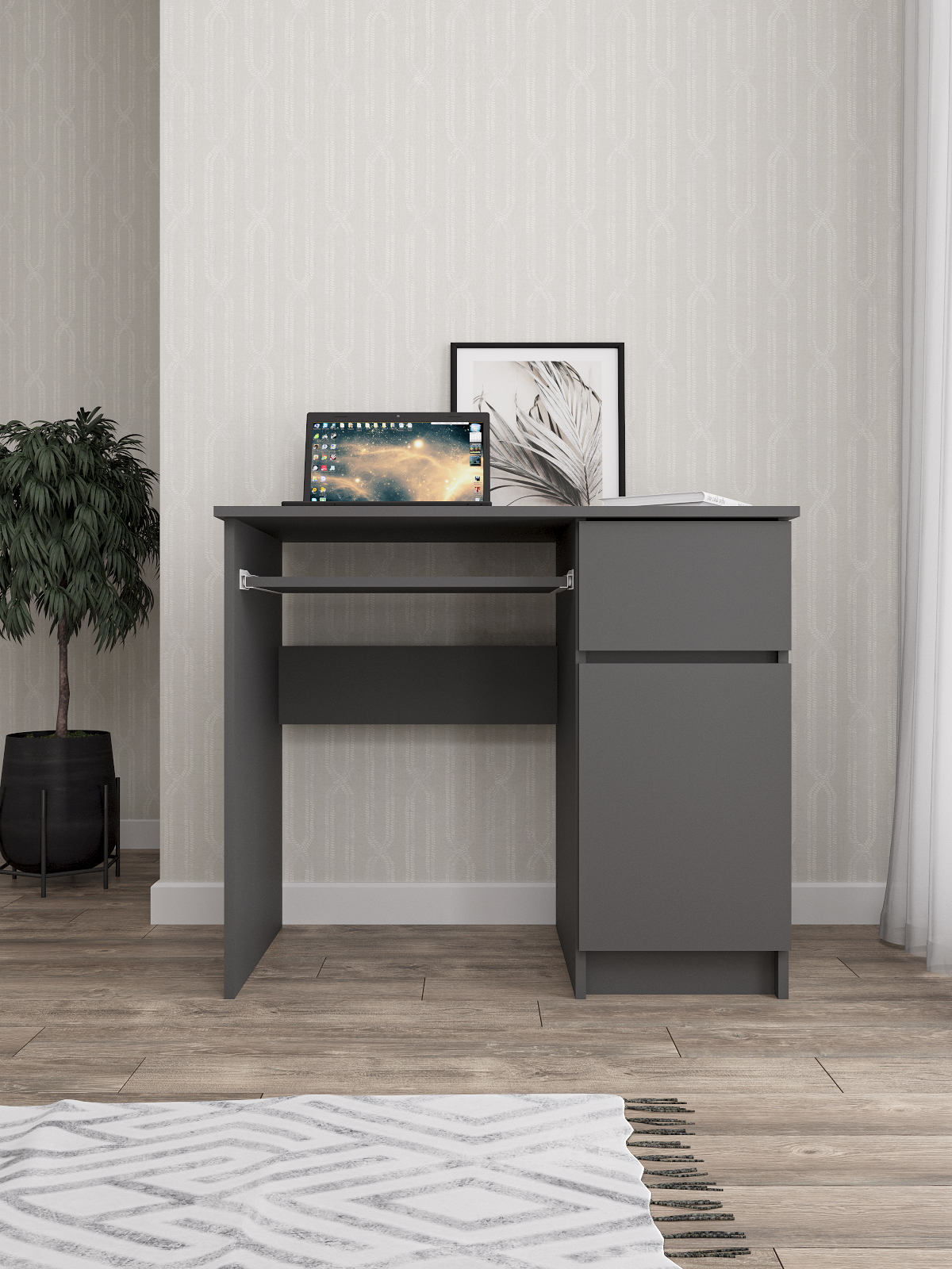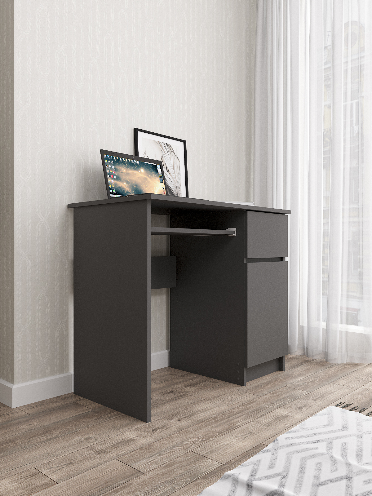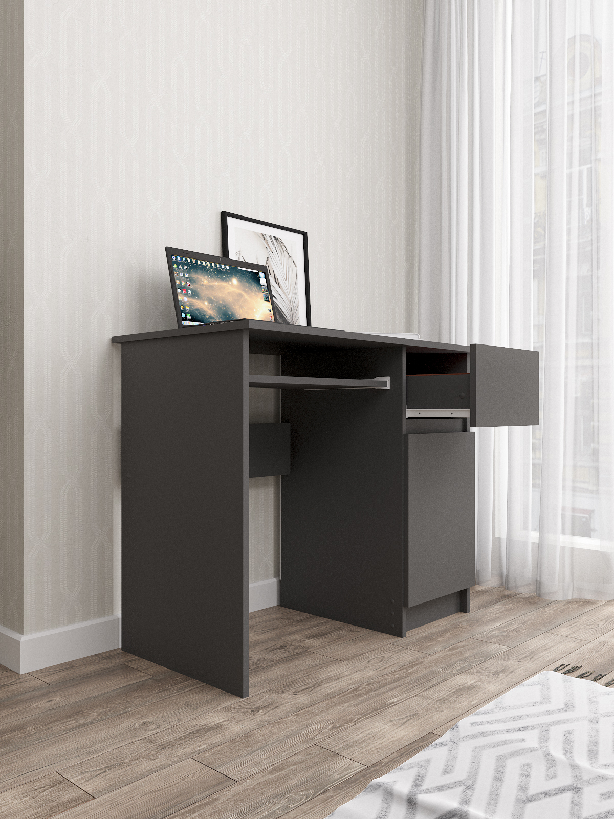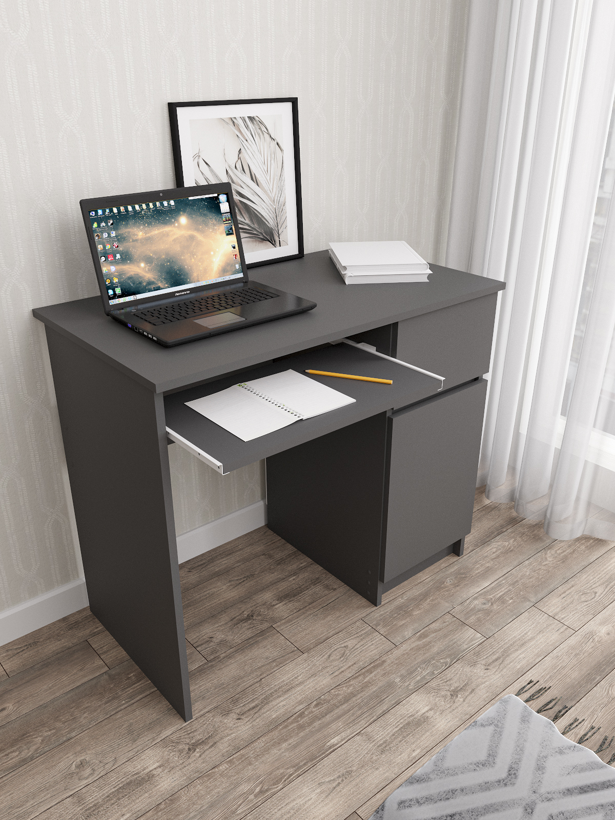 Стол письменный Мори изготовлен из ЛДСП, что обеспечивает долгий срок службы и высокую прочность конструкции. Кроме того, он имеет ящик для хранения необходимых вещей, таких как книги, бумаги и другие принадлежности для учебы.