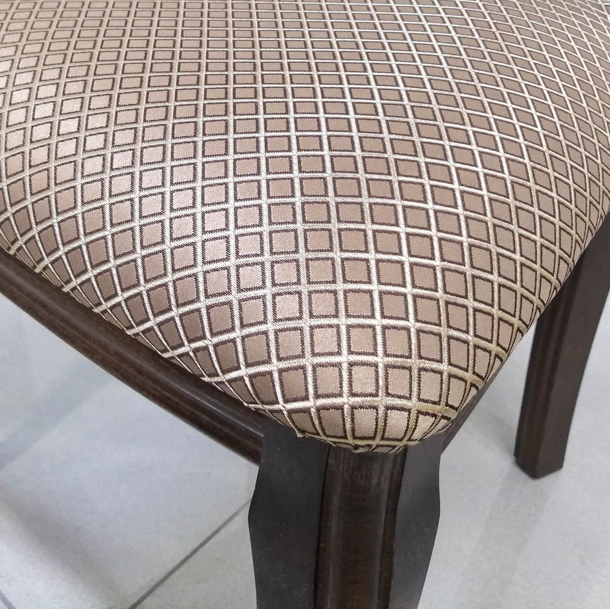 Деревянный стул «Кабриоль», в крашении Тон 7 (Орех темный), в обивке из шенилла Атина 37/1. Материал изготовления каркаса стула: массив березы с окраской различных тонов, в том числе и в сочетании с патиной (искусственно состаренное покрытие дерева). Варианты модели стула предусматривают изготовление из различных тканей: шелка, экокожи и рогожки, а так же с жестким сиденьем.