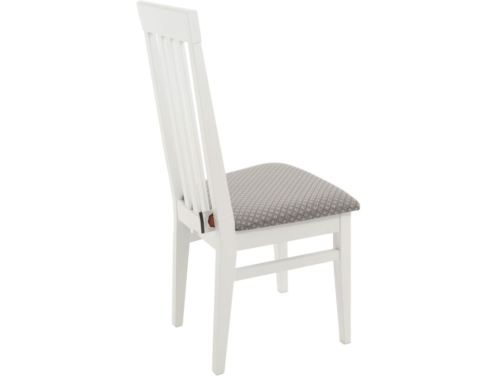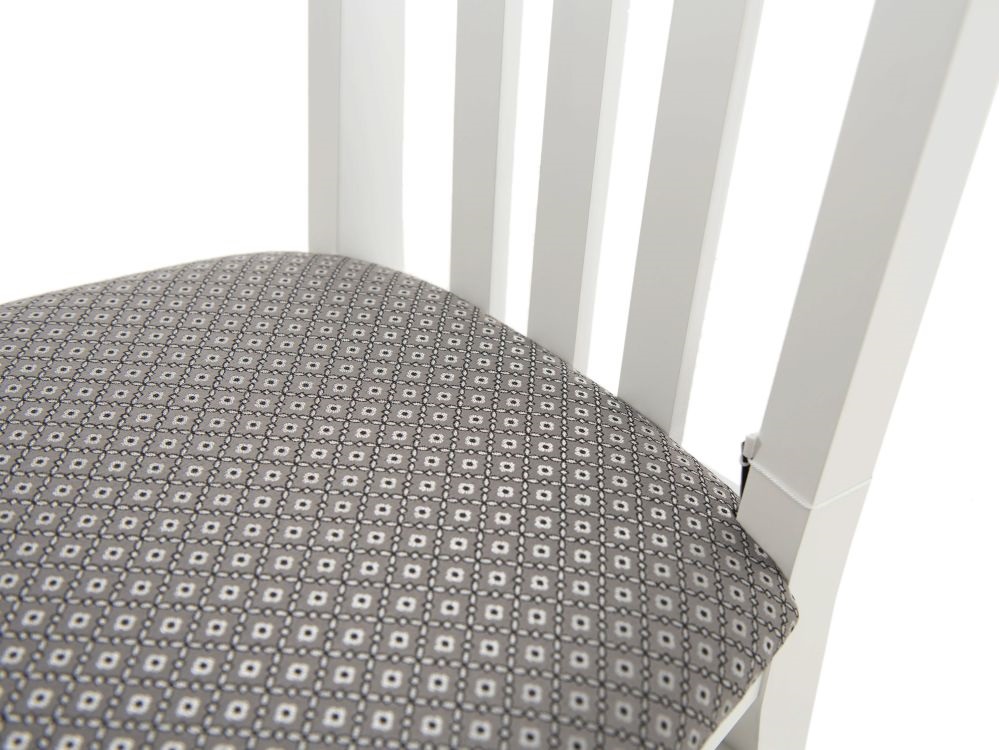 Деревянный стул «Марио» в крашении эмаль белая (Тон 9), обивка в ткани Ажур 149/3. Материал изготовления каркаса стула: массив березы с окраской различных тонов, в том числе и в сочетании с патиной (искусственно состаренное покрытие дерева). Варианты модели стула предусматривают изготовление из различных тканей: шелка, экокожи и рогожки, а так же с жестким сиденьем.