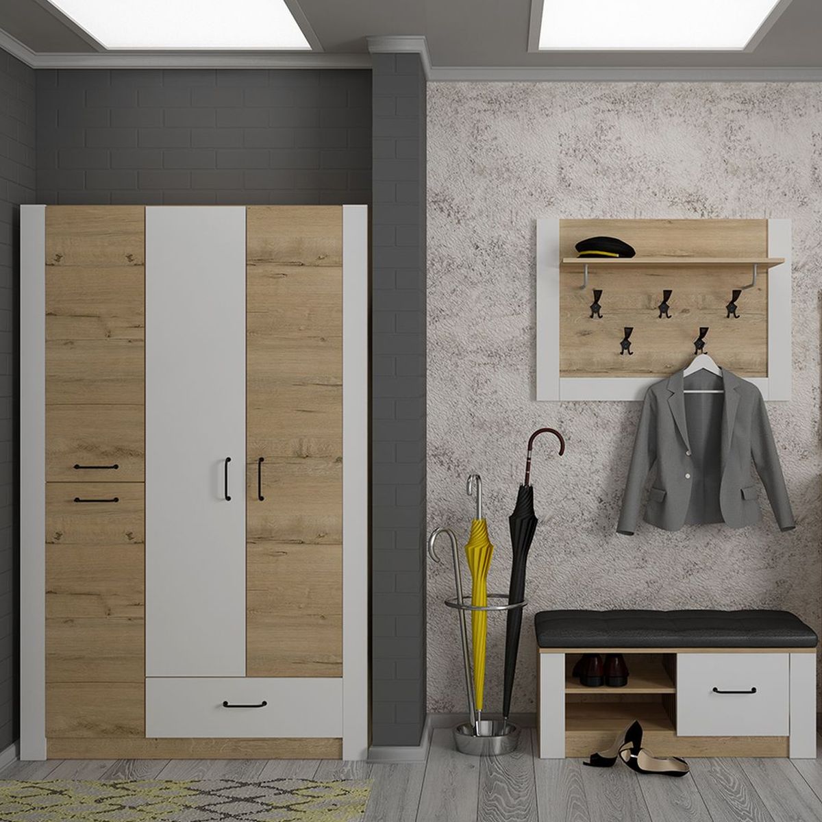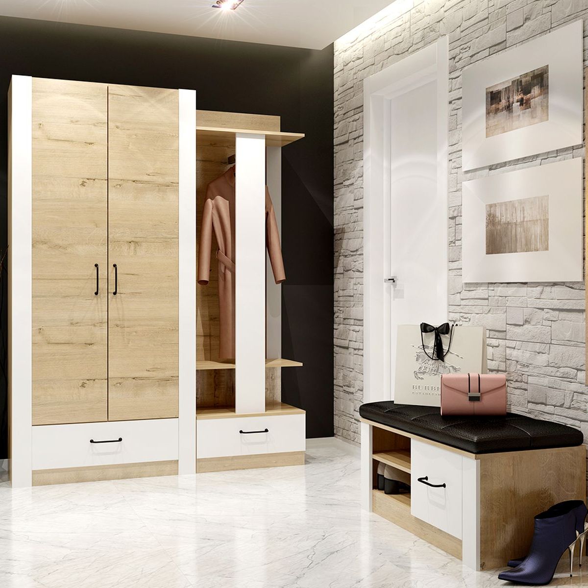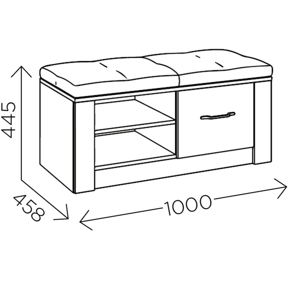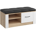 Тумба для обуви с мягким сиденьем «Ева 5» М5 - изготовлена из древесных плит, где каркас выполнен из ЛДСП, а фасады из МДФ, облицованных пленкой ПВХ. Тумба в прихожую имеет, как закрытые полки, так и открытые. Металлические ручки лицевой фурнитуры имеют черный матовый цвет. Белые матовые фасады в сочетании со светлым деревом визуально расширяют пространство. На лицевых торцах деталей долговечная кромка толщиной 2мм.