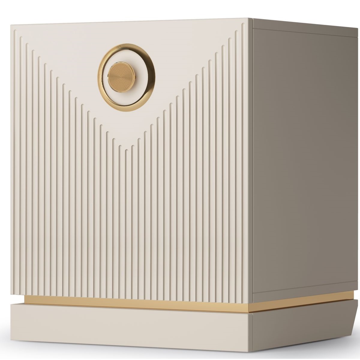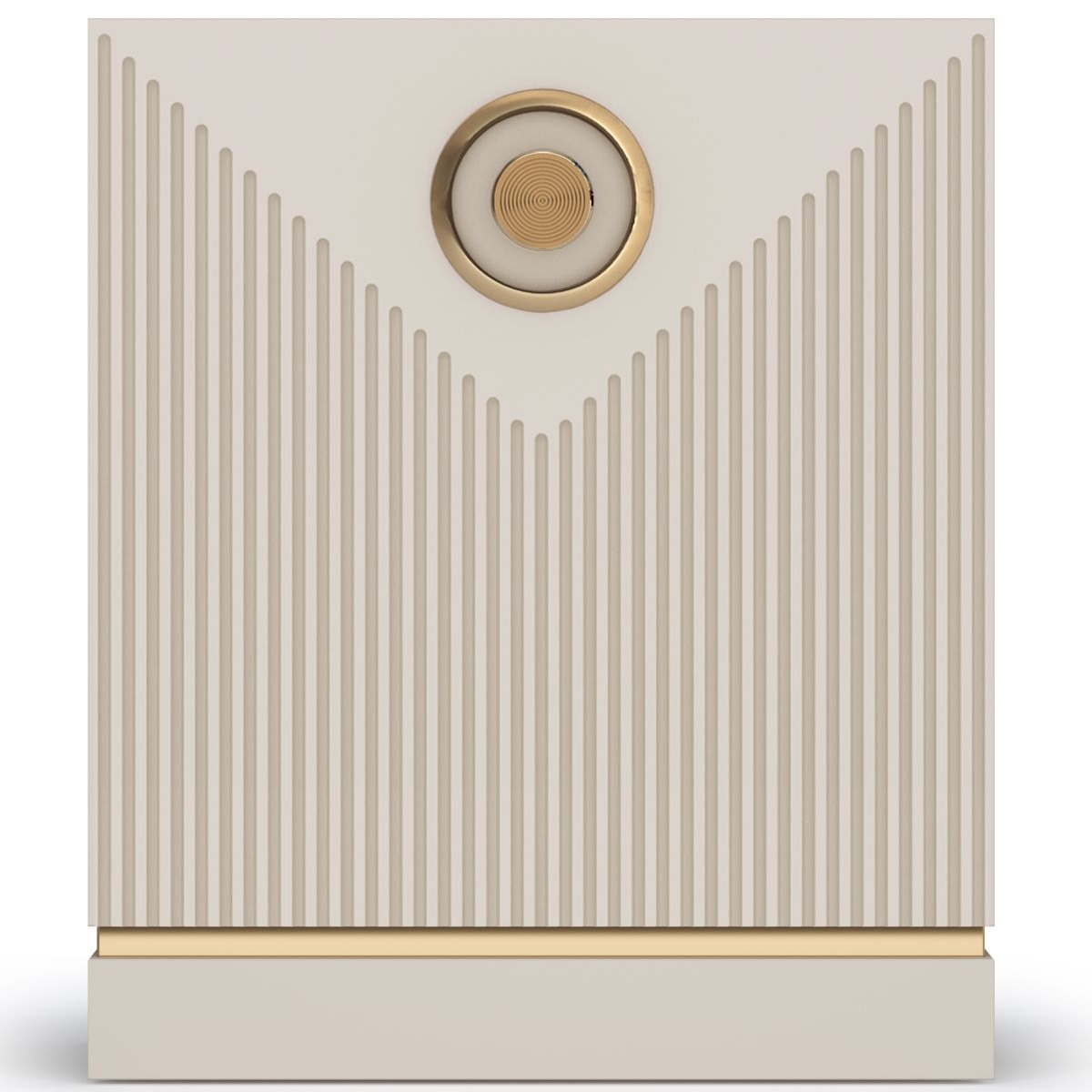 Прикроватная тумба Капри выполнена из ЛДСП и МДФ нежного оттенка сатин, при этом фасады МДФ оформлены красивой фрезеровкой в виде параллельных линий. Покрытие фасадов – финиш пленка ПВХ с очень приятной на ощупь поверхностью софт тач. Яркая металлическая ручка в цвете золото красуется на фасаде и завершает нежный образ мебели и подчеркивая принадлежность к стилю модерн.