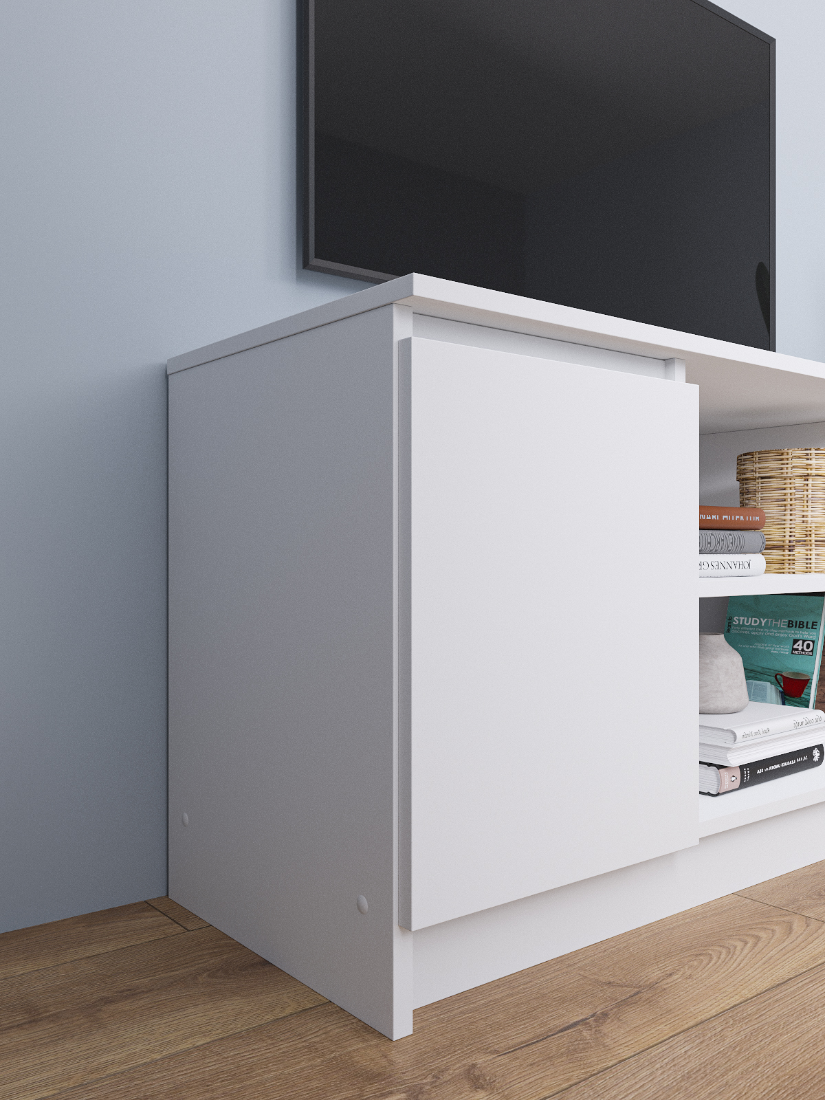 Тумба под телевизор Мори имеет универсальную ориентацию, что позволяет установить ее в любом помещении. Она может использоваться как на даче, так и в доме.