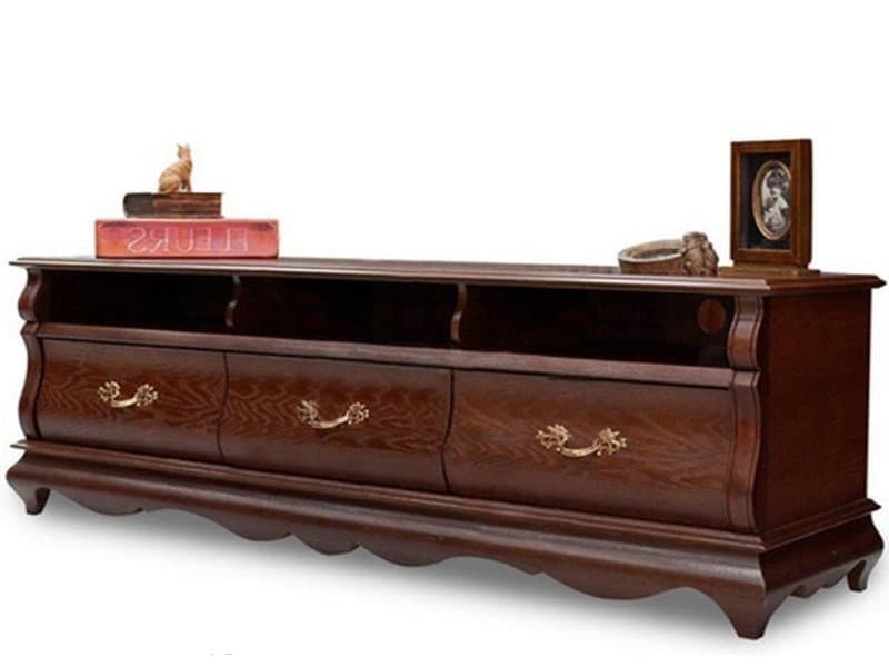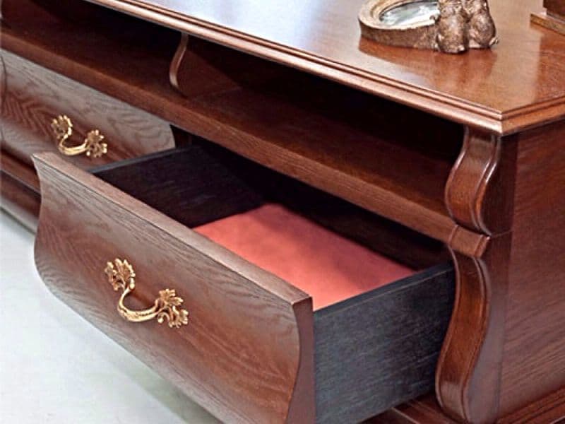 Модель может быть изготовлена в двух цветах – темный орех и белый с патиной. Украшает изделие резные детали и изящные ручки. Крепкий каркас из массива дуба, широкая столешница позволяют поставить на тумбу:
