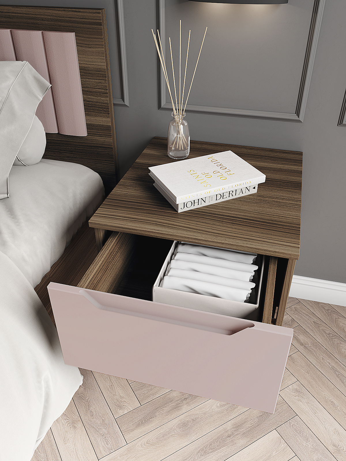 Тумба прикроватная «Роза» — это элемент модульной системы, предназначенный для установки рядом с кроватью в спальне. Тумба прикроватная имеет подвесное крепление и скрытую фурнитуру, что позволяет сохранить эстетический вид комнаты.