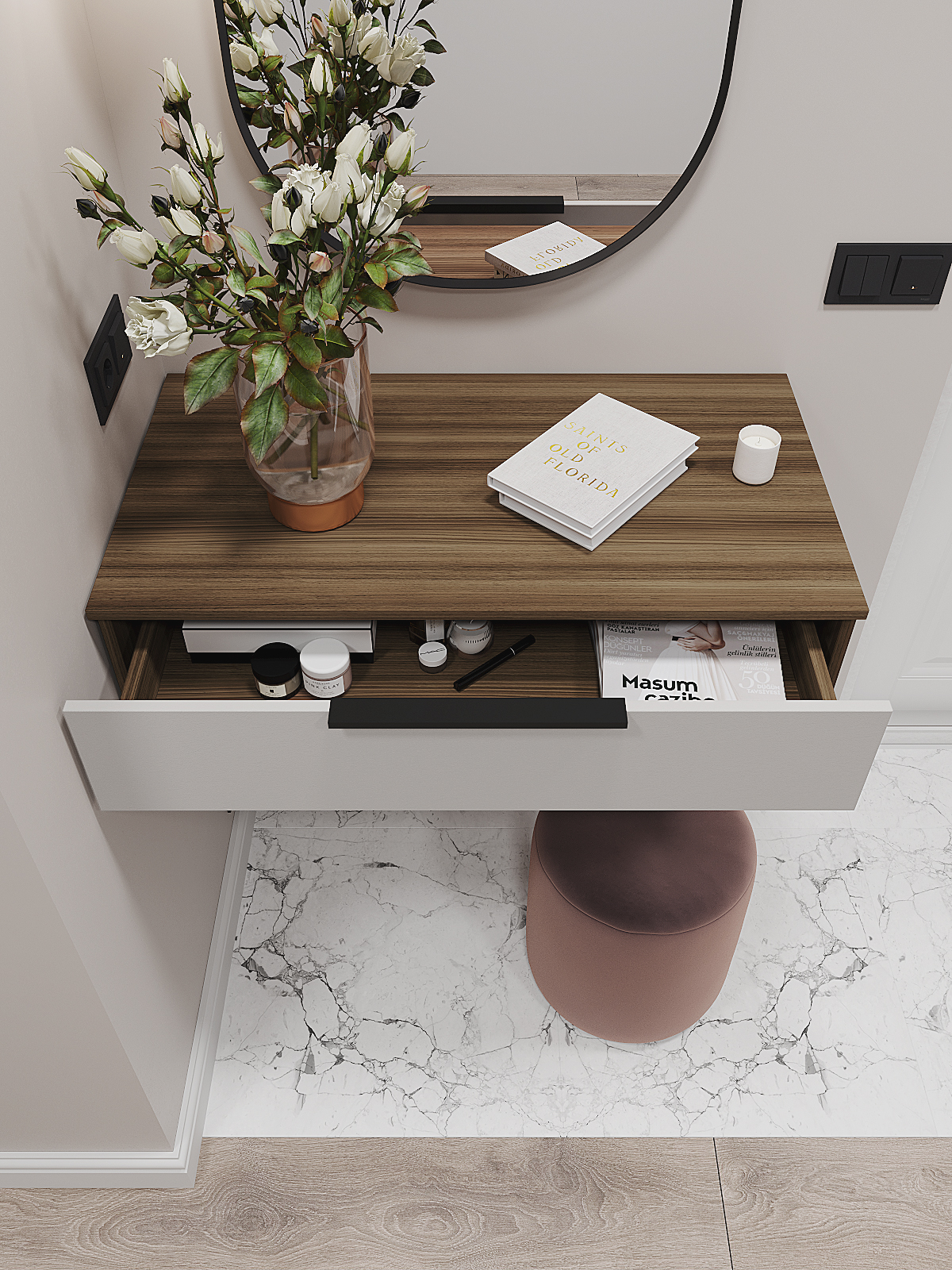 Подвесная тумба «Роза» может использоваться в качестве туалетного столика, где можно хранить косметику, лекарства и другие необходимые мелочи. Кроме того, благодаря своему компактному размеру, тумбу можно использовать в качестве ТВ-тумбы или как стеллаж для книг и декоративных предметов. Богатый выбор оттенков дает возможность выбрать модуль в соответствии с любым интерьером и создать уютную и стильную обстановку в комнате.
