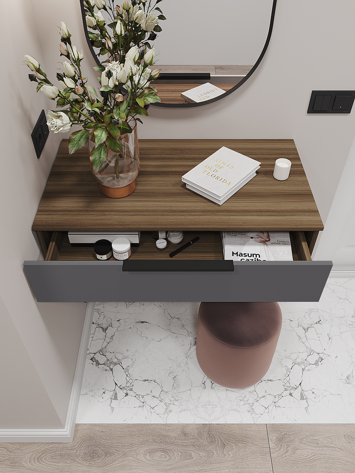 Подвесная тумба «Роза» может использоваться в качестве туалетного столика, где можно хранить косметику, лекарства и другие необходимые мелочи. Кроме того, благодаря своему компактному размеру, тумбу можно использовать в качестве ТВ-тумбы или как стеллаж для книг и декоративных предметов. Богатый выбор оттенков дает возможность выбрать модуль в соответствии с любым интерьером и создать уютную и стильную обстановку в комнате.
