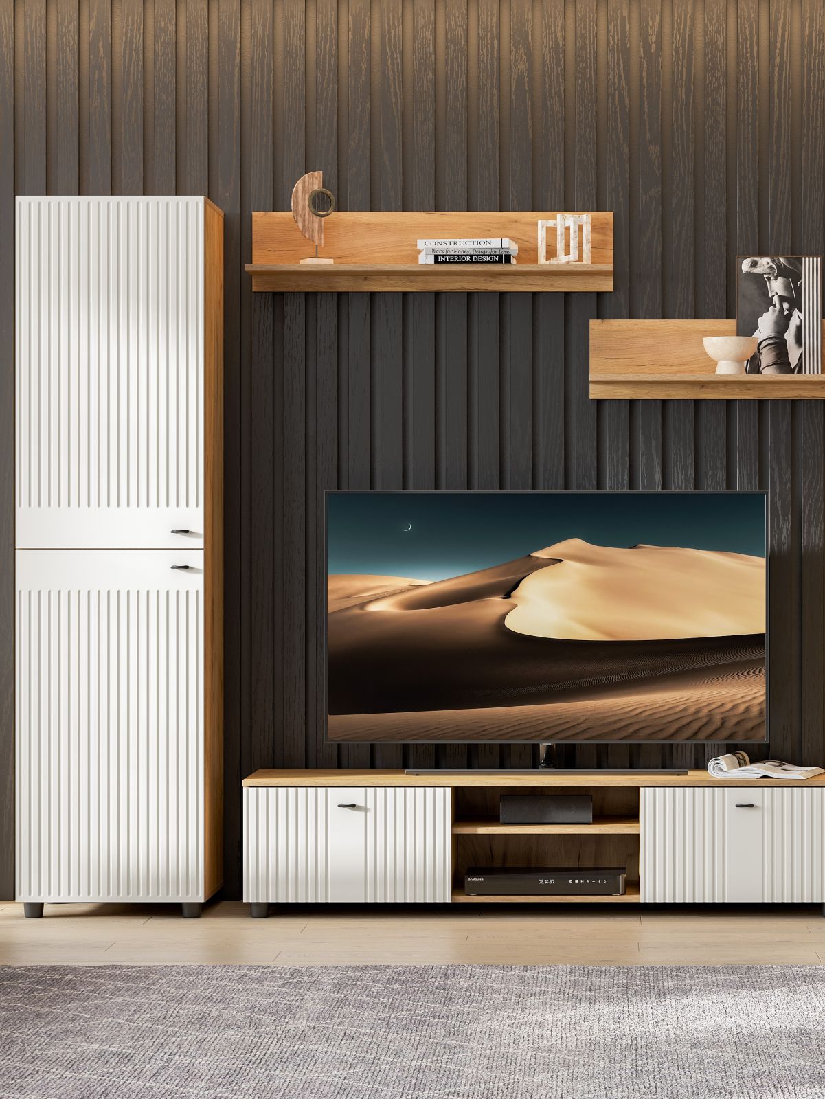 Тумба под телевизор с нишей Милан представляет собой изысканное сочетание современного дизайна и практичного комфорта. ТВ тумба доступна в двух исполнениях, каждое из которых создано для создания неповторимой атмосферы в вашем интерьере. Дуб золотой + белый матовый и Дуб золотой + Олива – современное решение для тех, кто ценит стильные контрасты. Сочетание золотого дуба с благородным бело-матовым оттенком создает свежий и актуальный образ, прекрасно вписывающийся в современные интерьеры.