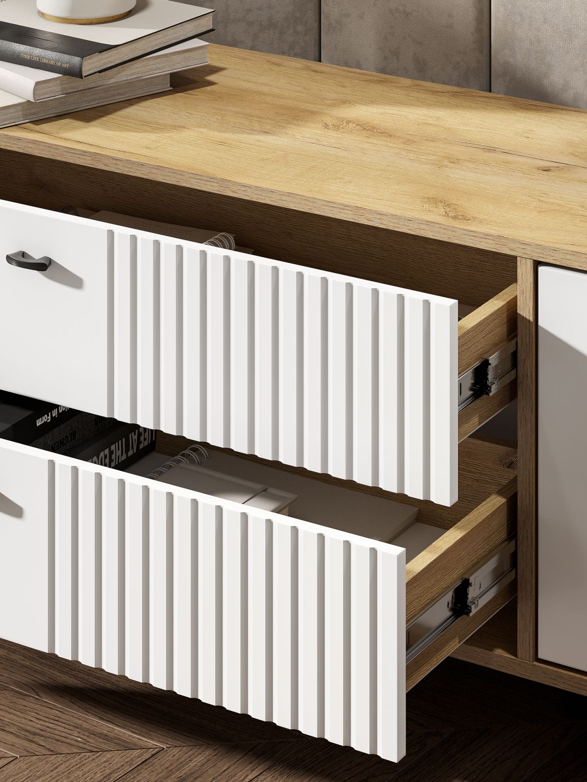 Материалы и конструкция МДФ фасады с изящной фрезеровкой придают тубе особый шарм и индивидуальность. Корпус из ЛДСП обеспечивает прочность и долговечность конструкции. Изящные ножки добавляют тумбе с ящиками легкости и визуально расширяют пространство.