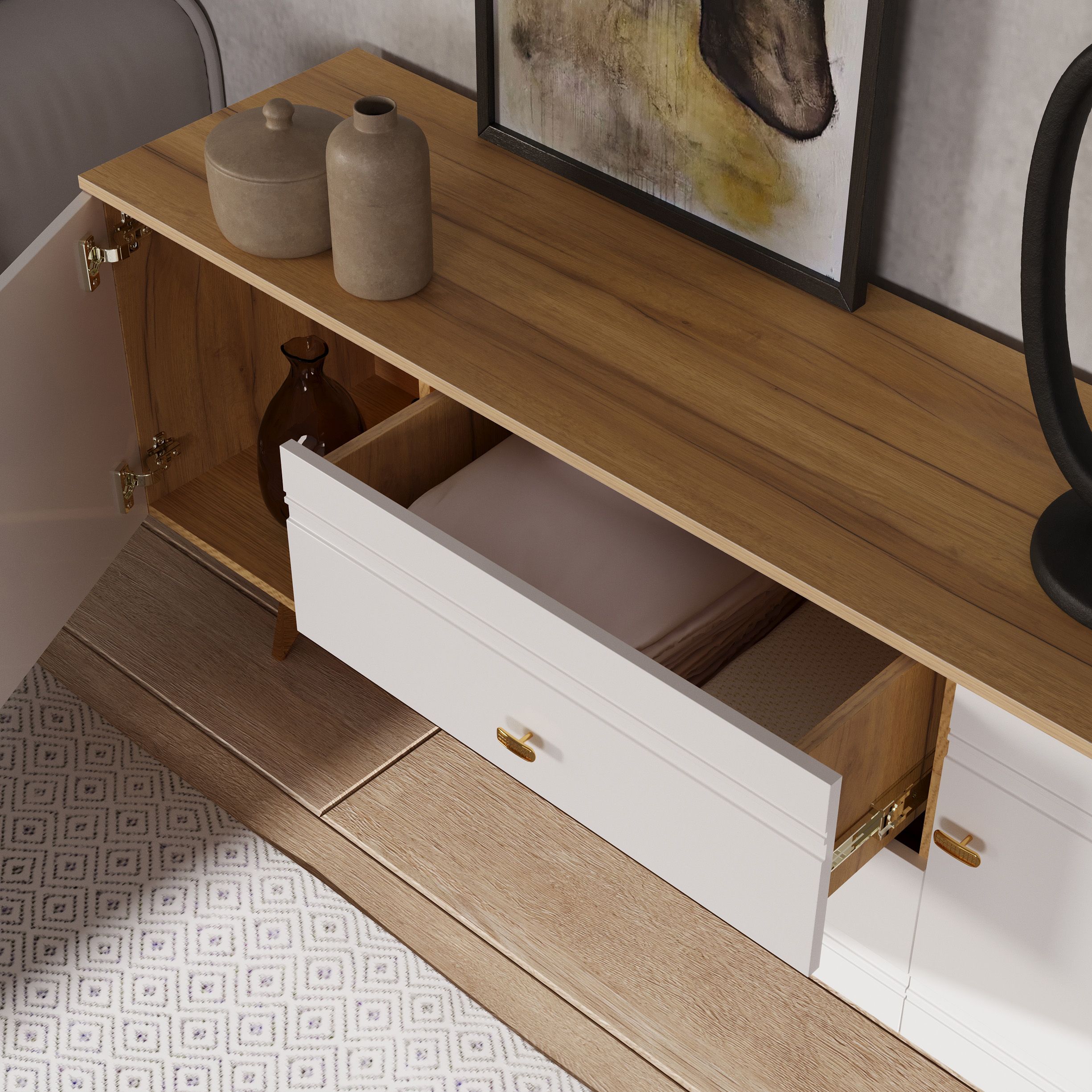 Тумба под ТВ «Вега Сапфир» обладает рядом достоинств: - благодаря своей конструкции — наличие ящиков, отдела с распашной дверцей, а также открытых ниш — тумба вмещает массу полезных мелочей. - тумба под ТВ — это широкая модель для установки телевизора большого размера, при этом ее высота 618 мм является оптимальной для просмотра телевизора на уровне глаз. - высококачественные материалы, применяемые в производстве мебели — гарантия безопасной службы в вашем доме; - надежная фурнитура продлит срок службы мебели, выдвижные ящики оснащены качественными шариковыми направляющими, а петли дверцы с доводчиком обеспечивают бесшумное закрытие; - высокие ножки подчеркивают причастность к стилю и облегчают уборку.
